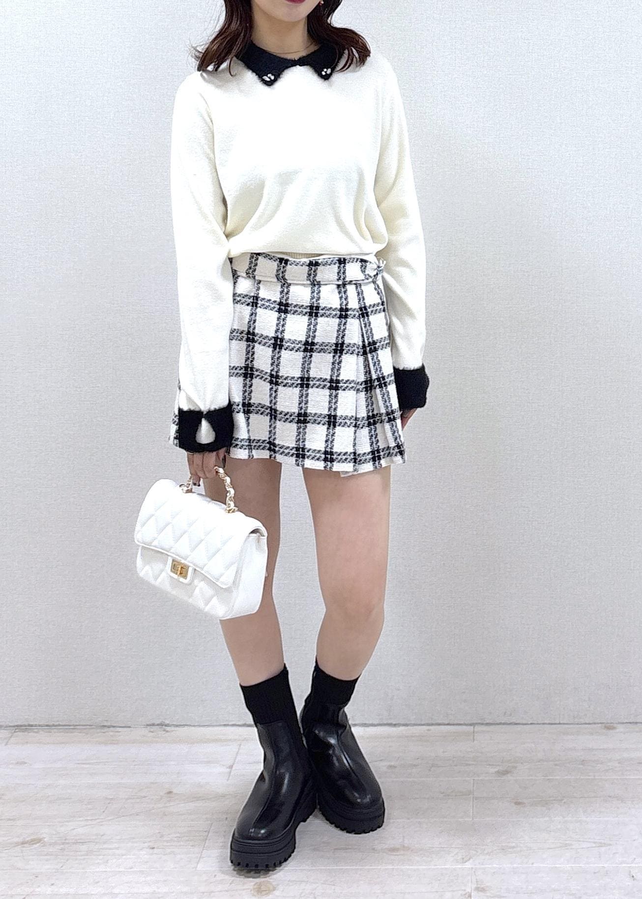 VISビジュー付きシャギーカラーニットトップスホワイト / F¥5,489レビュー襟のビジューが高みえし、ボトムス次第で可愛らしい印象にも大人っぽい印象にも様変わりします。