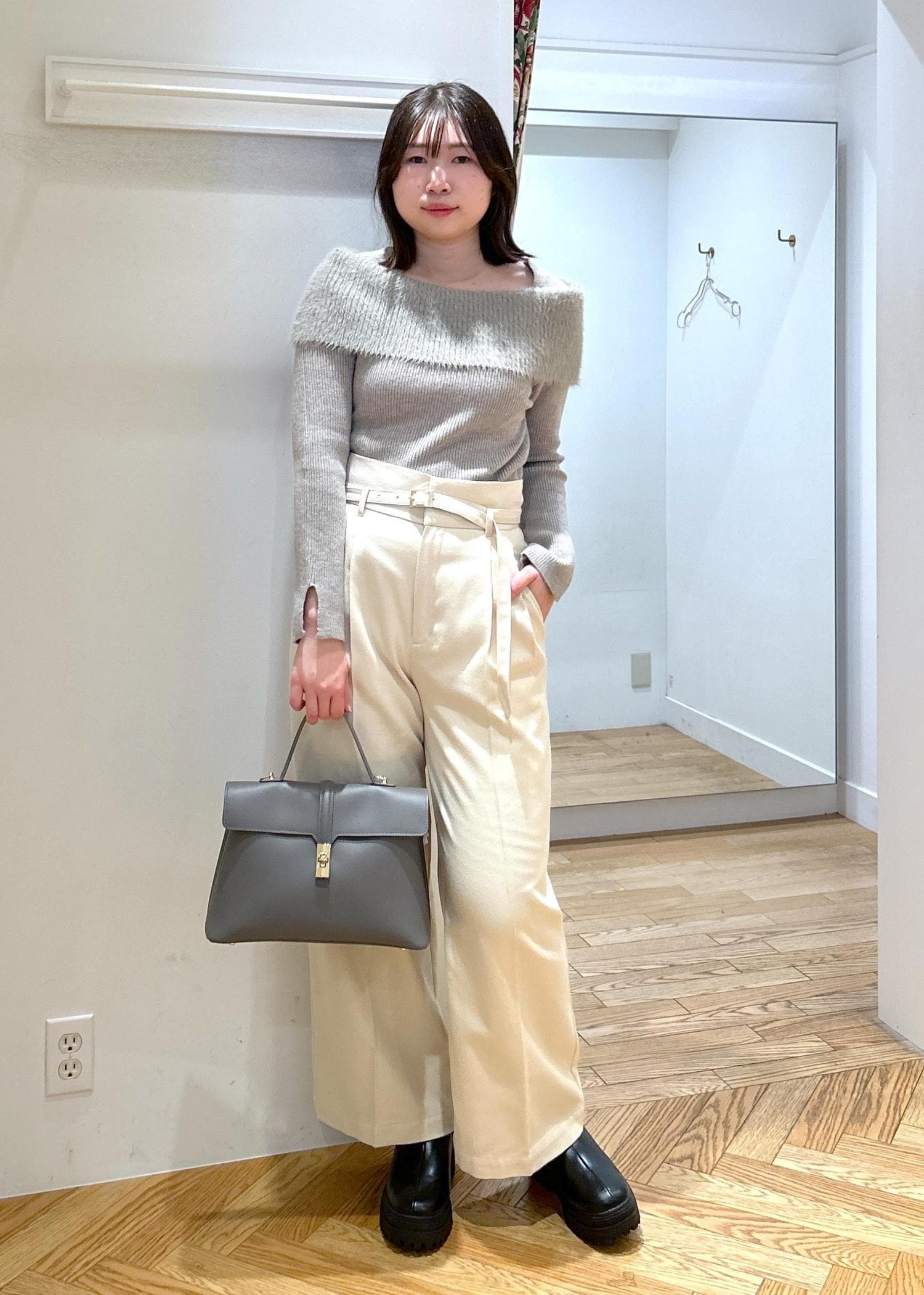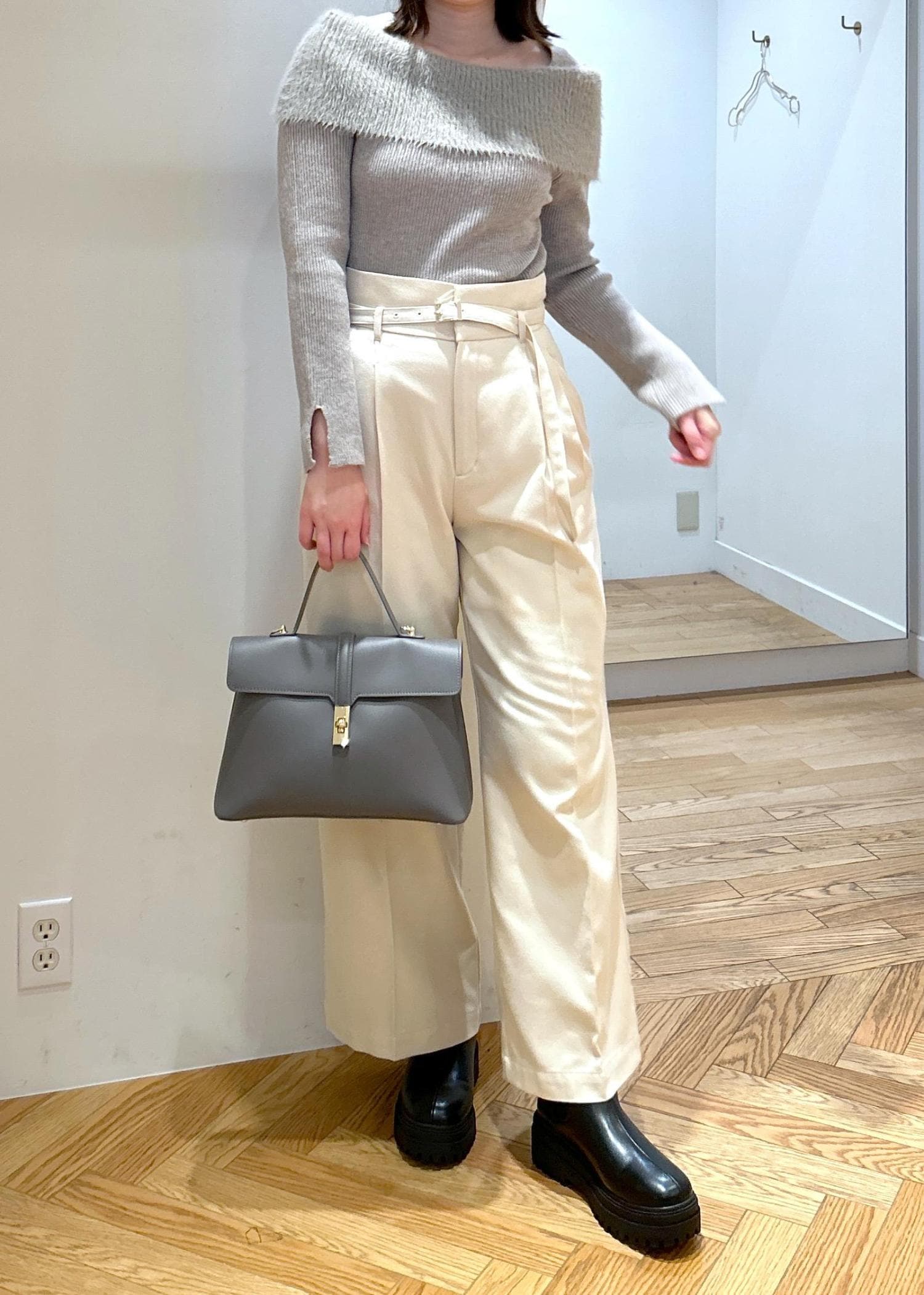 オフショルニットにハイウエストのパンツを合わせたスタイルアップコーデです!
