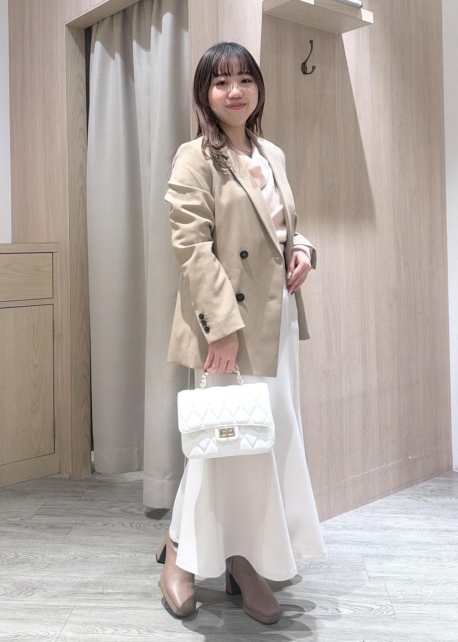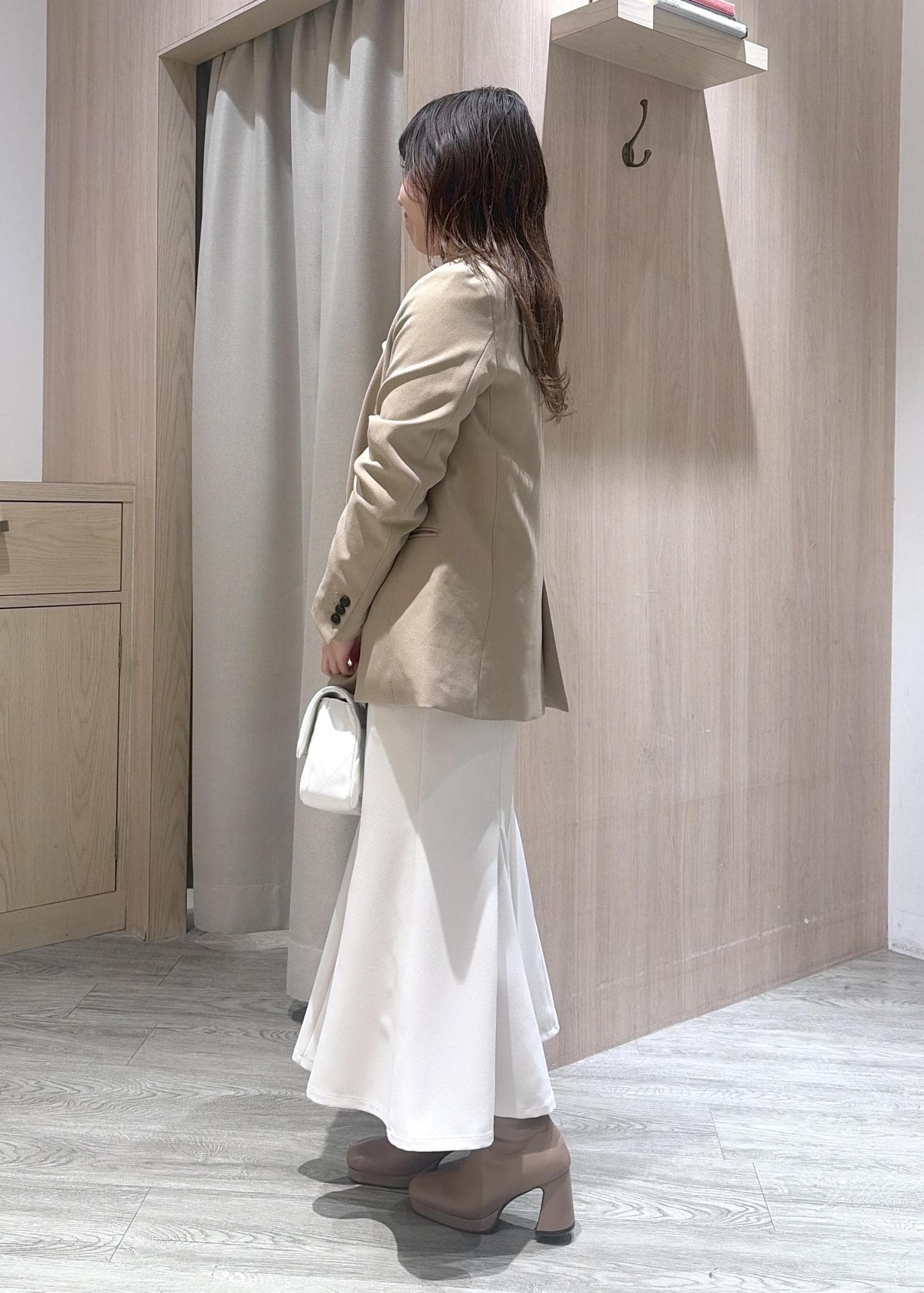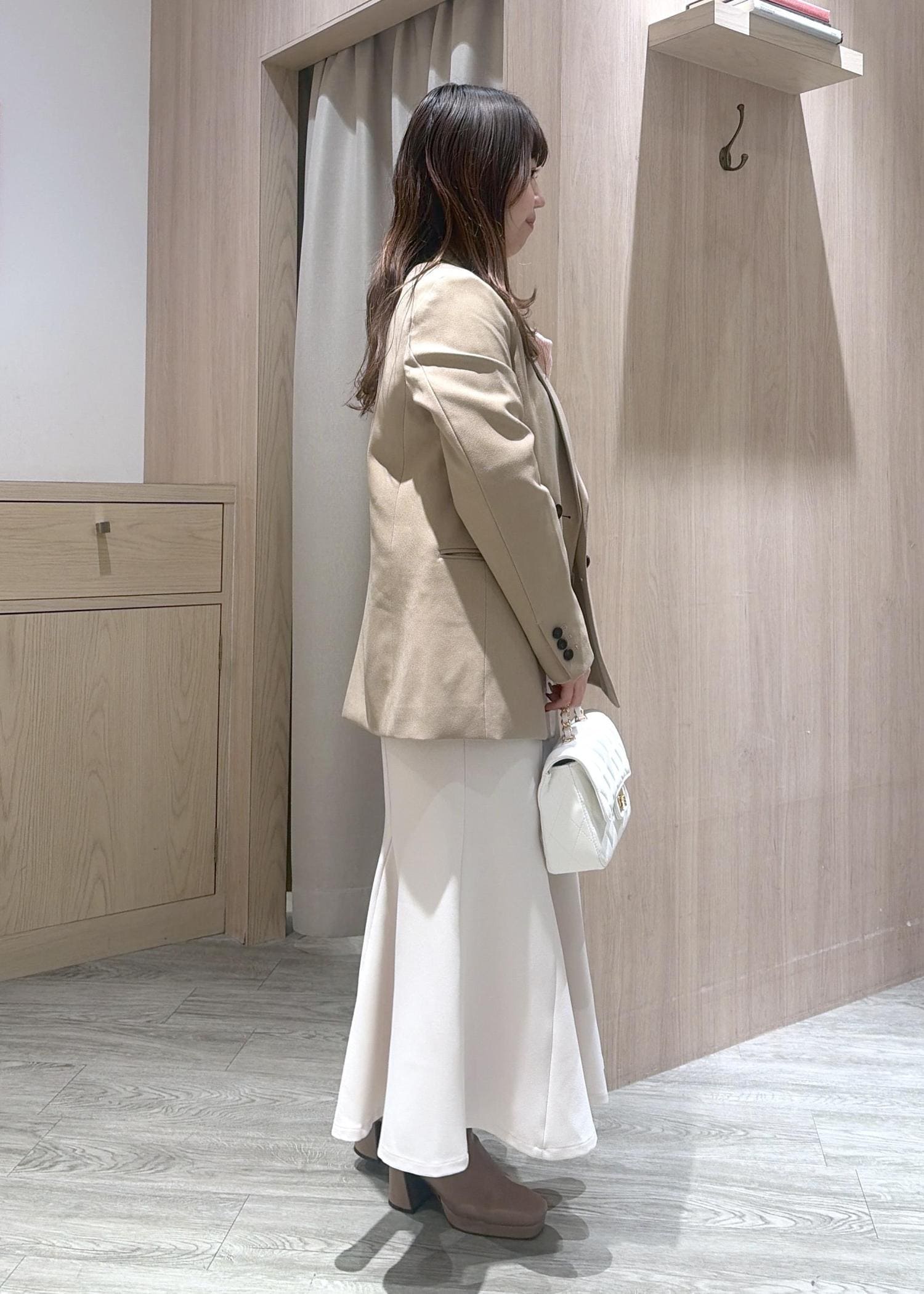 ジャケットとスカートのセットアップで着るとカラー違いでもまとまりのあるコーデになります♪