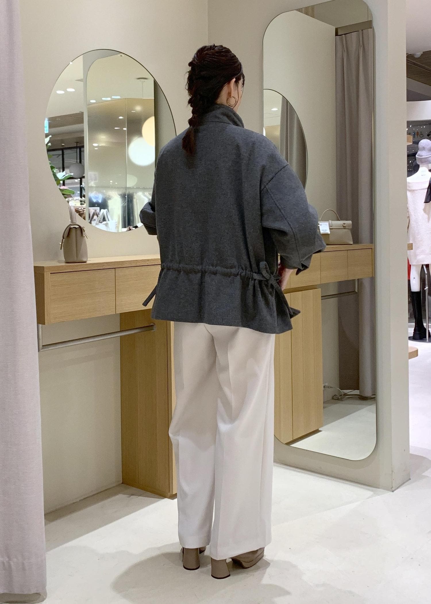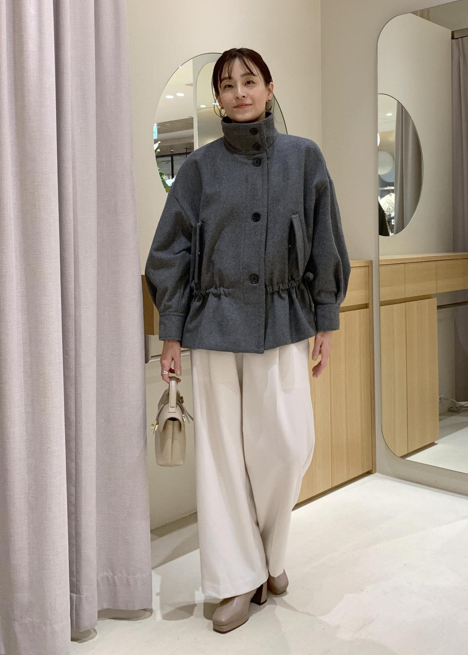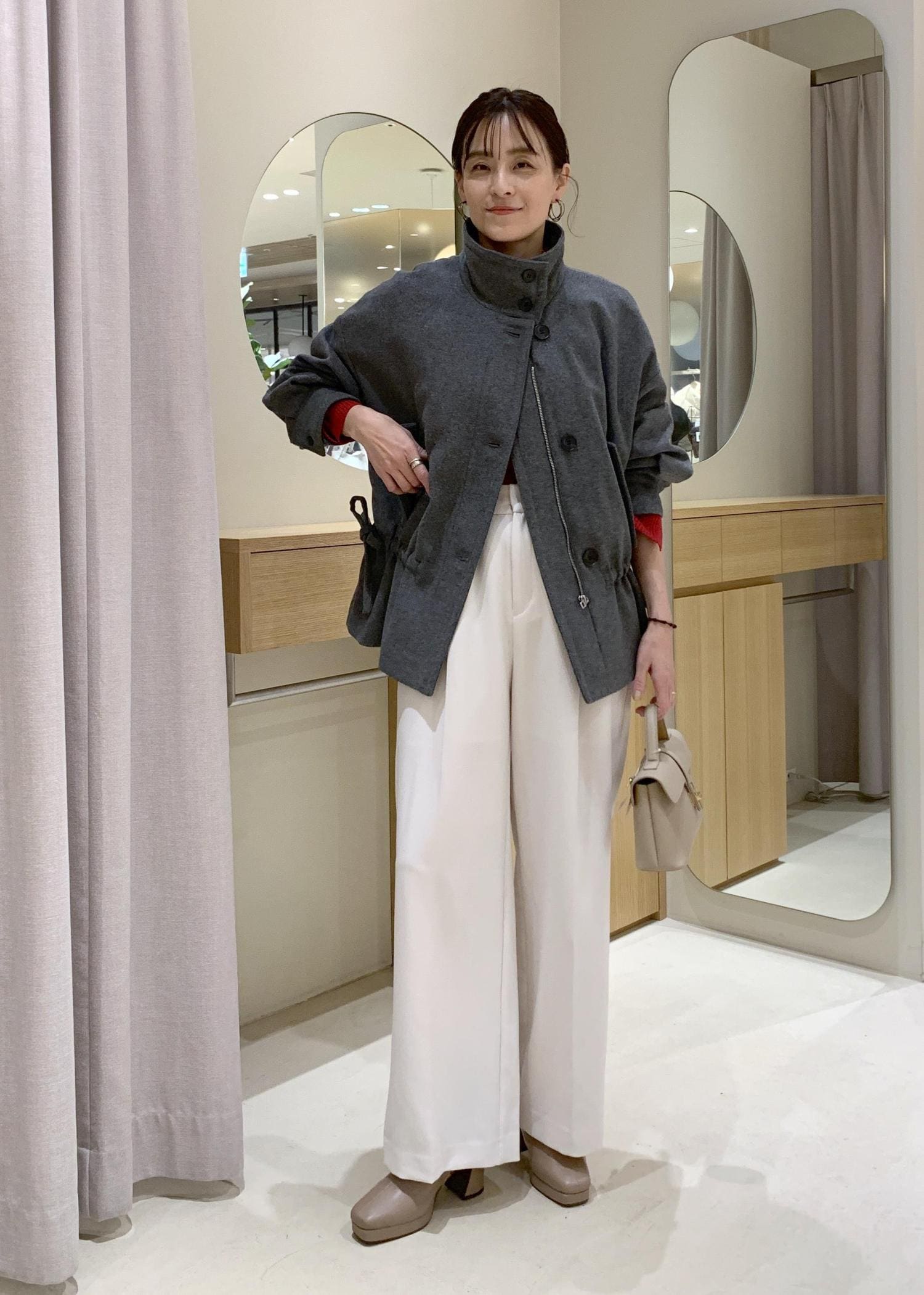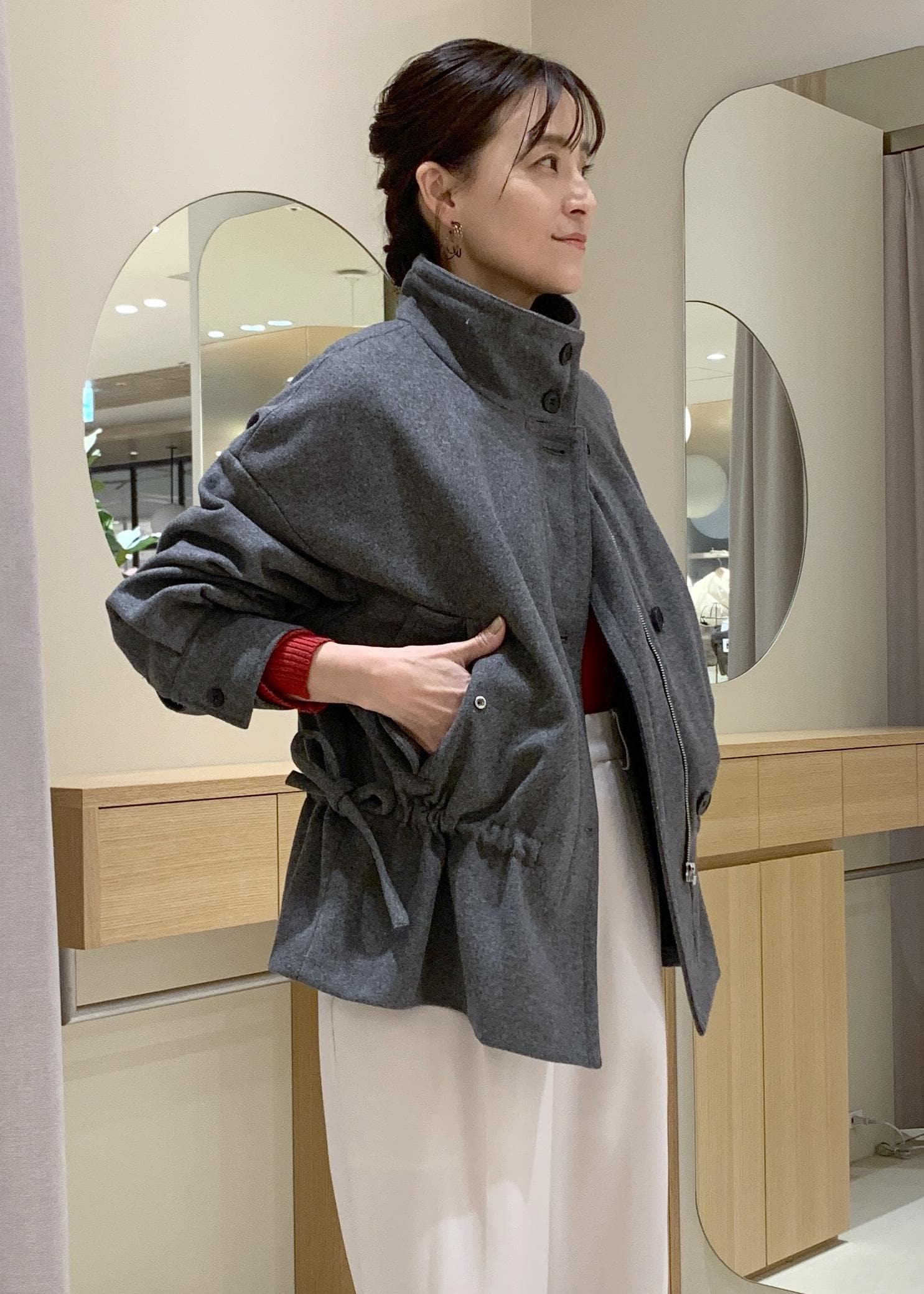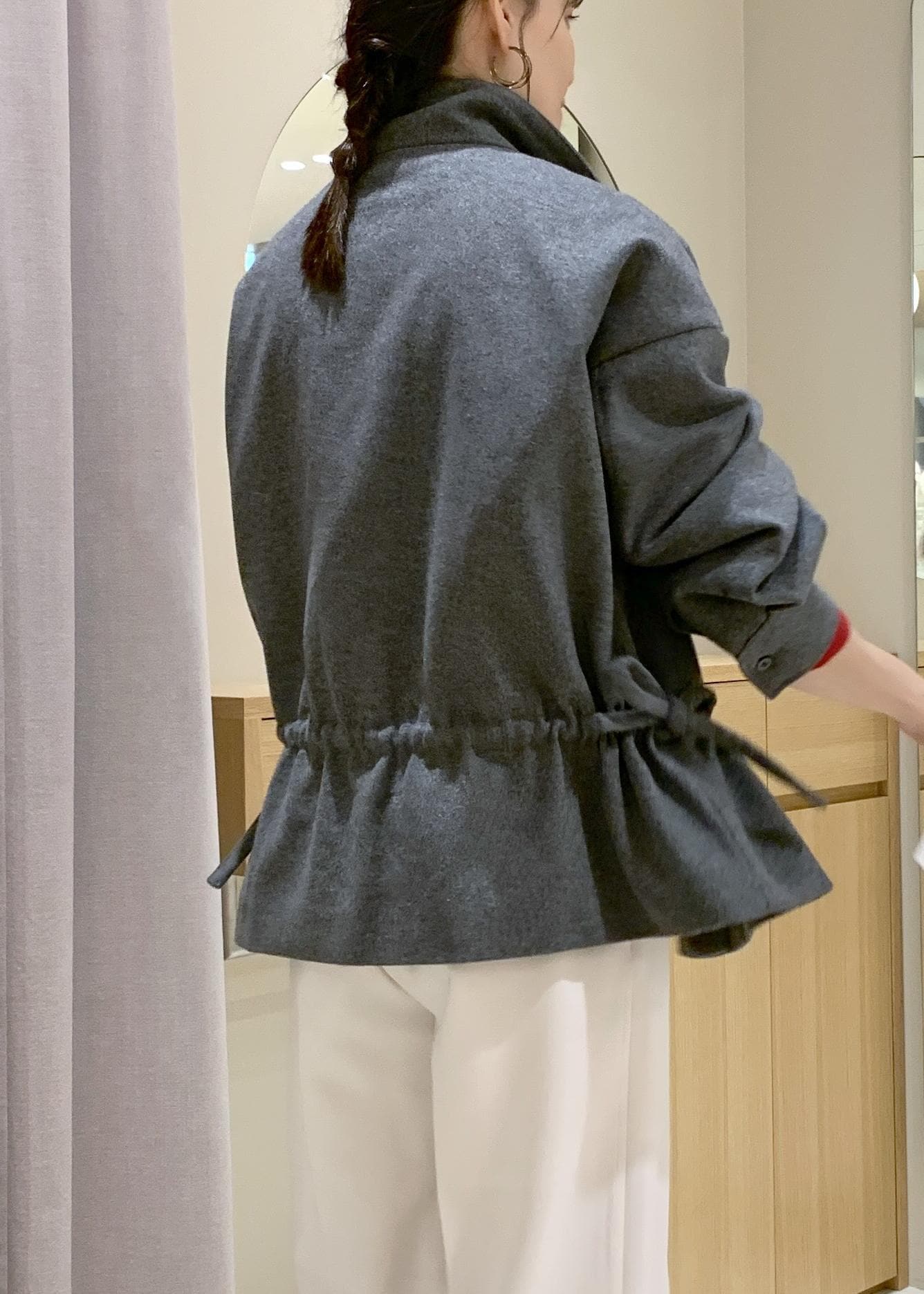 VISドロストペプラムブルゾングレー / F¥11,264レビュー2連ですが、華奢見えなのでさりげなく取り入れられますよ。軽さと長さもあるので、秋はニットの上からでも付けやすくなりますよ。