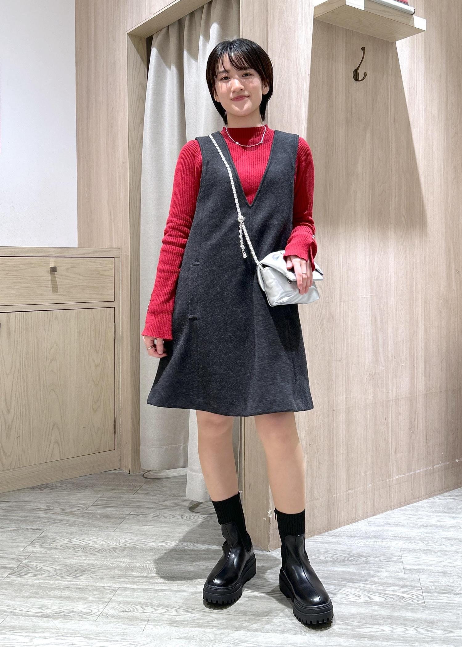VISシャギーVネックミニ丈ジャンパースカートチャコール / F¥7,909レビュー身長155cm、膝上の丈感です。
