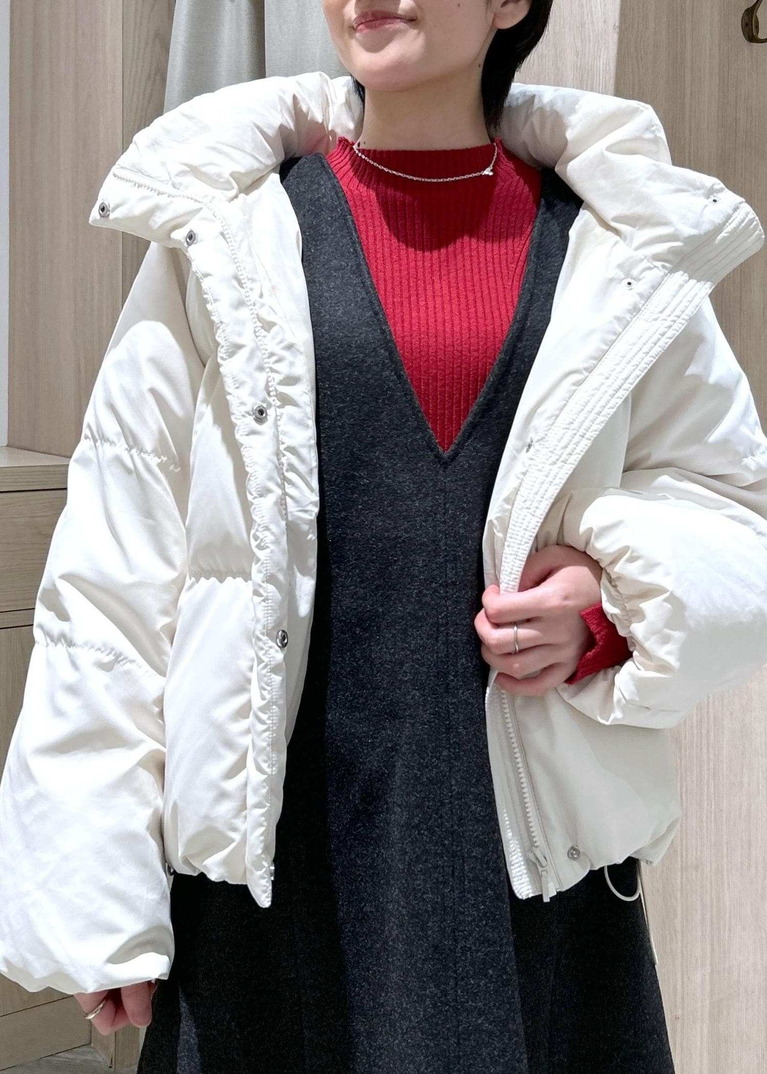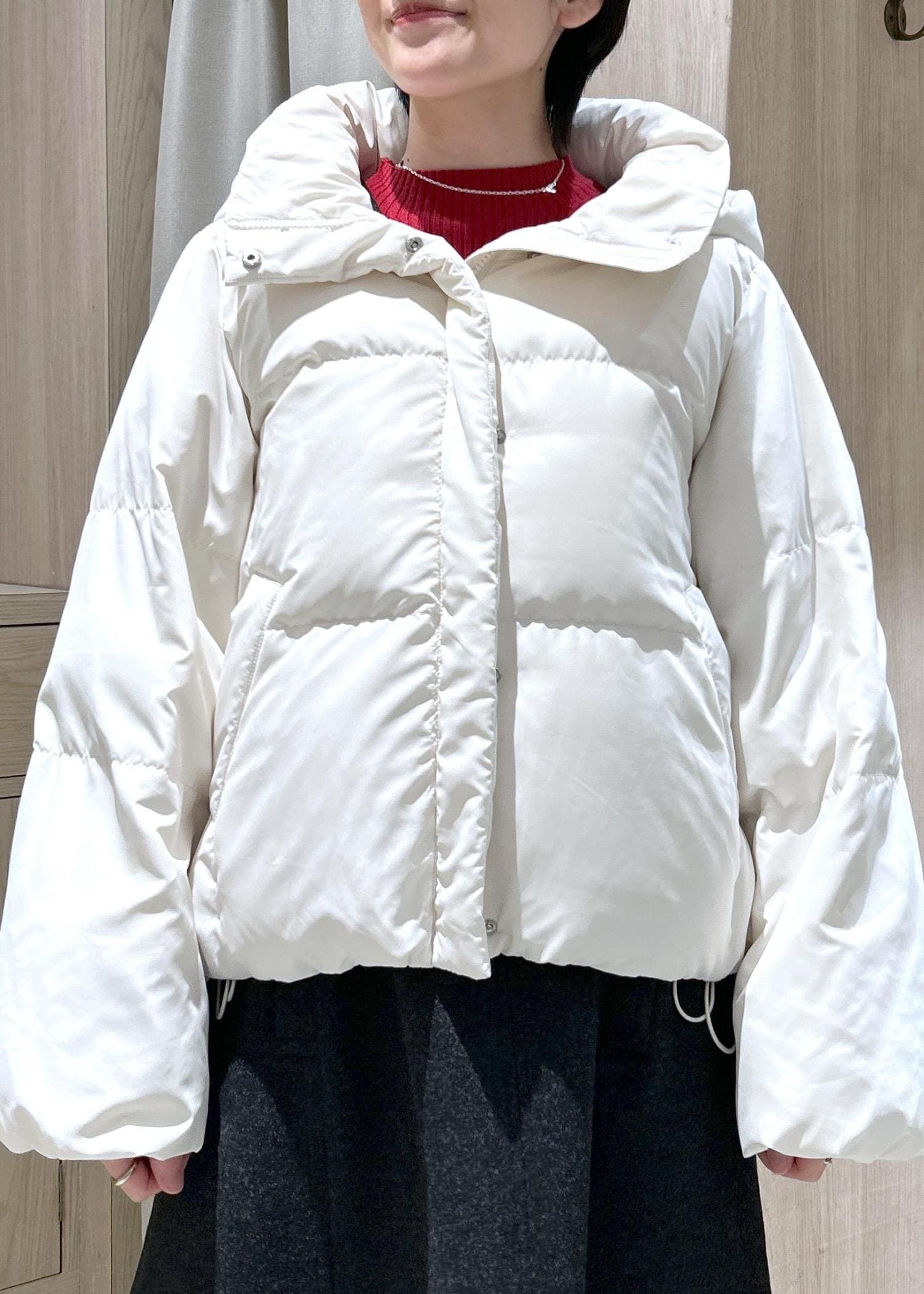 軽い着心地でファスナーを全て閉めてもボリュームが出過ぎないシルエットです。