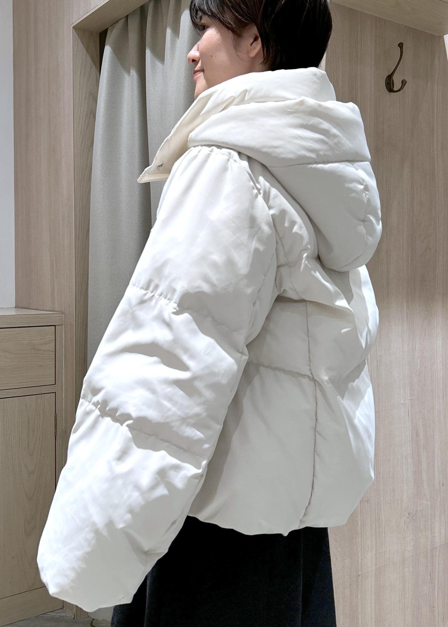 VIS【アウター総選挙3位】フード取り外し可能軽量ダウンブルゾン/2WAY・撥水加工オフホワイト / M¥18,480レビュー身長155cm、Sサイズ着用でお尻が隠れる長さです。