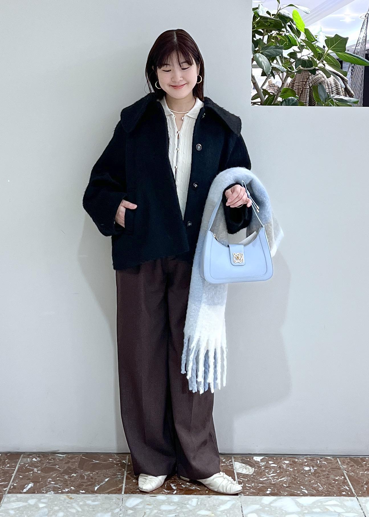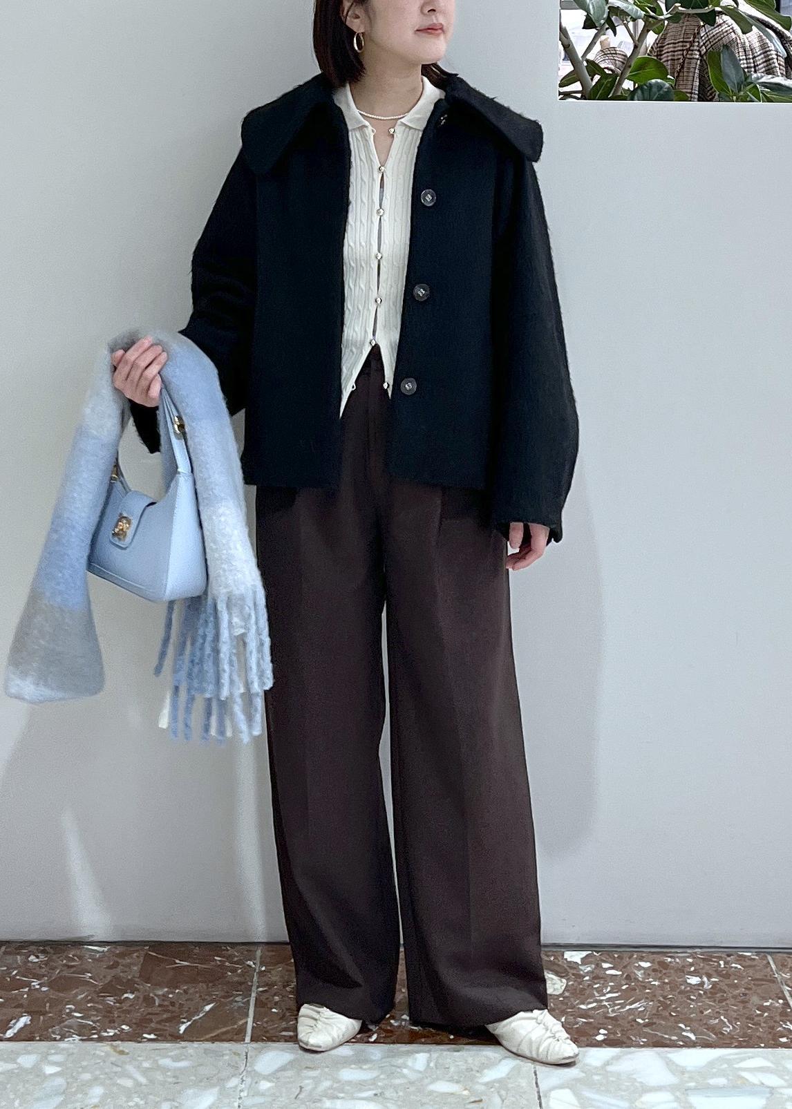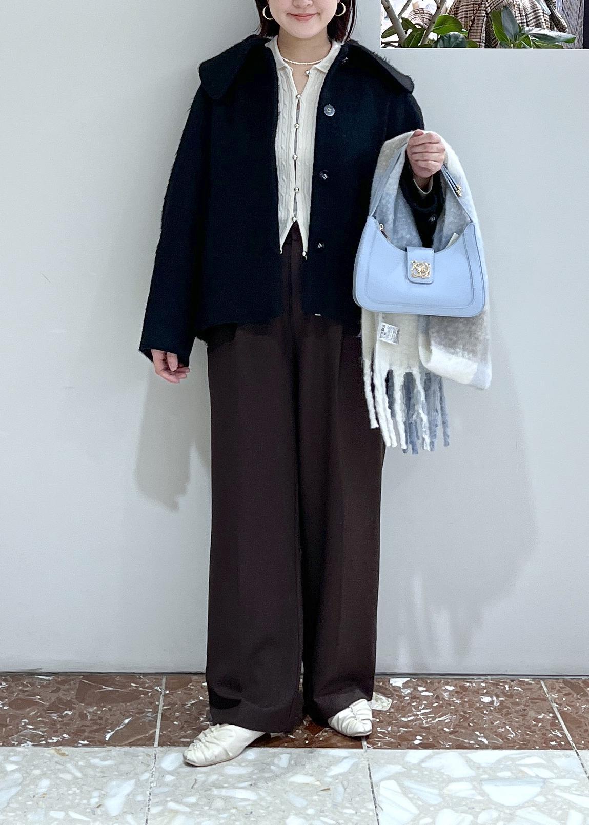 全体的にコクーン型のシルエットなのでフレア袖やボリュームあるトップスも重ね着しやすいです。