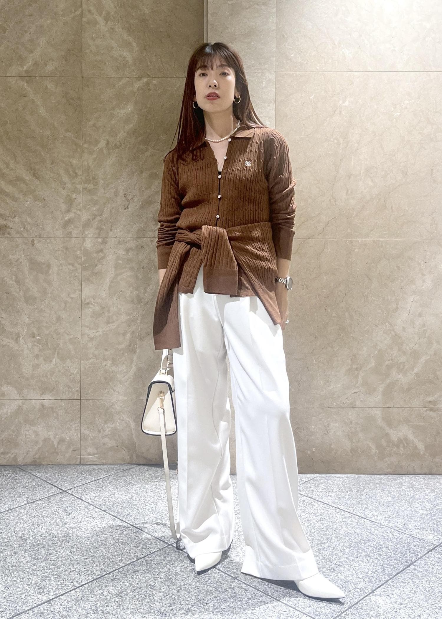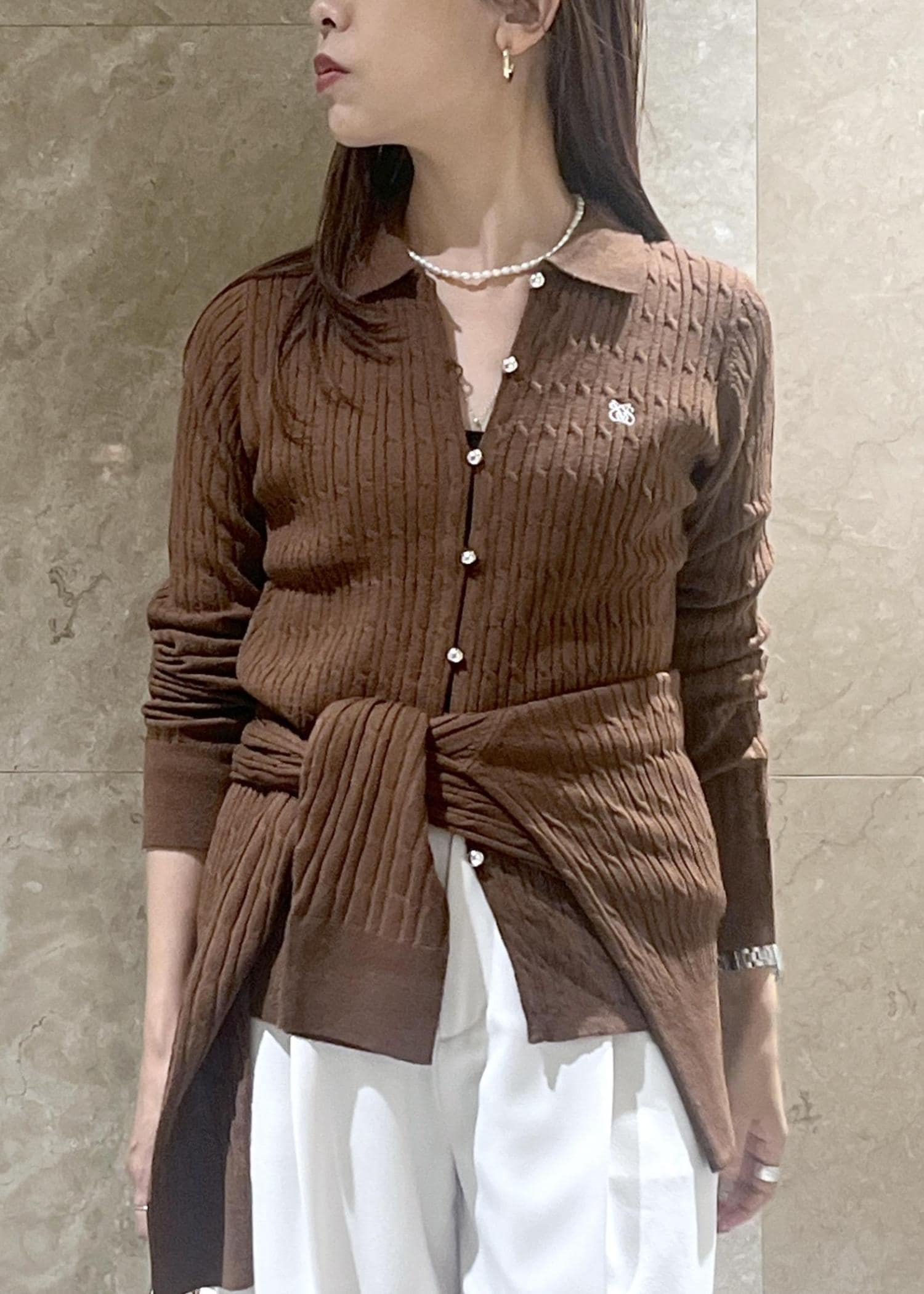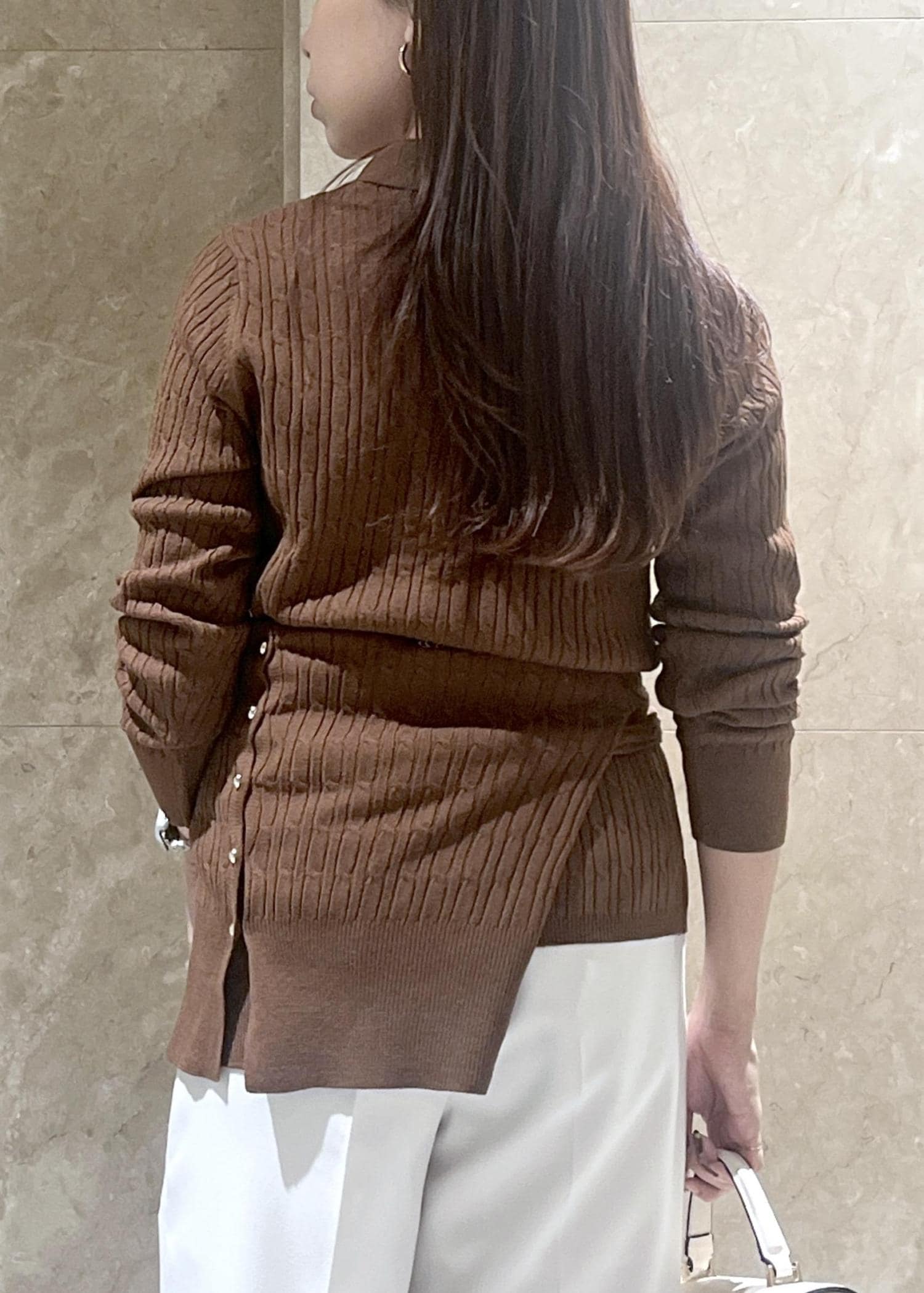 VISポロ衿ケーブルカーディガンダークブラウン / F¥5,929レビュー身長158cm、着丈は腰が隠れお尻に少しかかるほど。