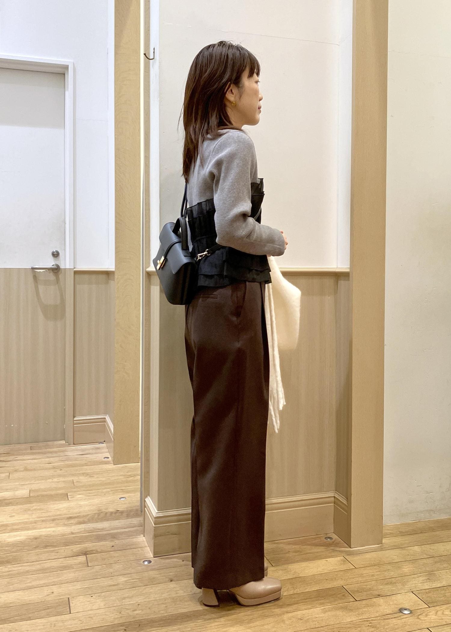 トップスのハイウェスト切り替えのデザインと、短めに斜めにかけたbagの持ち方で視線を上に行くようにしています。もちろん足元はヒール高めのショートブーツです。
