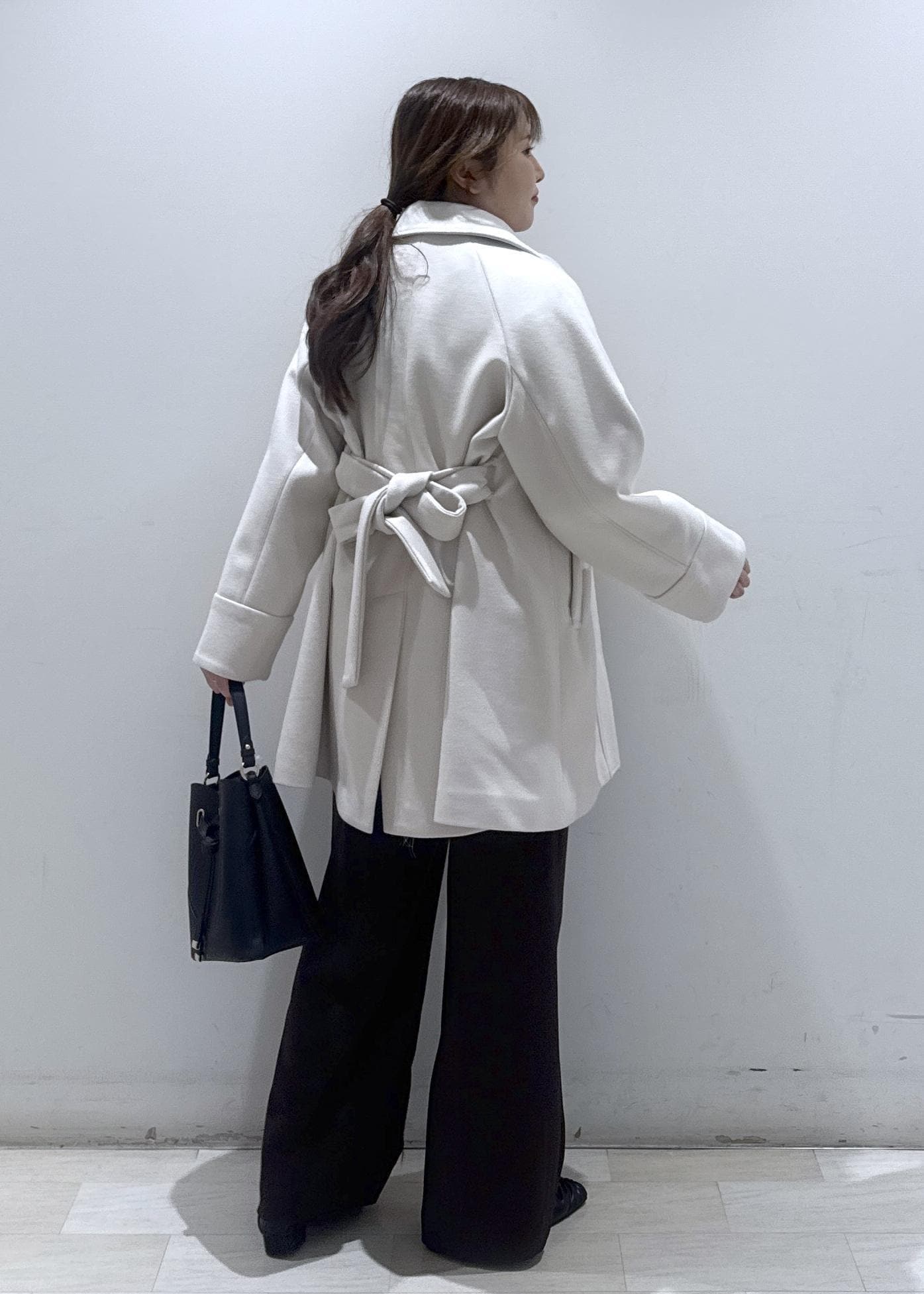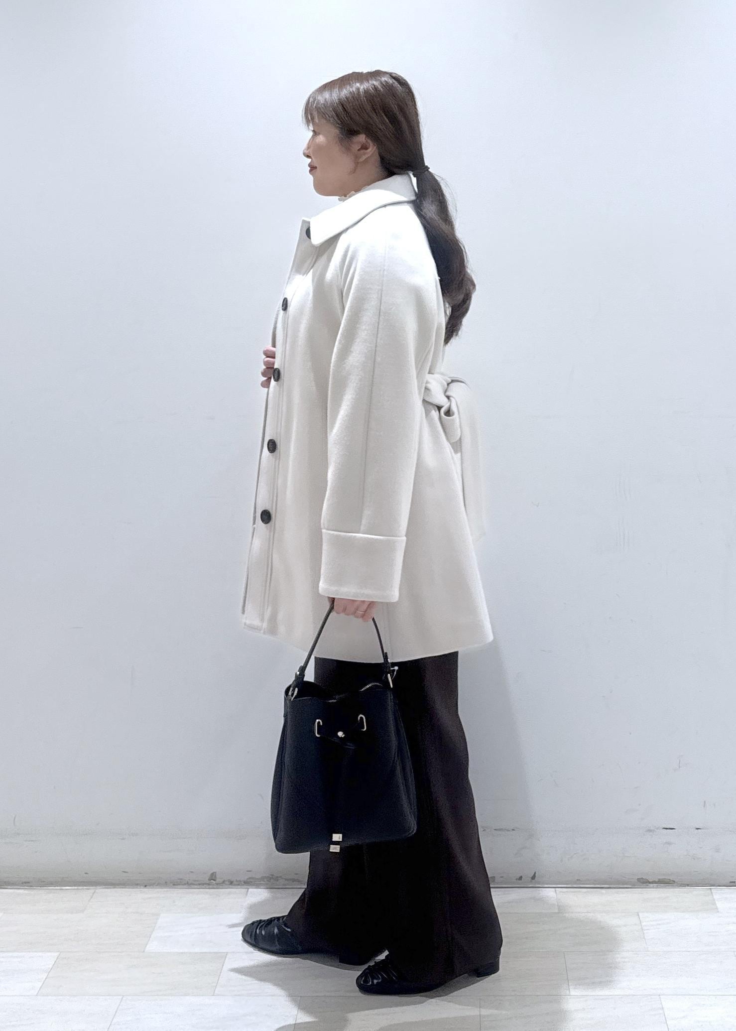 ベルト付きのAラインのフレアチェスターコート♪身長157cm/Fサイズ着用で、太もも辺りぐらいの着丈になります。ベルトが元々付いているので、前後で好きなように結ぶだけで印象が変わります。コート自体は軽量で全く重たくないです。お袖に少しゆとりがあるので、分厚めなニットを着てもゴワつくことはないです!