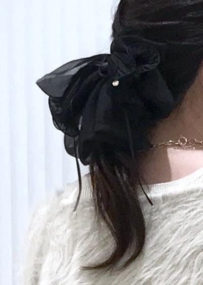 シンプルな1つ縛りの上から着けるだけで一気に華やかさが出るので、ワンピースやフェミニンなコーデにおすすめですよ。 -