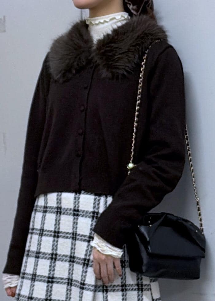 VIS衿ファー取り外しカーディガンダークブラウン / F¥6,589レビュー167cmの身長親指の付け根が隠れるぐらいの長さで安心して着ることができました。
