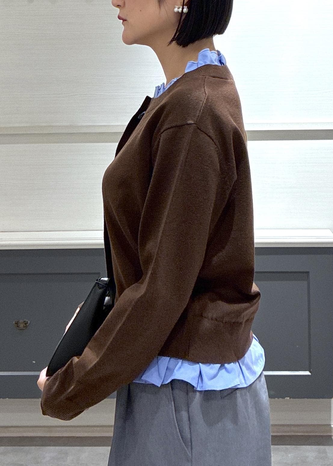 NEW! 予約VIS【美得】フリル襟ドッキングニットカーディガントップスダークブラウン / F¥5,929レビュー骨格ストレートで肩周りが気になる体型ですがぴったりし過ぎないので体型を拾わず着用出来ました♪