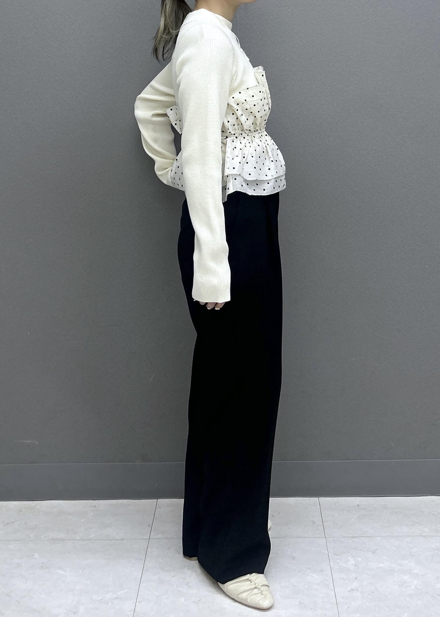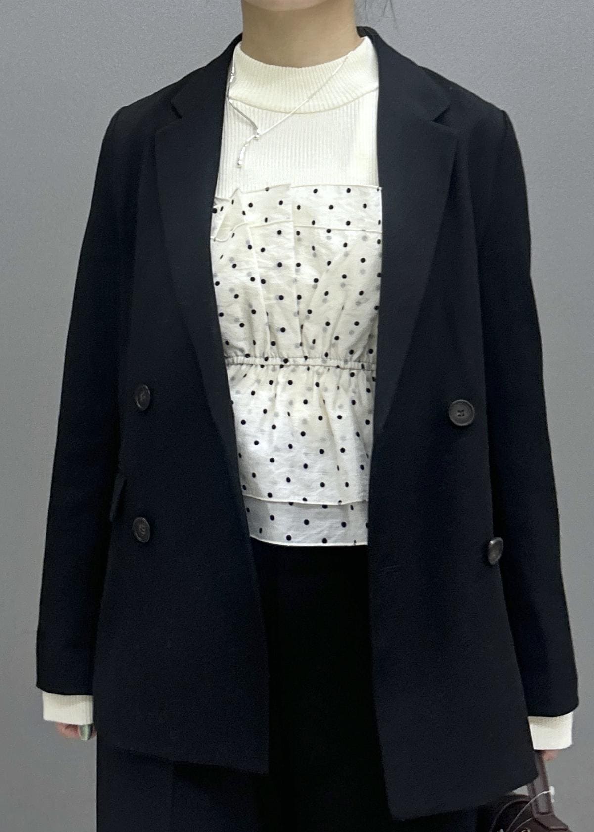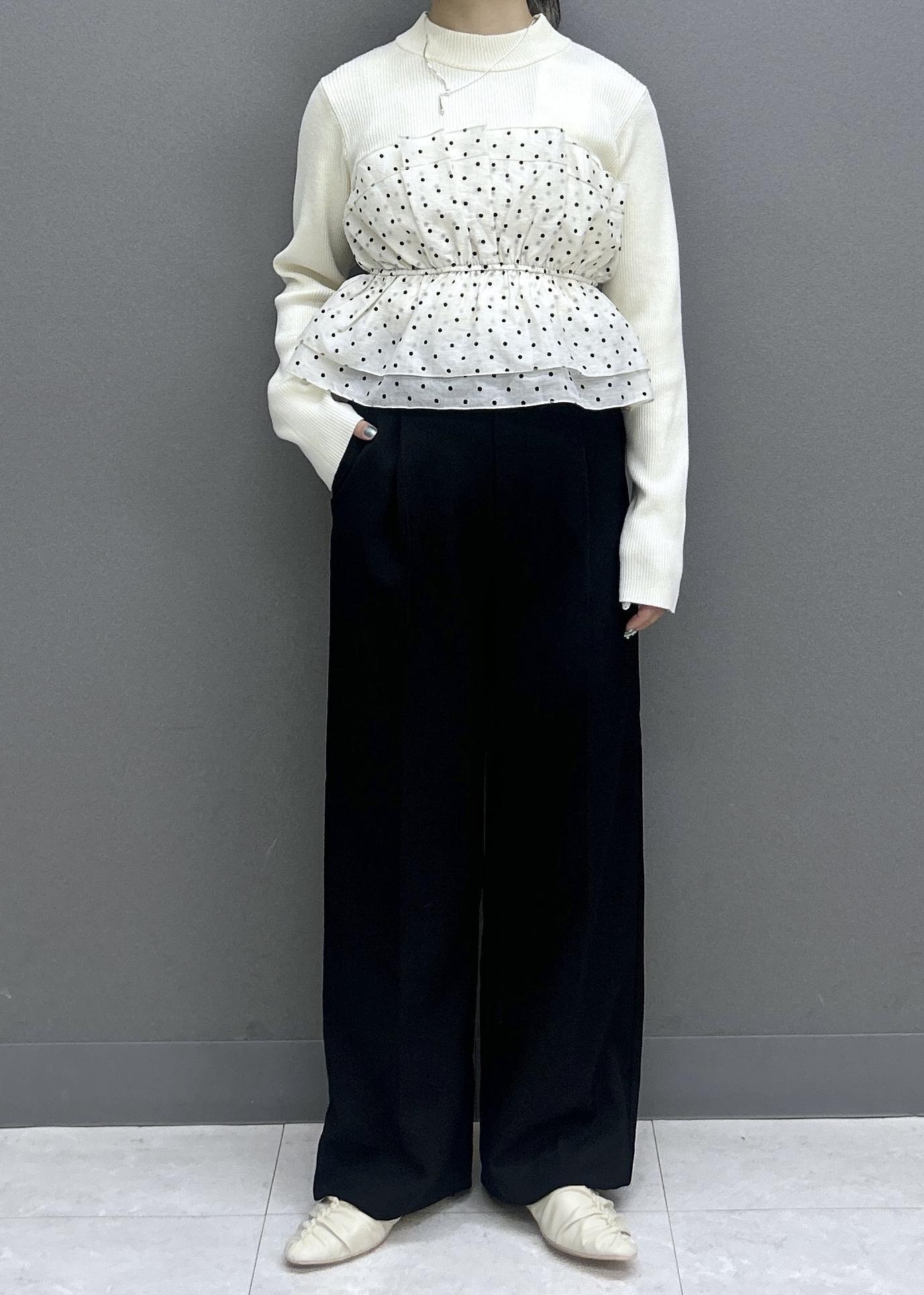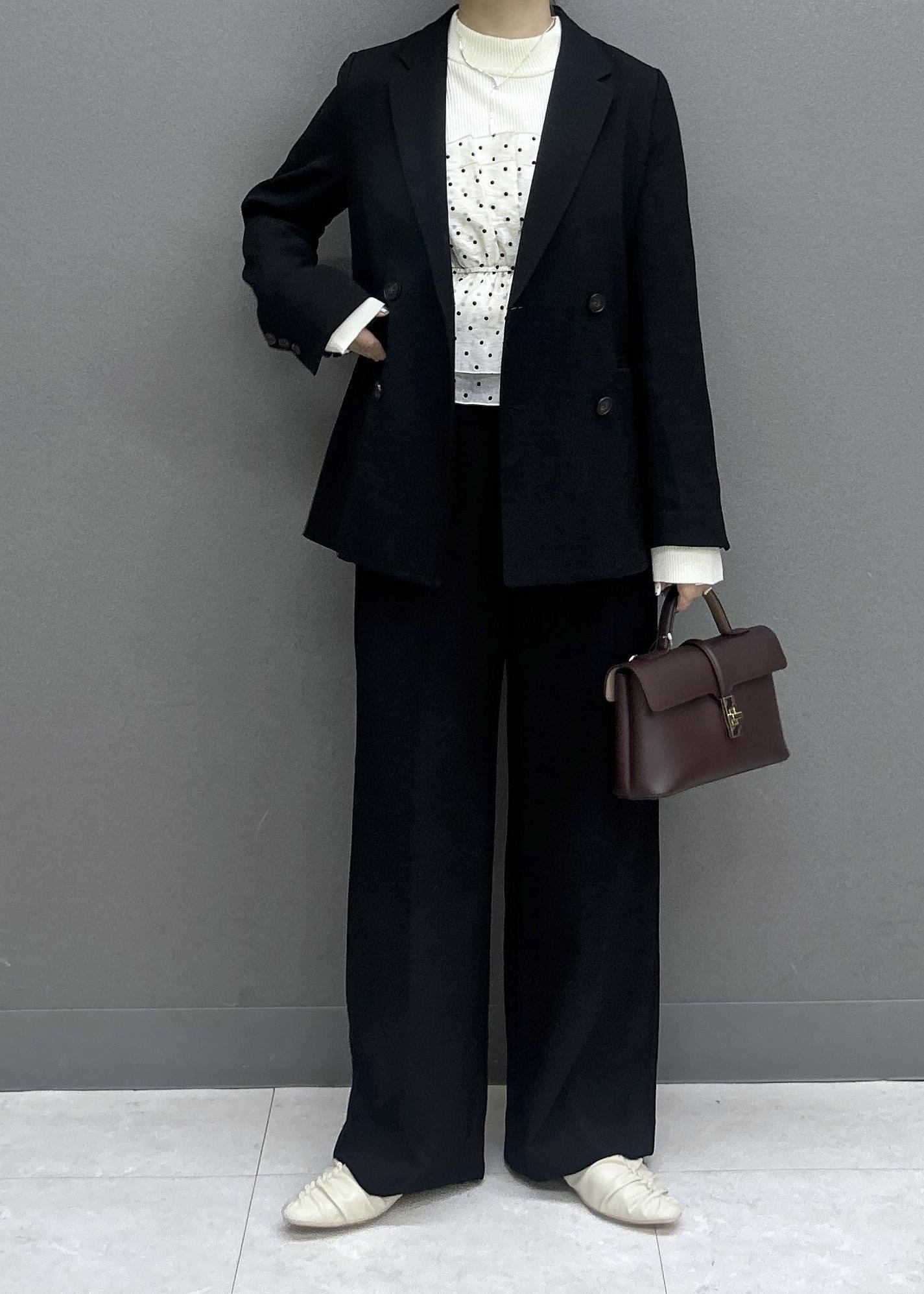 美easyウーリッシュのブラックセットアップにドット柄のニットをあわせて遊び心をプラス♩