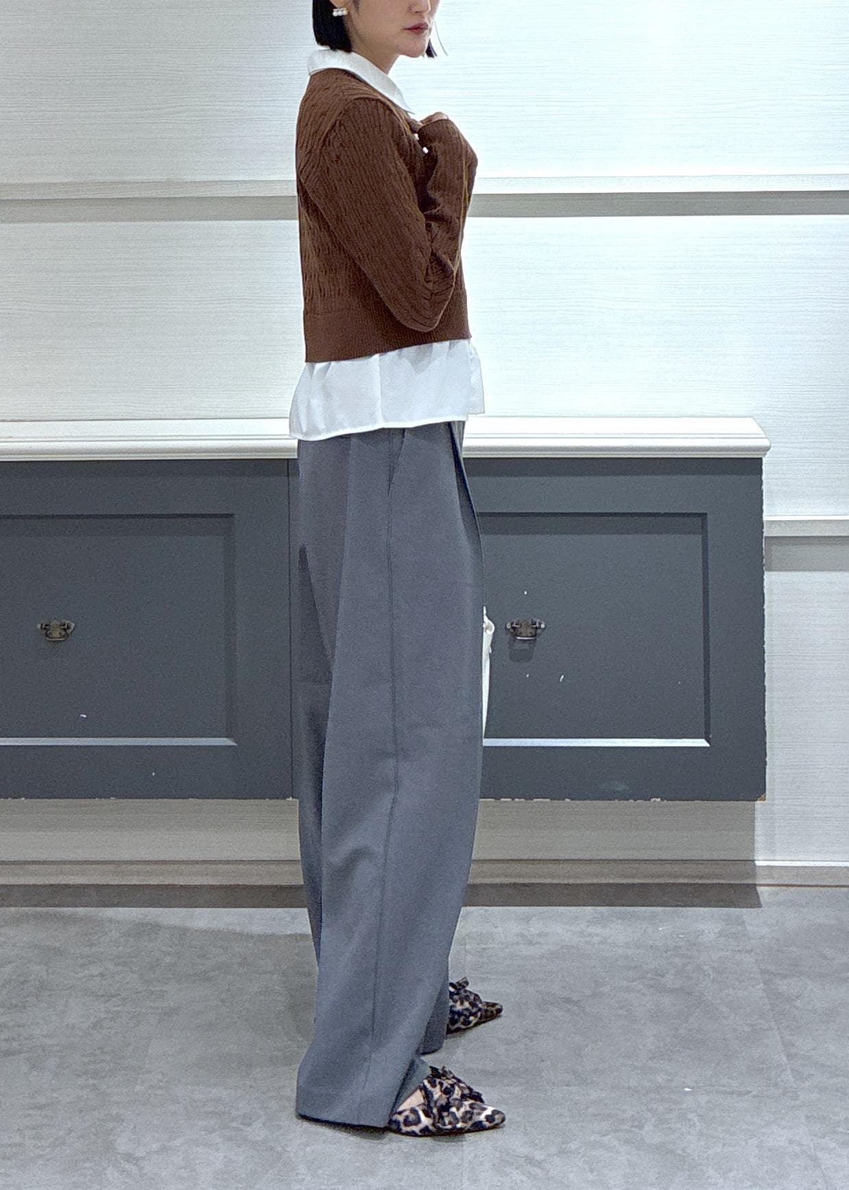 1枚で決まるレイヤードトップスはブラウン×グレーのカラー合わせで大人カジュアルなスタイリングにしました♡