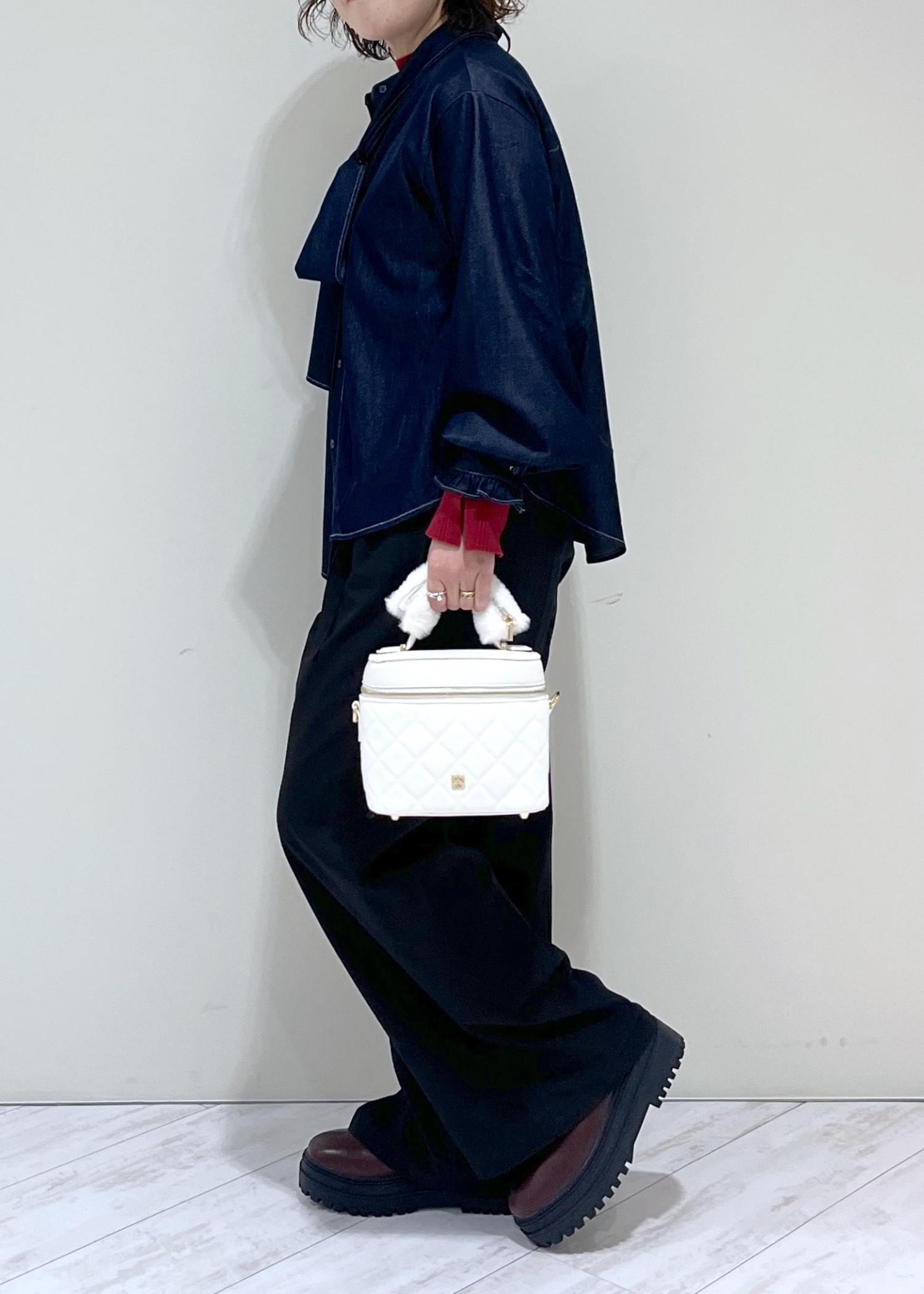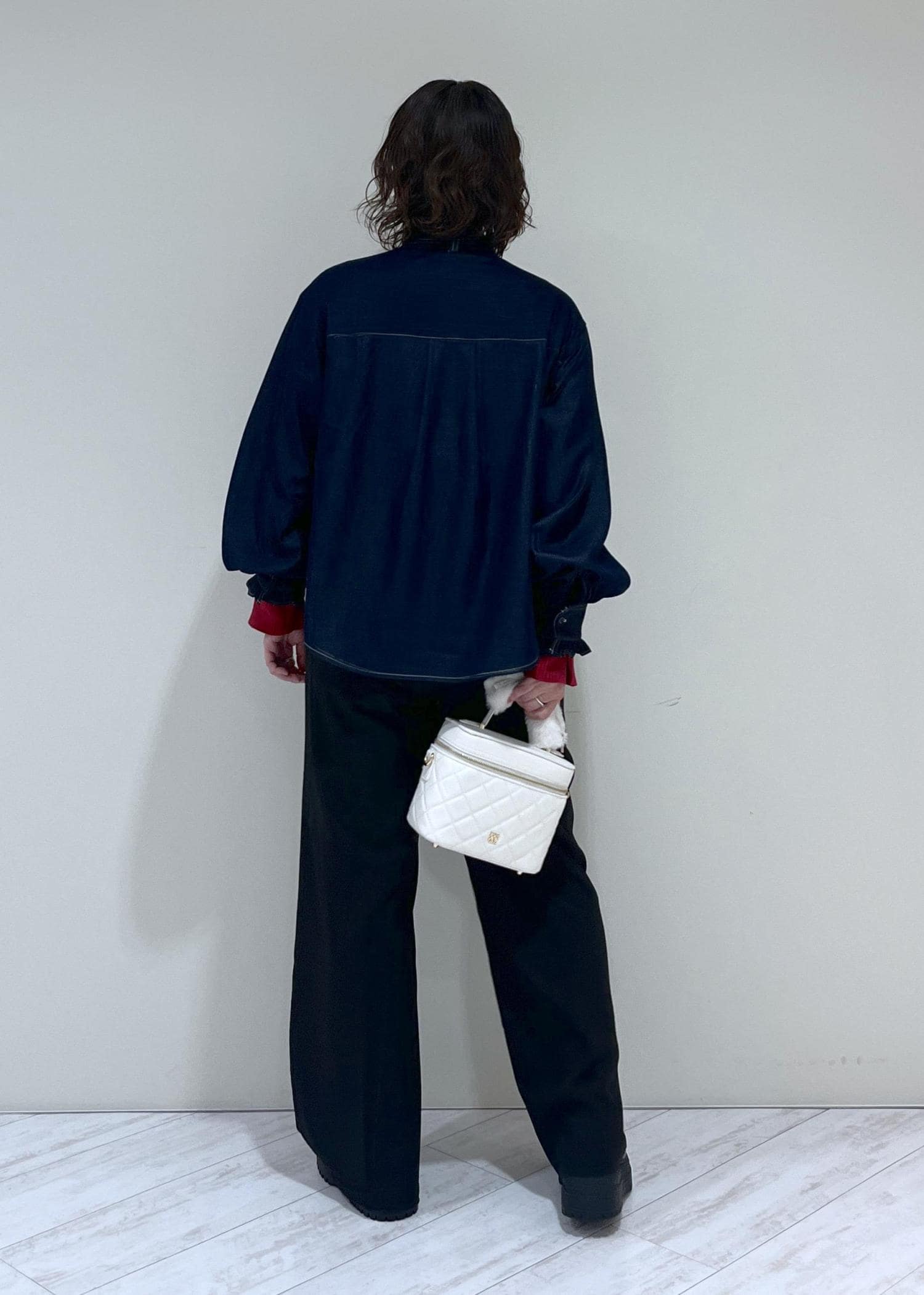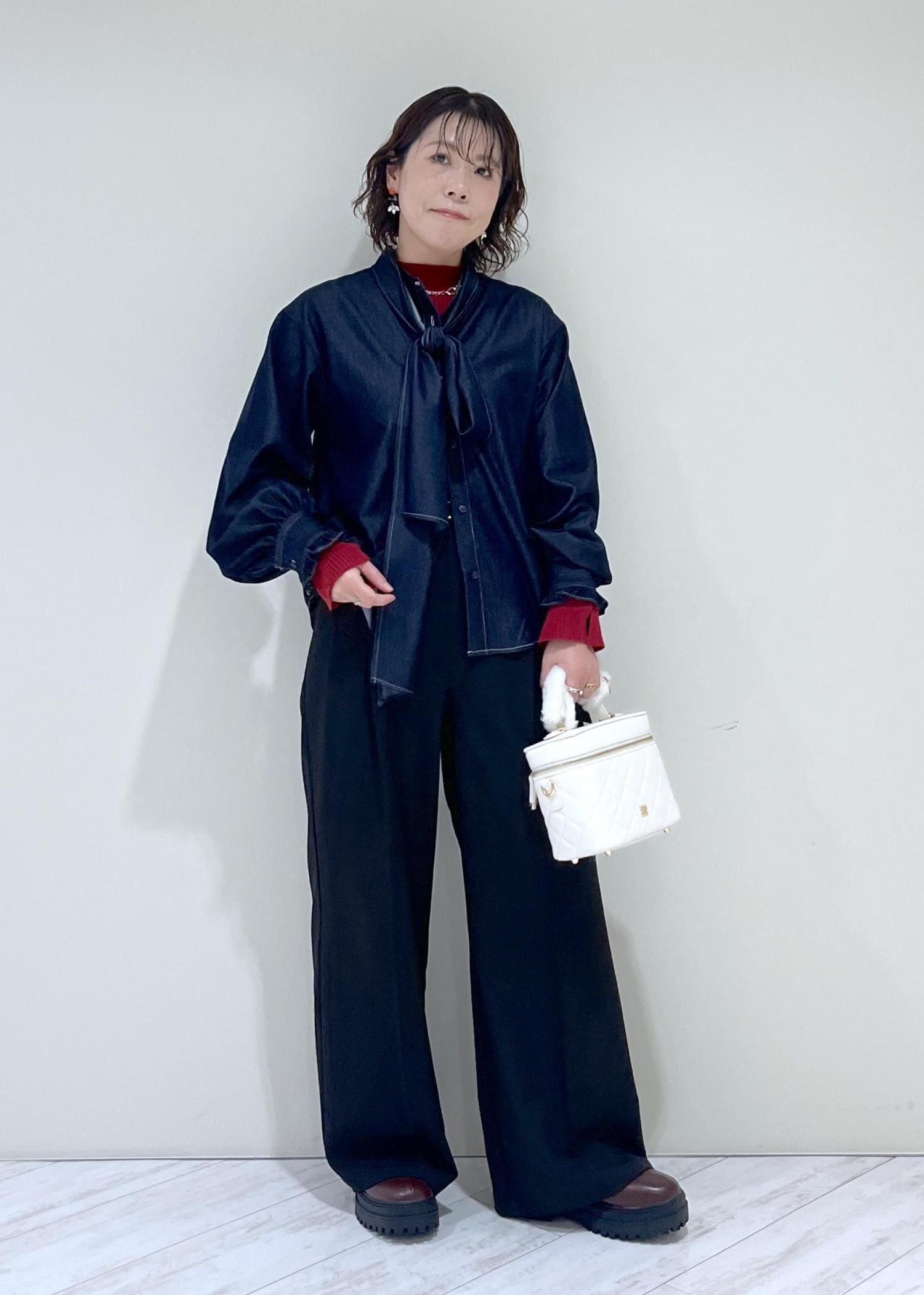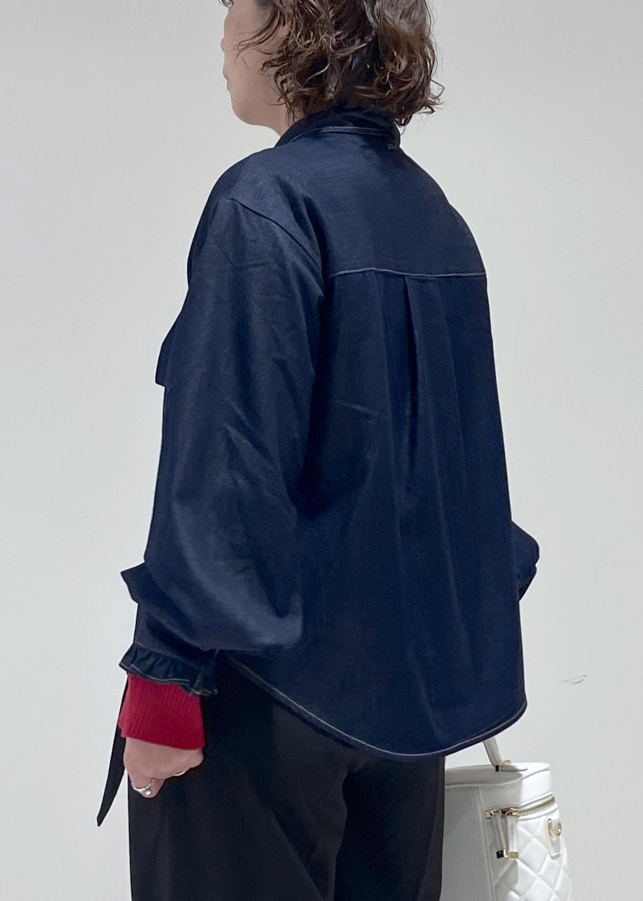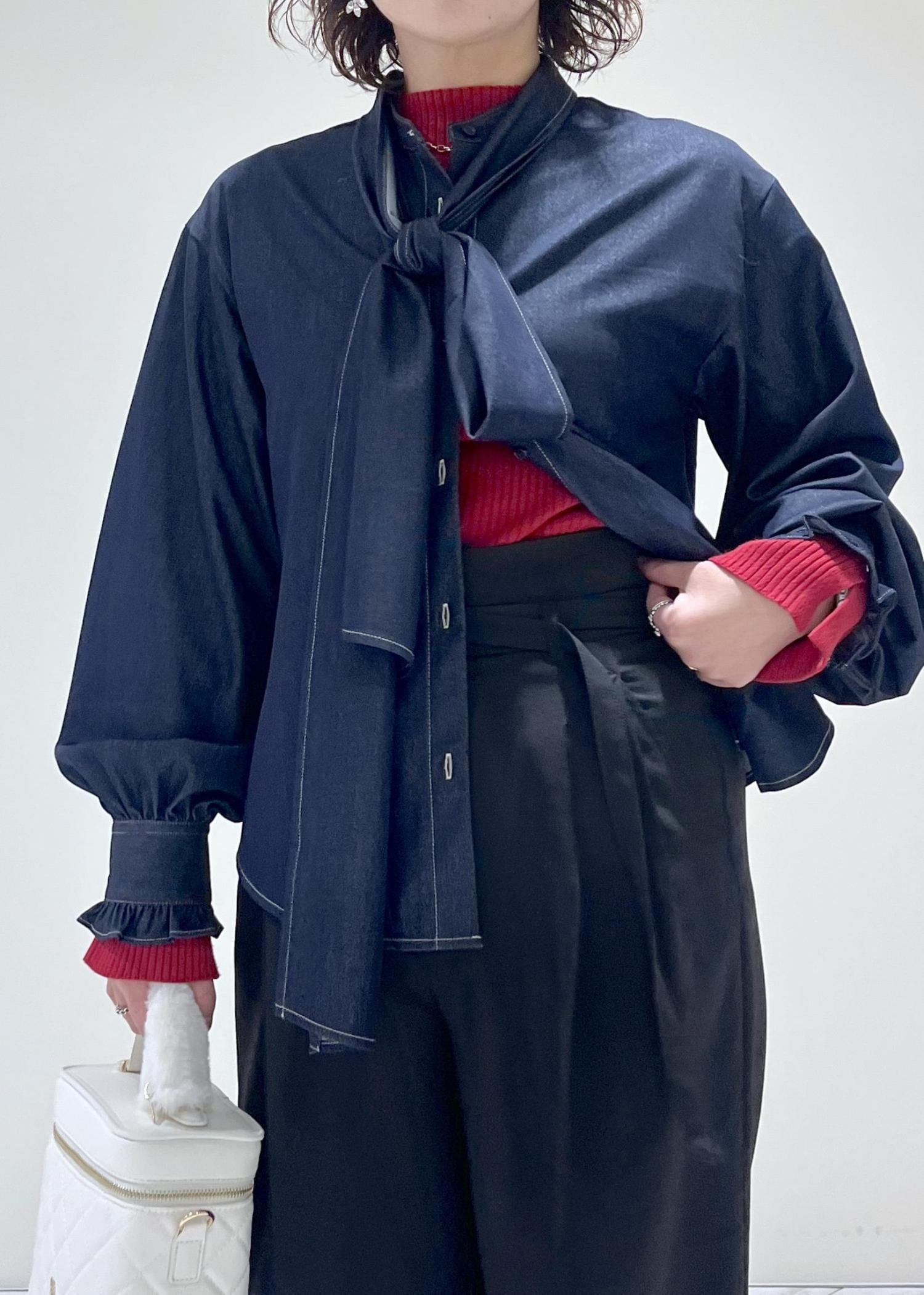 ボウタイを外すとスタンドカラーでシンプルな形なので、1枚で着てもニットやベストなどのレイヤードでも◎ -