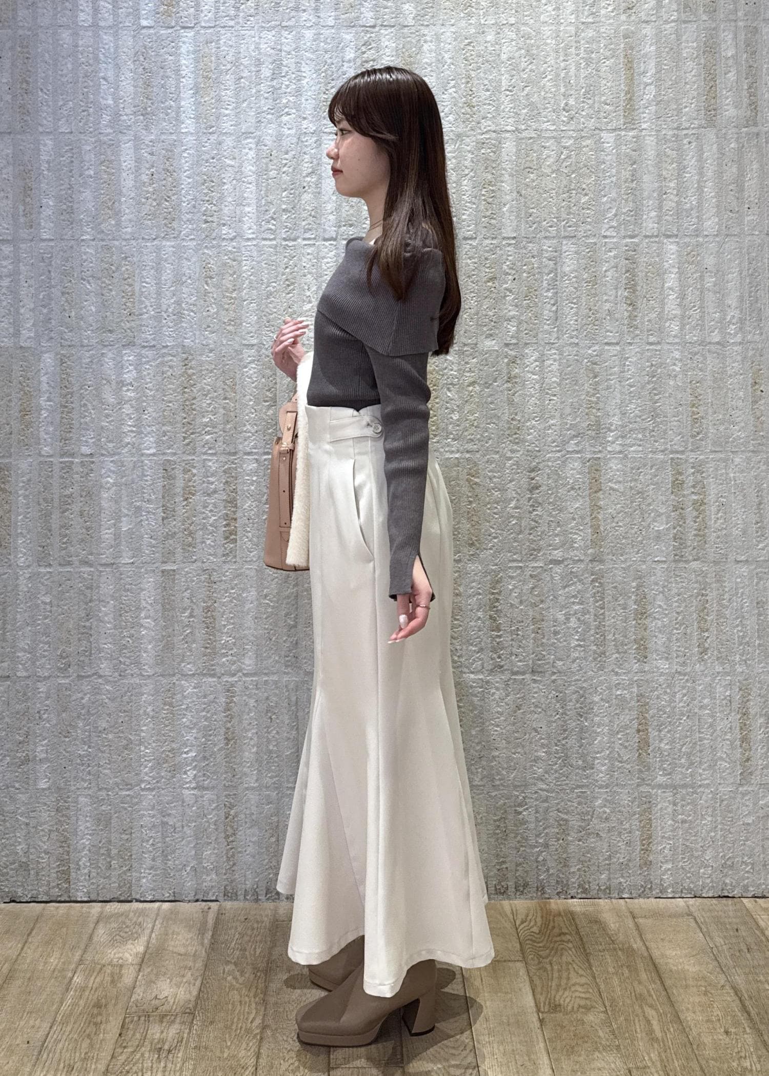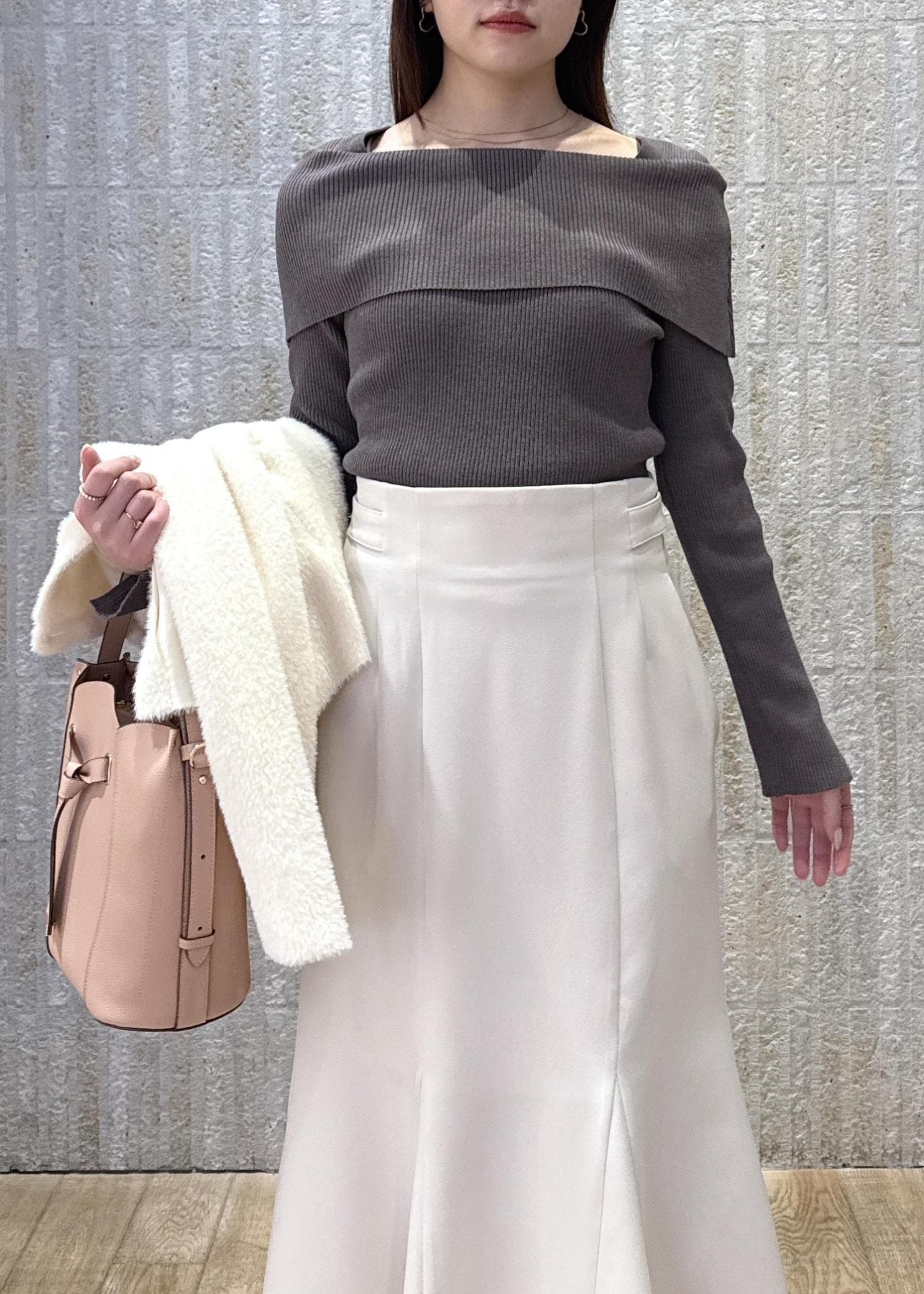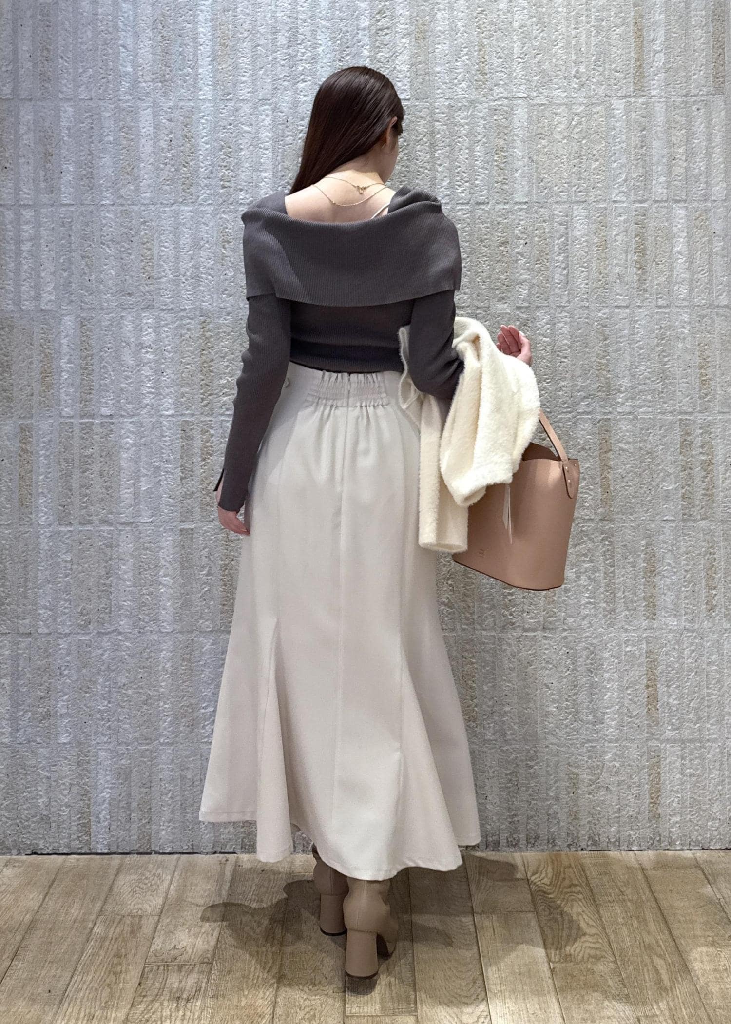 デコルテラインを綺麗に魅せてくれるオフショルトップスに、動きが綺麗なマーメイドスカートを合わせて、フェミニンな印象に♡