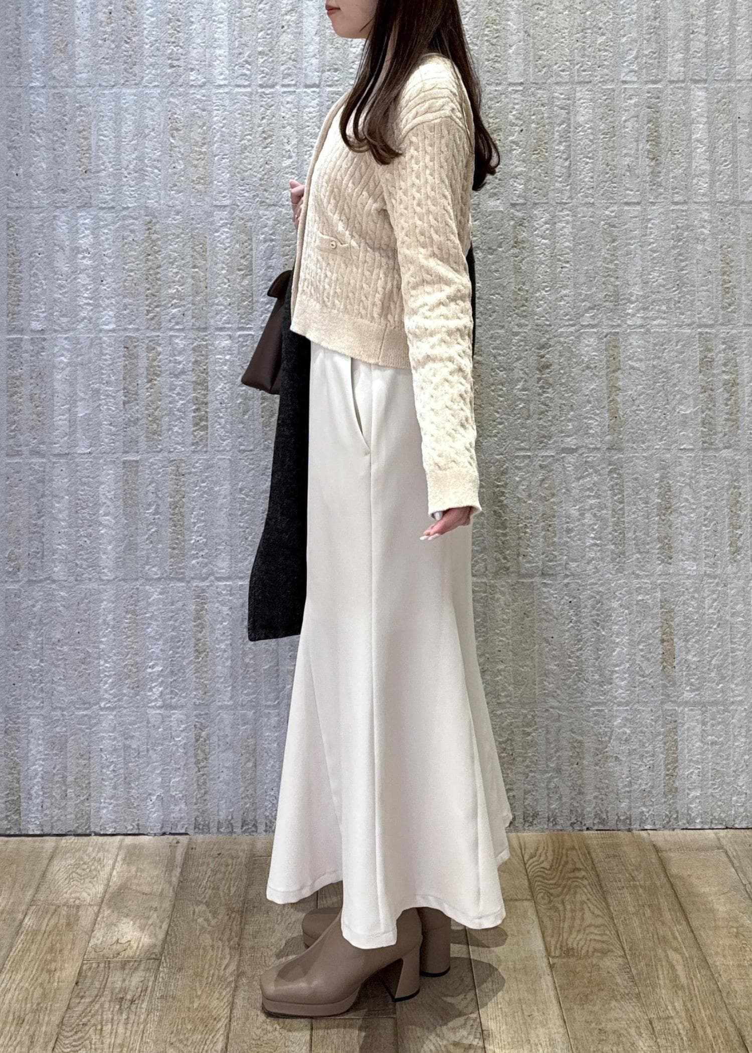 Mサイズは、ヒールを履いてふくらはぎの中間くらいの丈感。ややゆとりがあるため、ニットなど重ね着する場合はMサイズをおすすめします◎