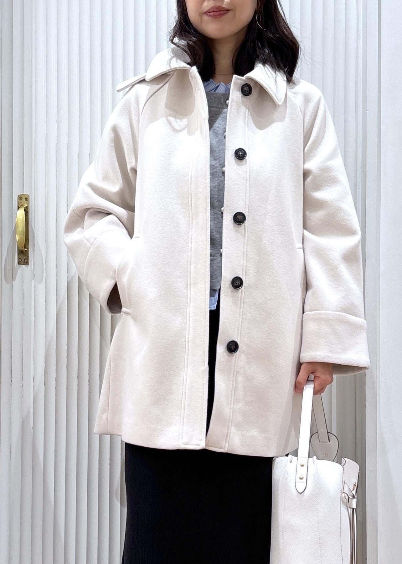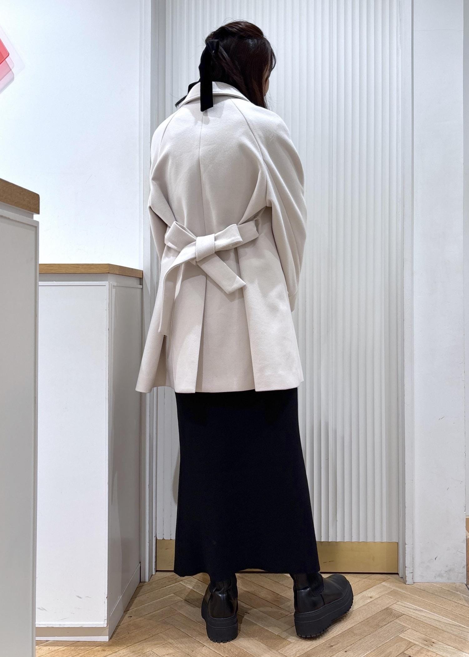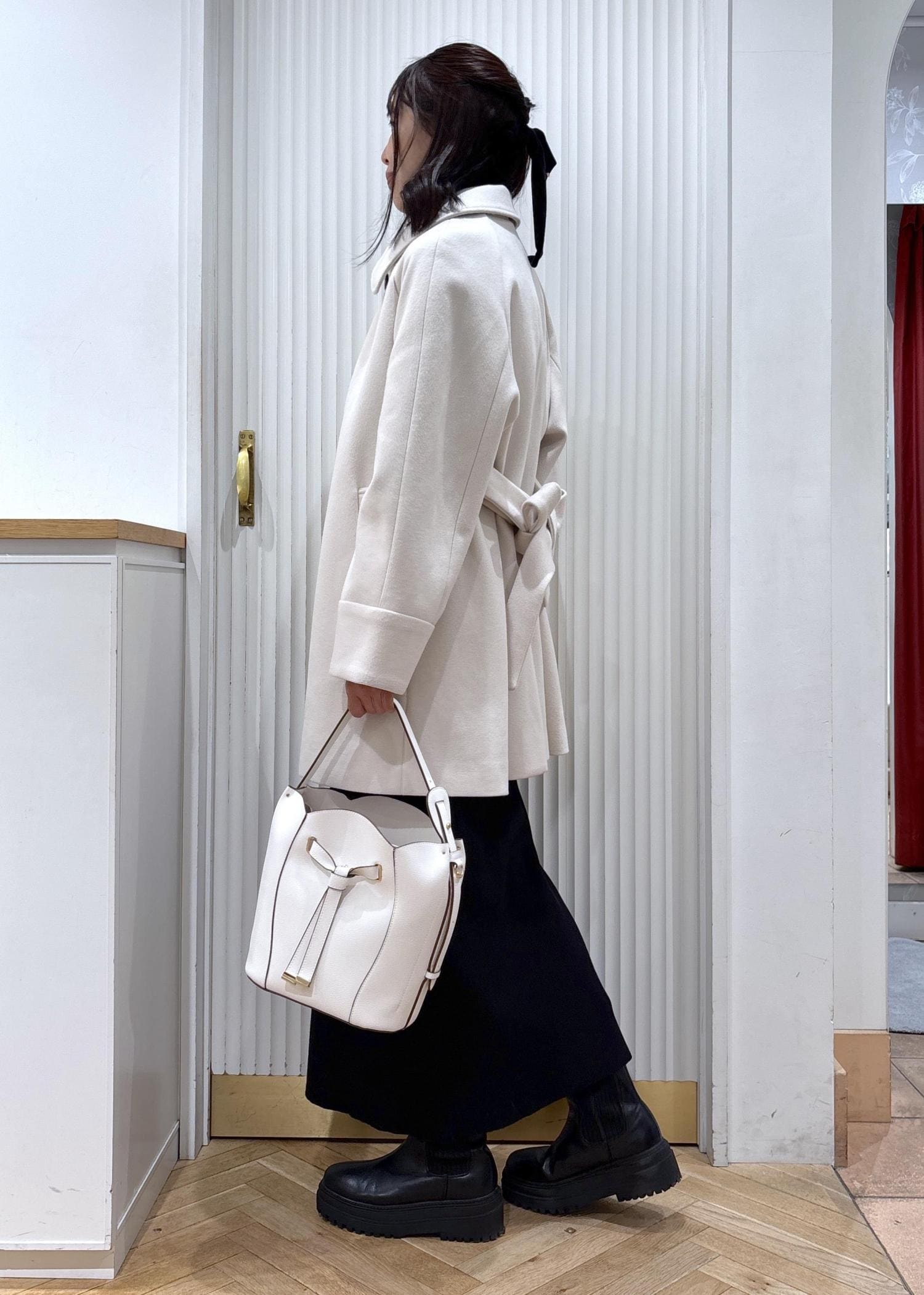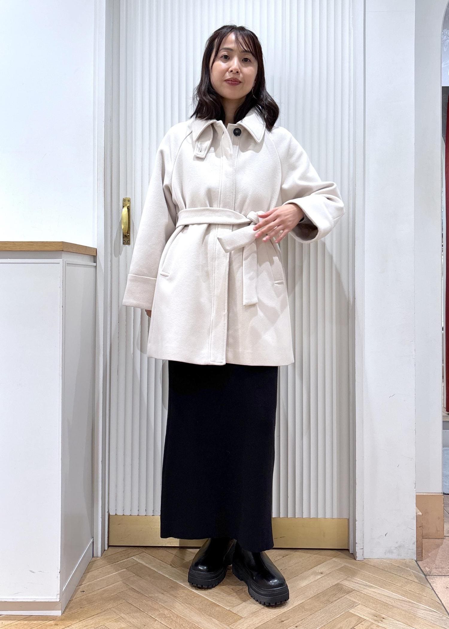 Iラインですっきりまとめたスタイリングにフレアータイプのコートを合わせて、すっきりまとめました。
