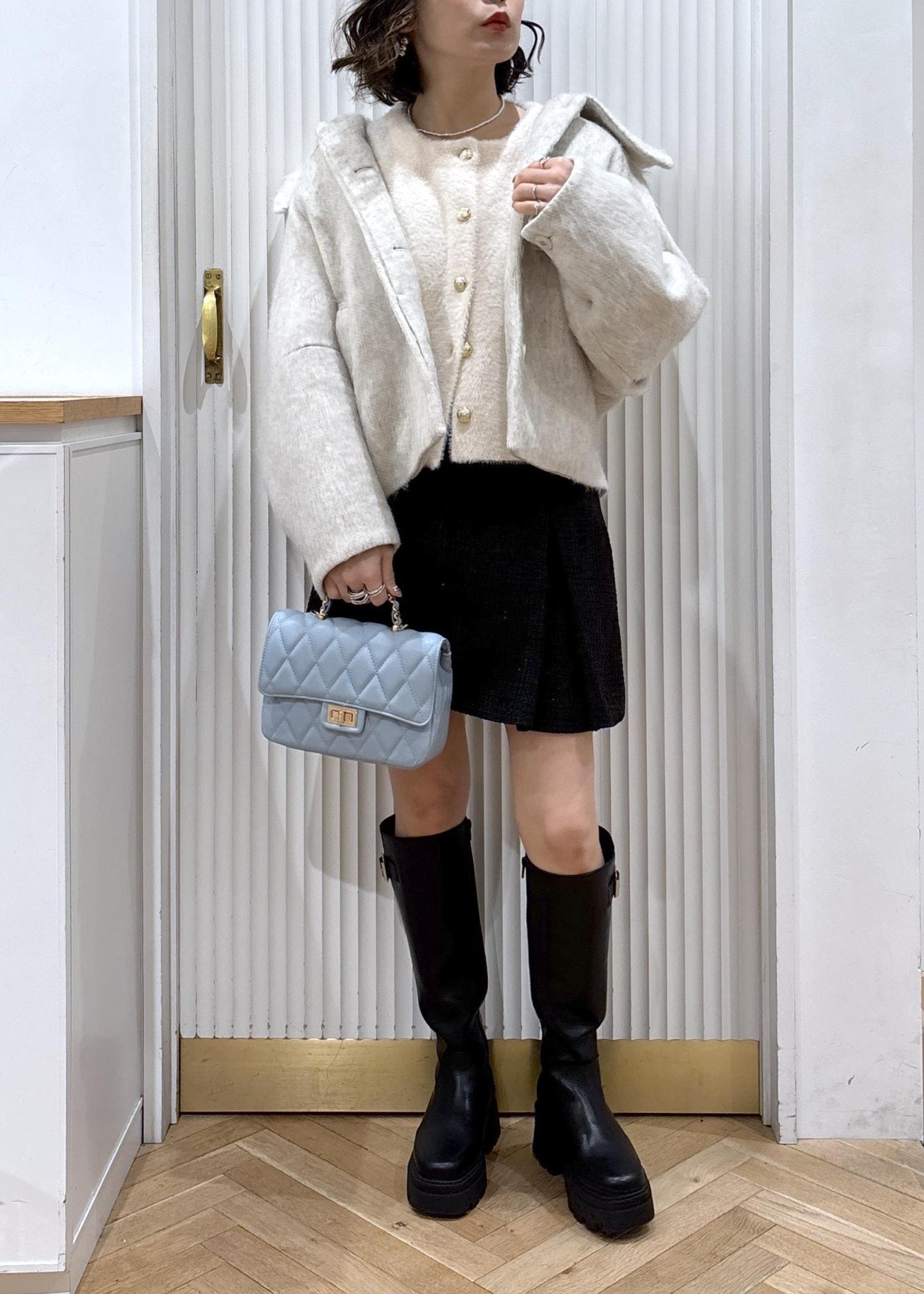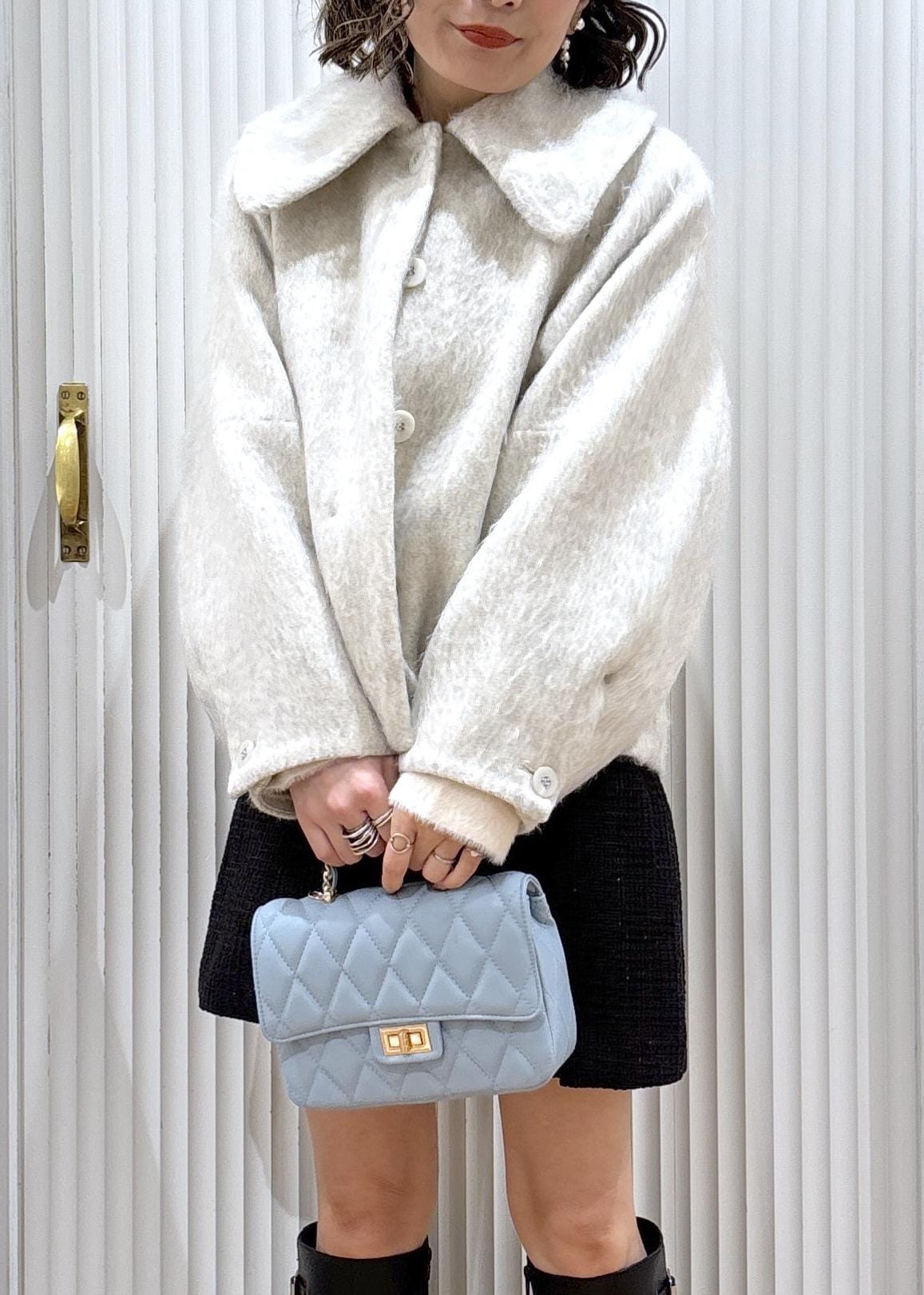 ふわふわのミニフェザーカーディガンにふわふわのウールコートで大人可愛いフェミニンコーデ。