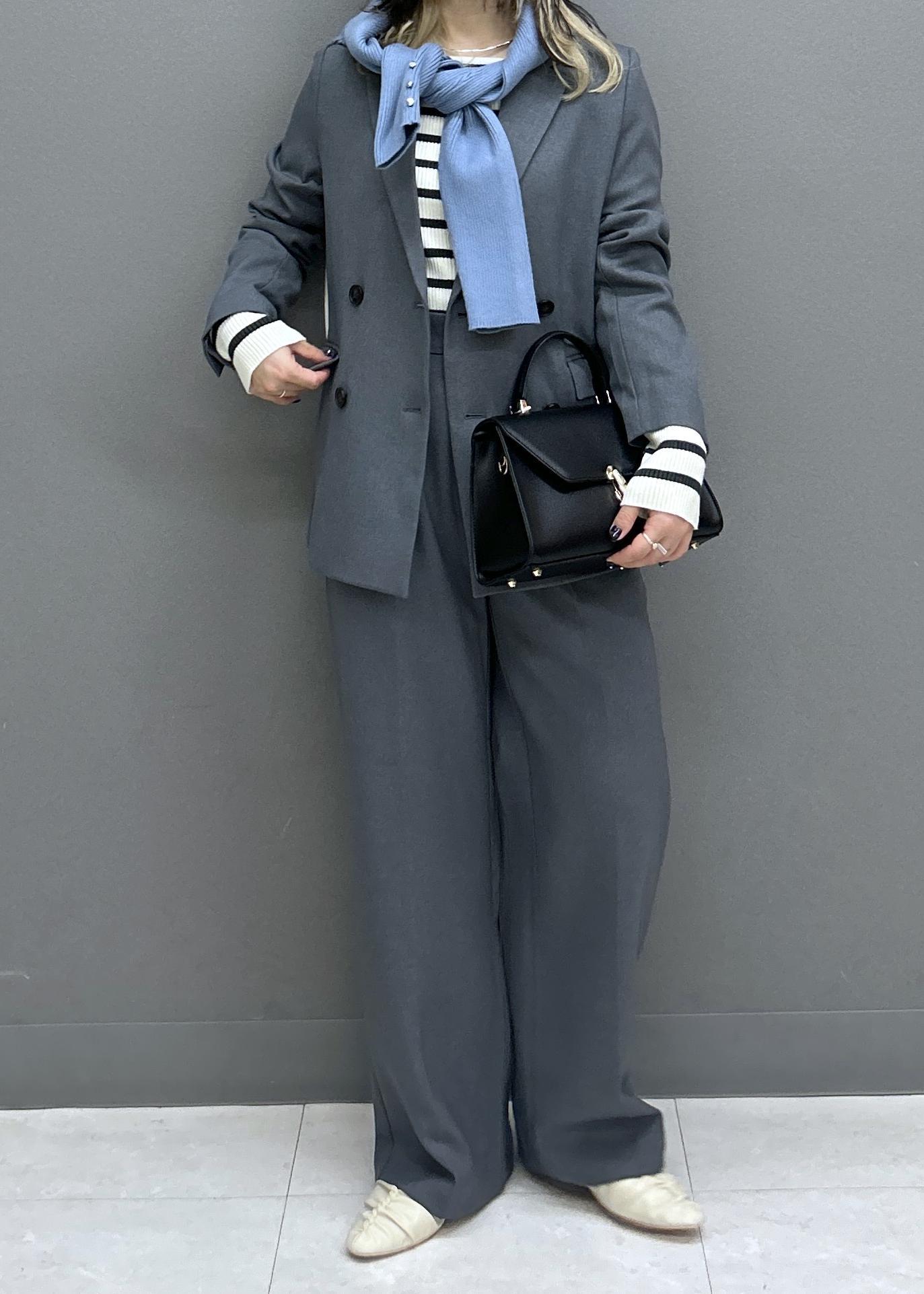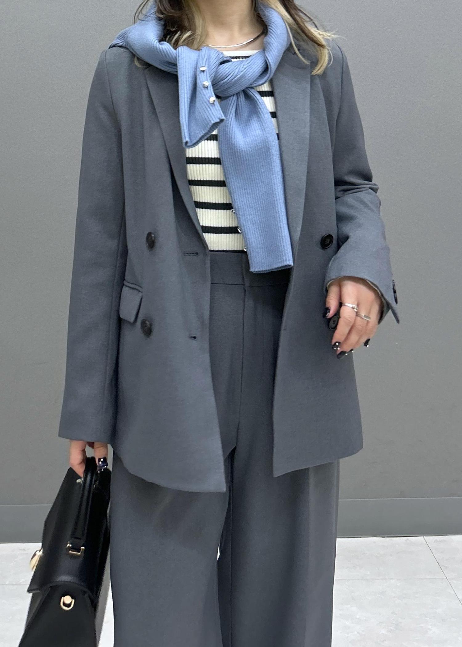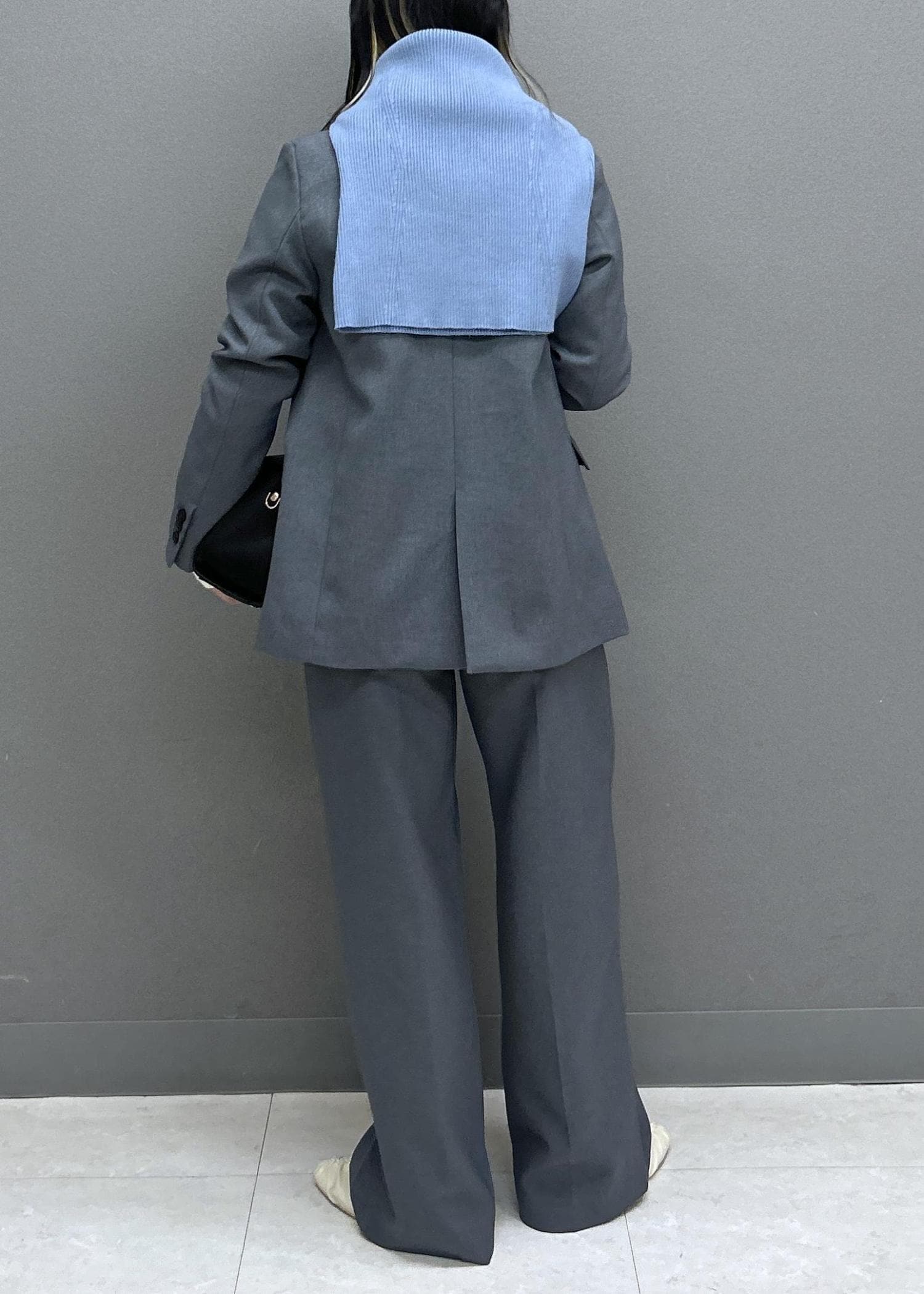 ジャケットの上にリブニットをレイヤードすることで、程よくカジュアルダウンしてラフな印象になります◎
