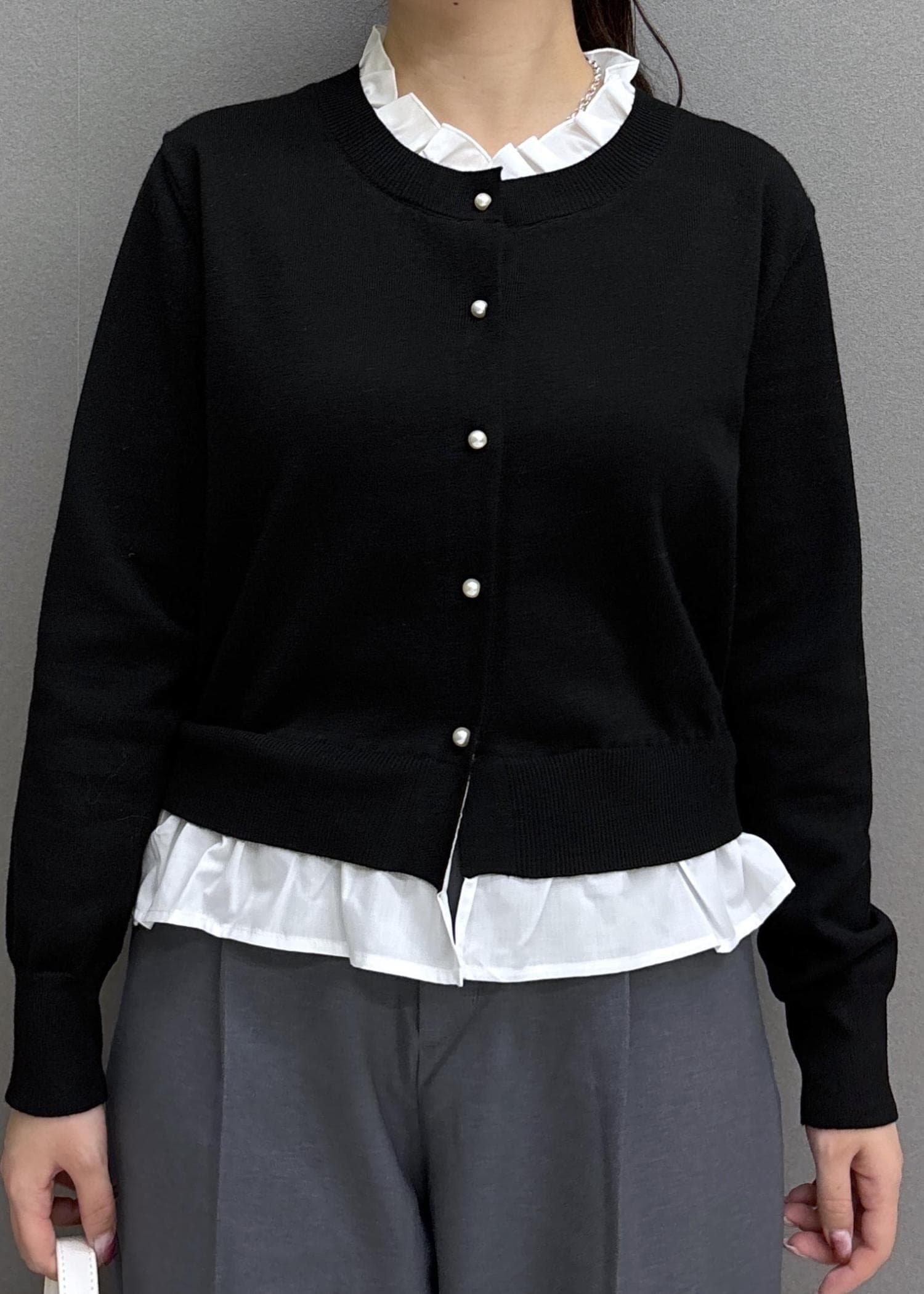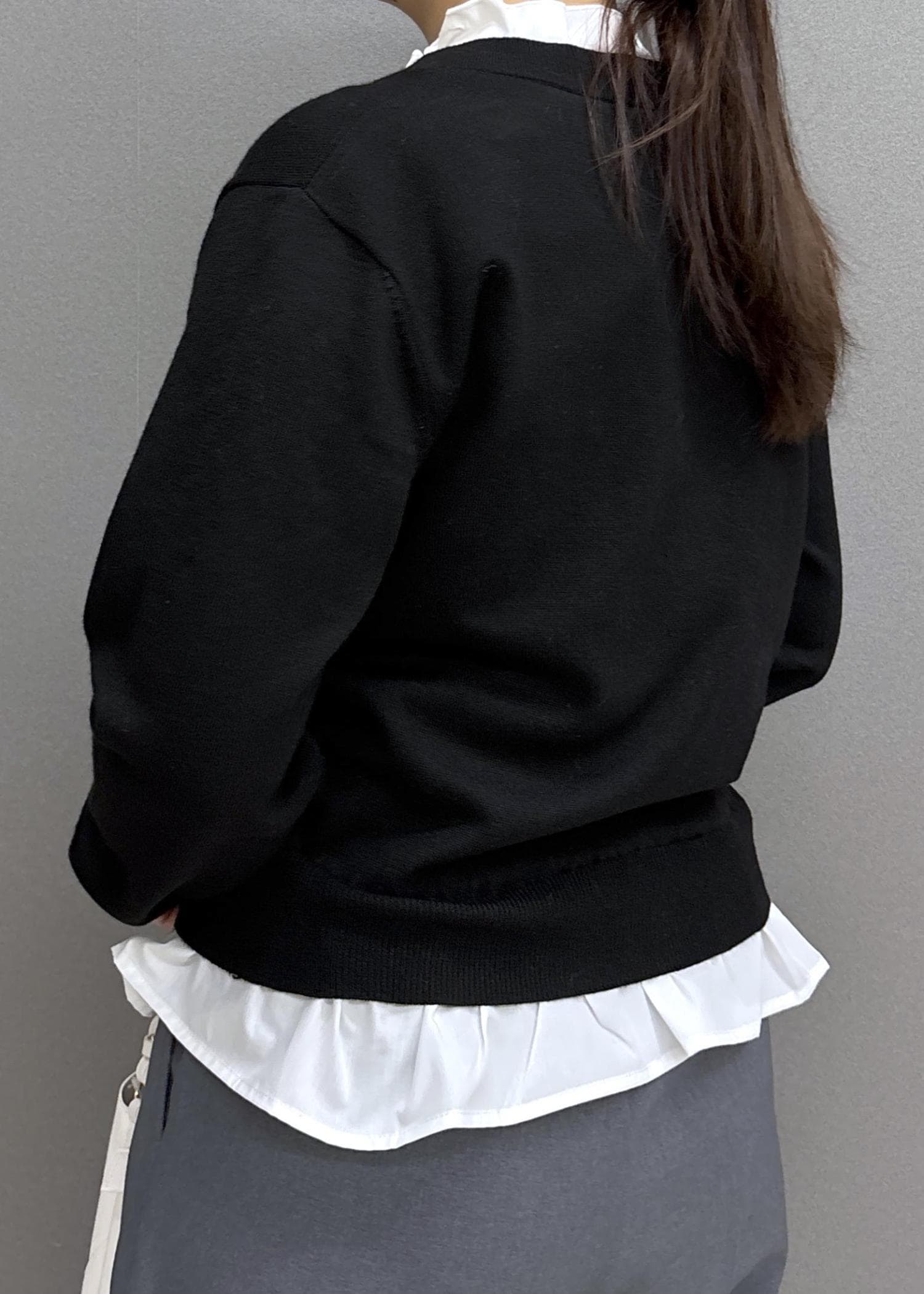 NEW!VIS【美得】フリル襟ドッキングニットカーディガントップスブラック / F¥5,929レビュー160㎝だと腰まわりがしっかり隠れる着丈。身幅はややゆとりがあり、体のラインを拾いすぎないサイズです!伸縮性のある柔らかい素材で着心地も抜群◎冬〜春まで長く着られそうな生地感です!