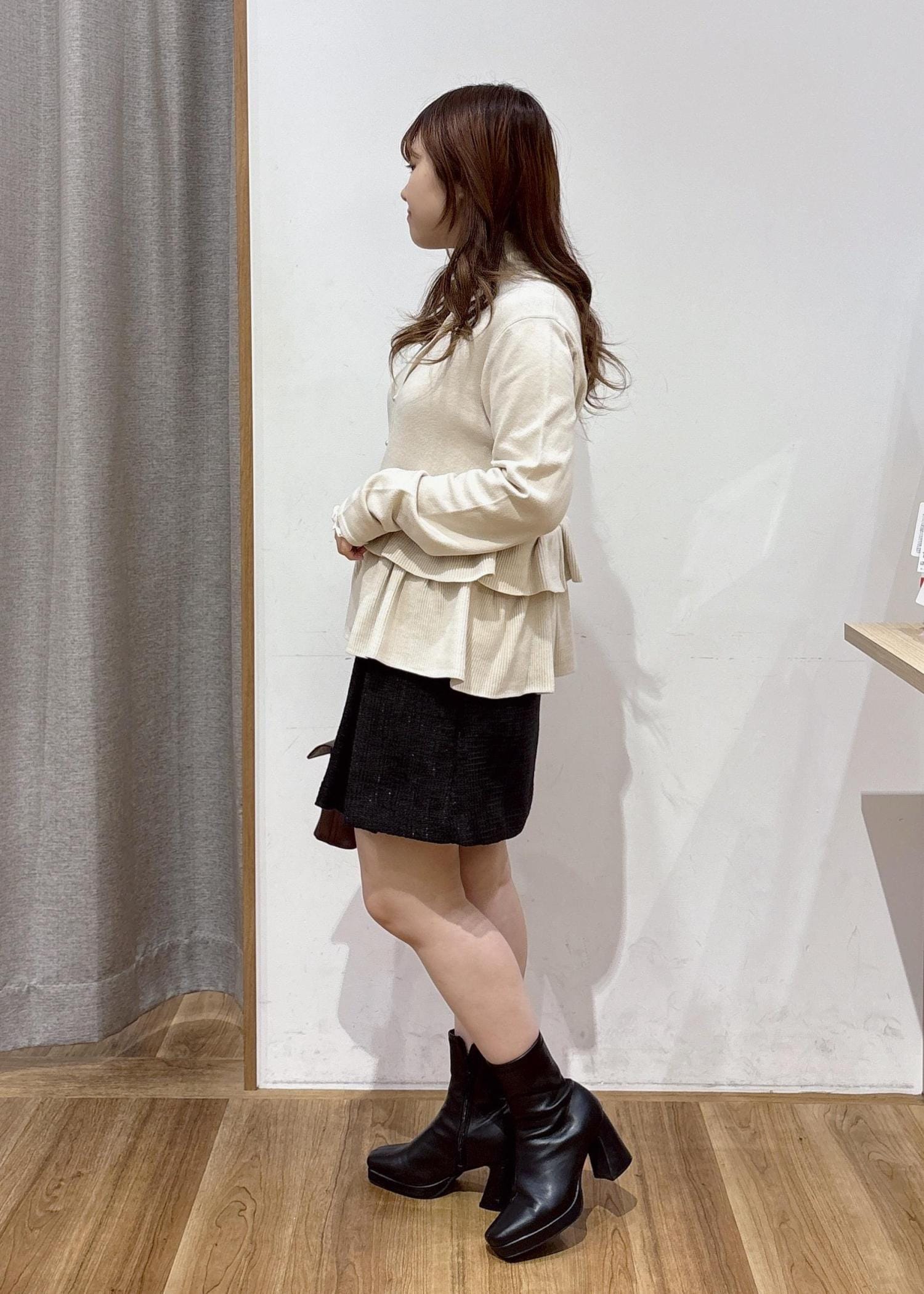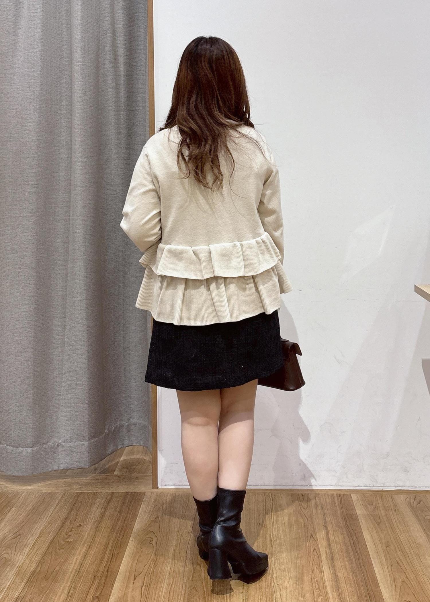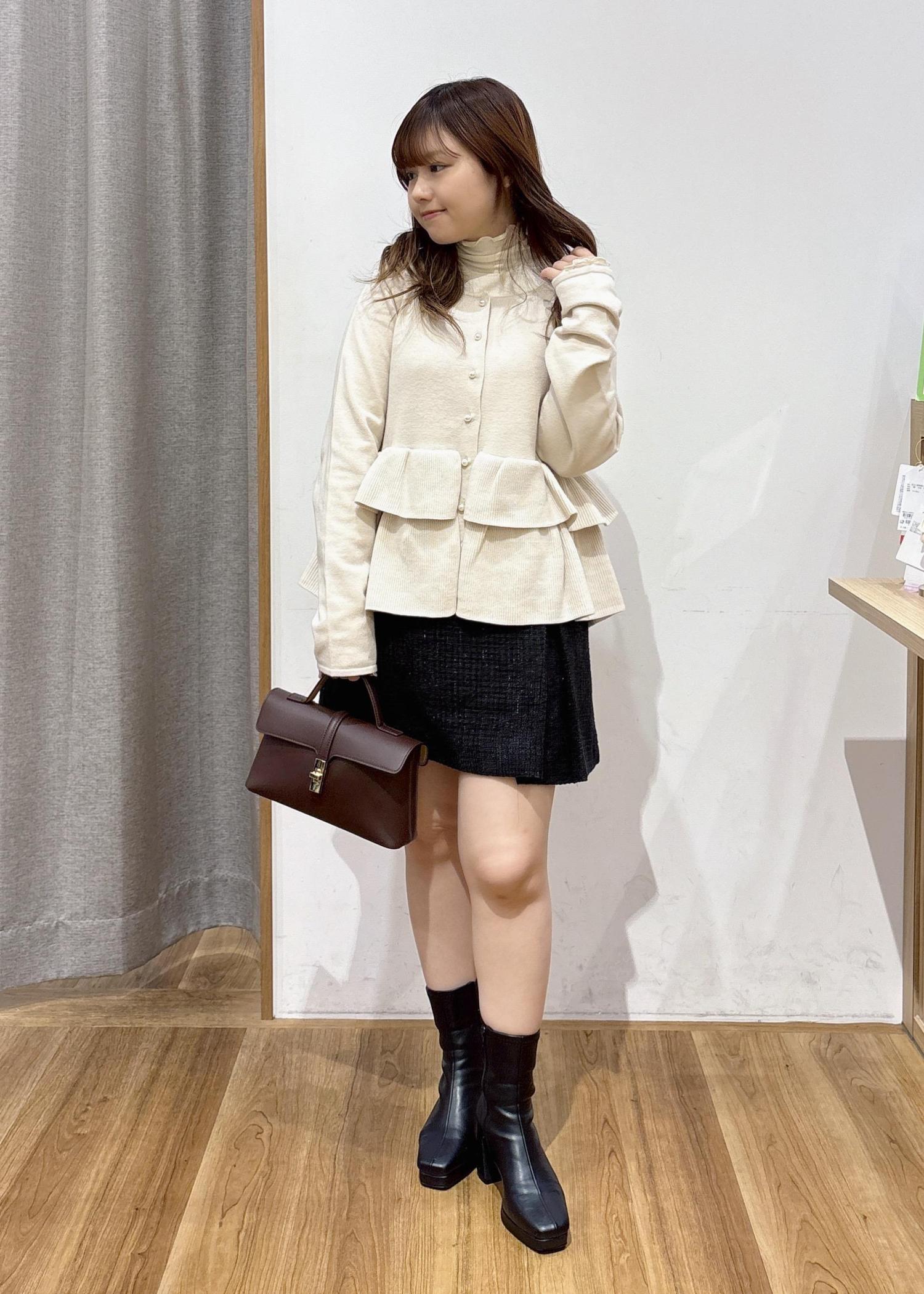 気になる部分をさらっと隠してくれるペプラムカーディガンに、低身長の方が特に得意なミニ丈のボトムを合わせて、ふわふわとしたフェミニンな雰囲気のコーディネートにしてみました!