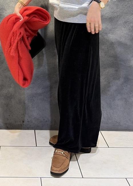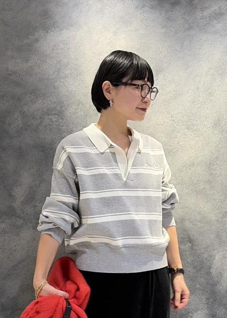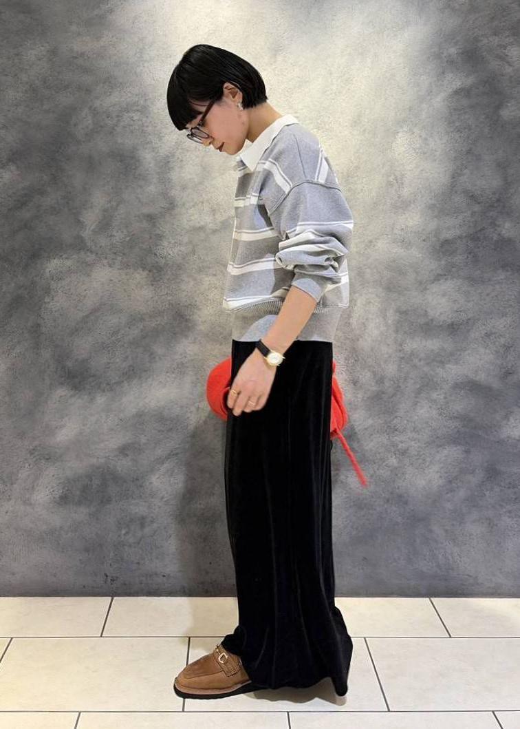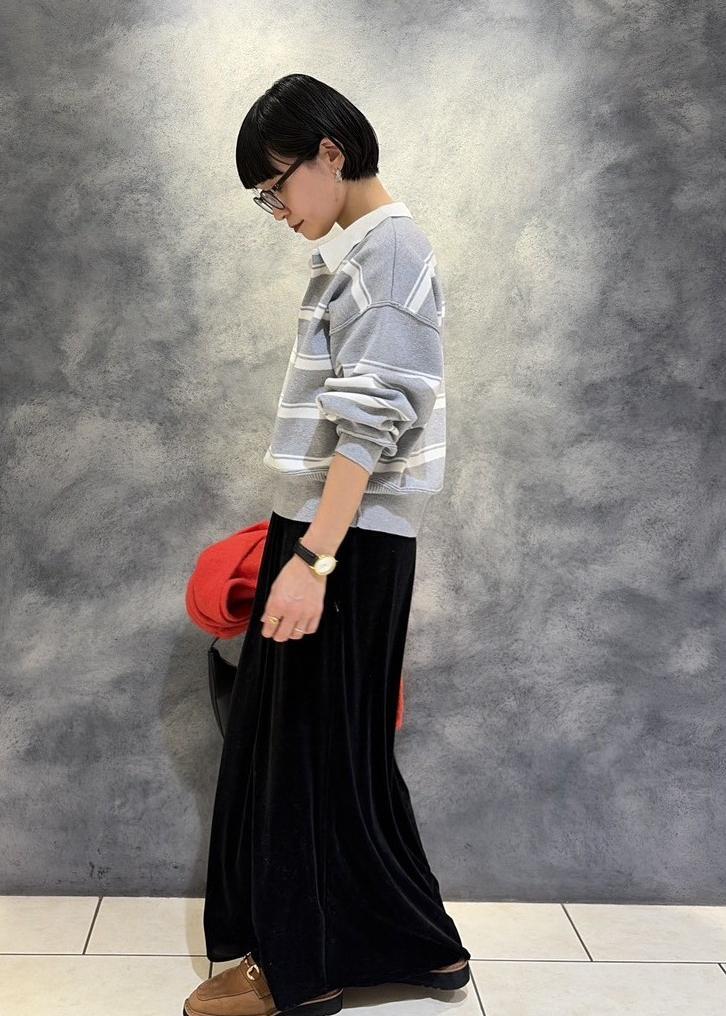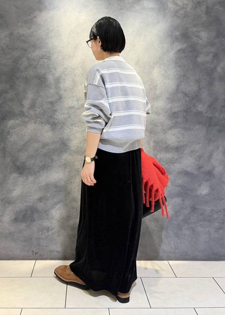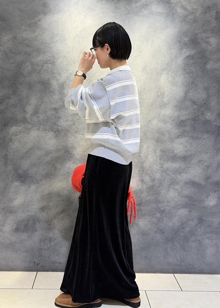 カジュアルになりがちなボーダー柄もベロアの光沢感で