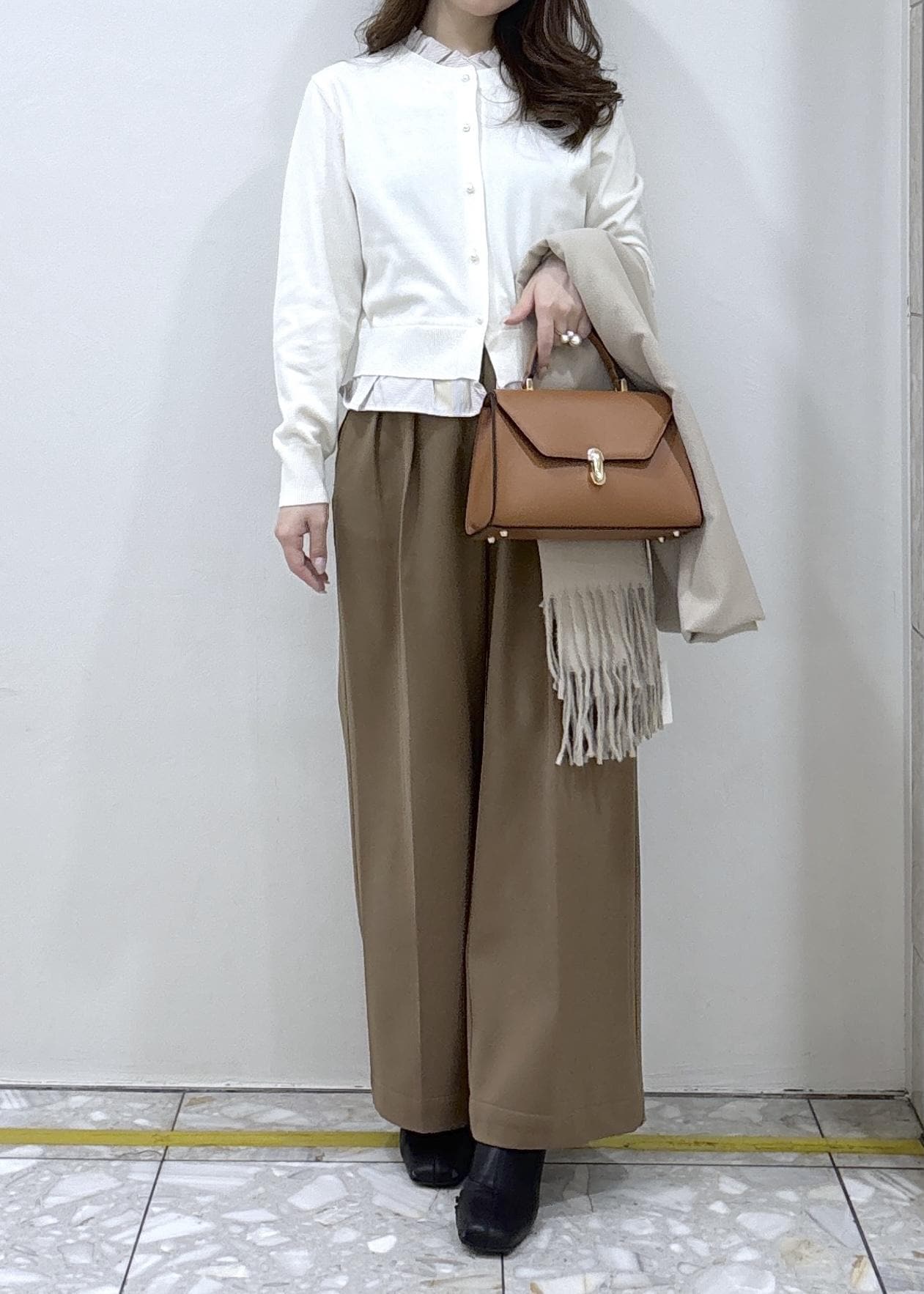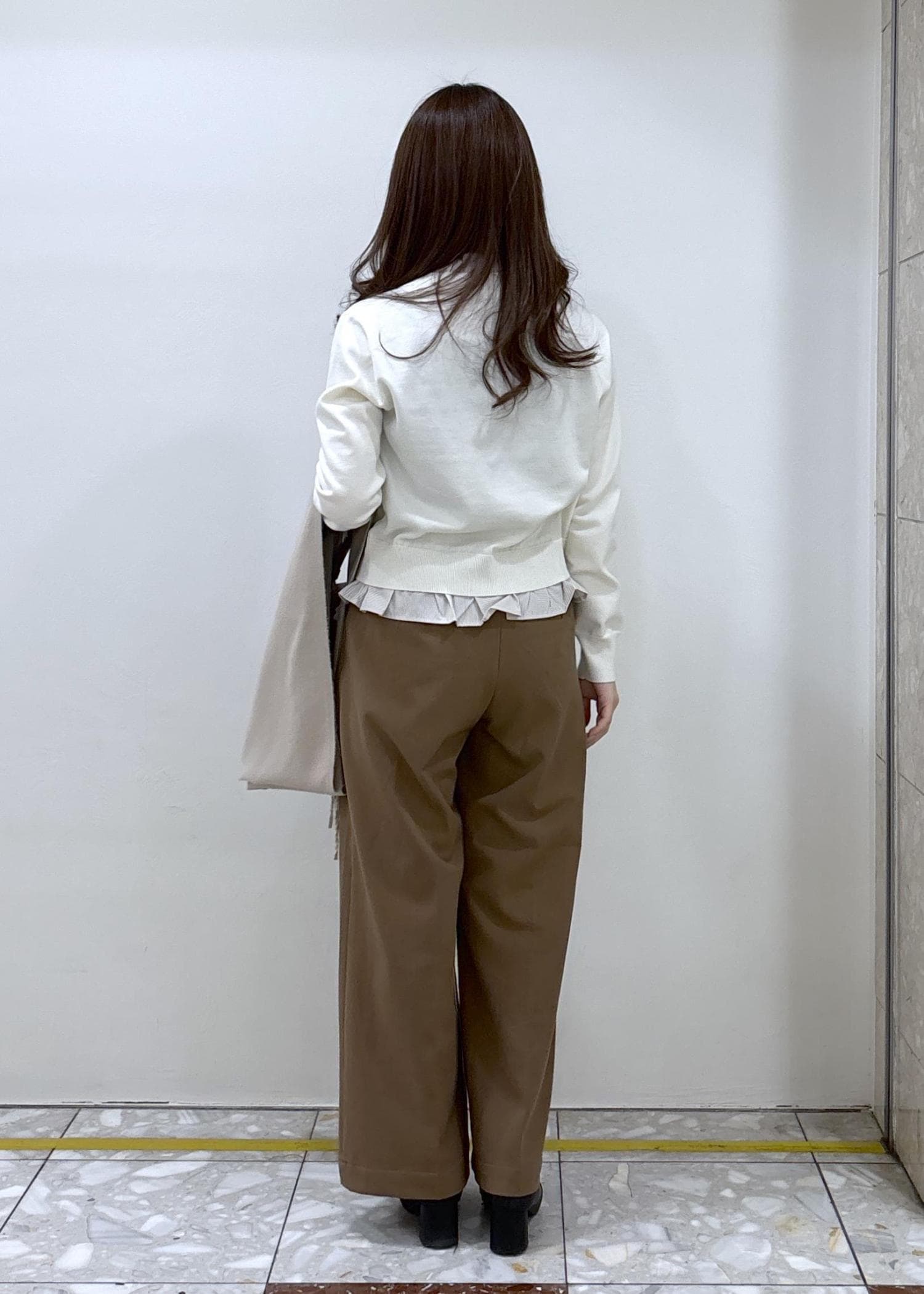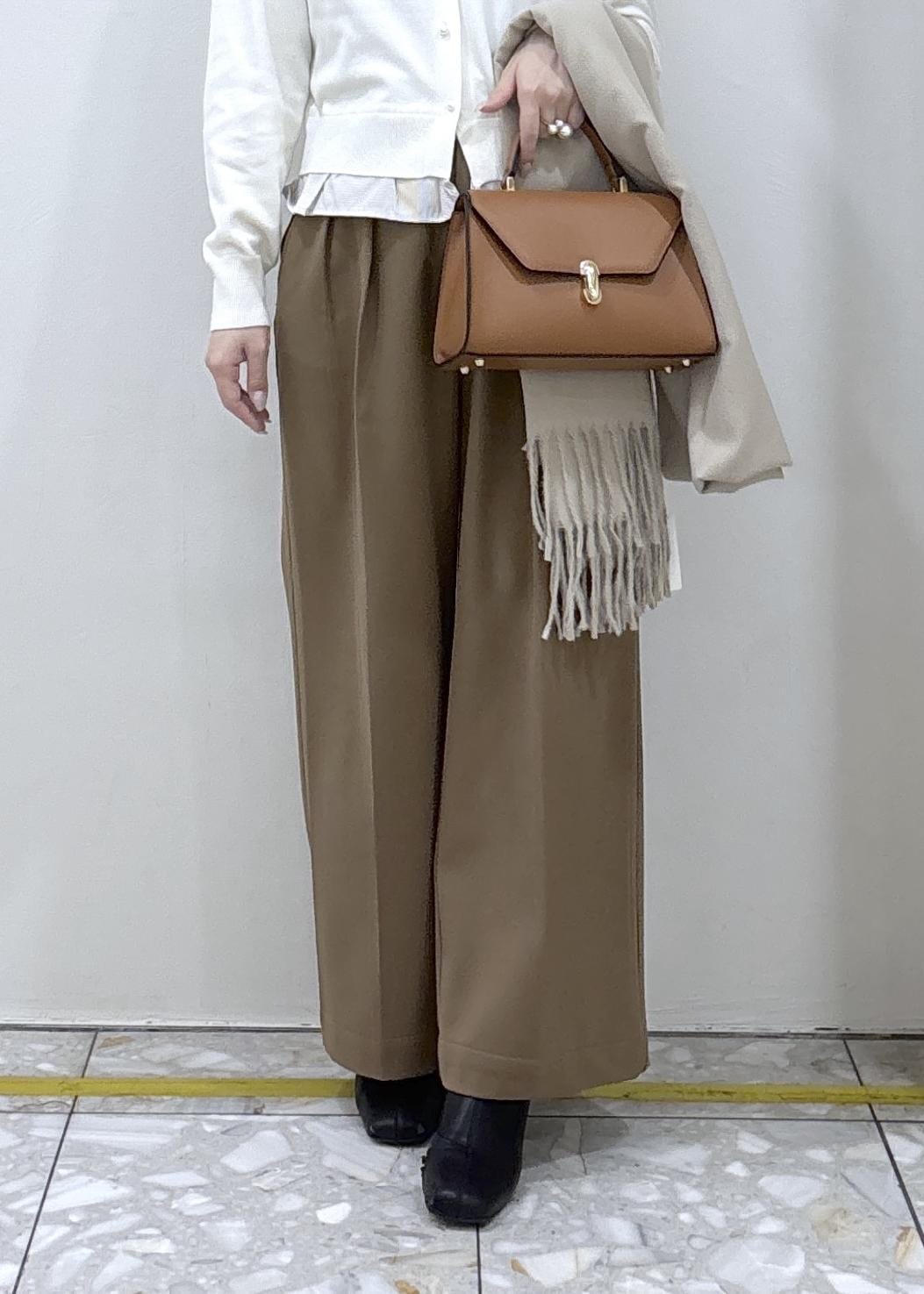 VISHot Beautyツータックワイドパンツ/イージーケアキャメル / S¥6,589レビュー158cmSサイズ着用。太めのウエストマークで、メリハリも◎裏起毛付きで暖かく快適な着用感です◎