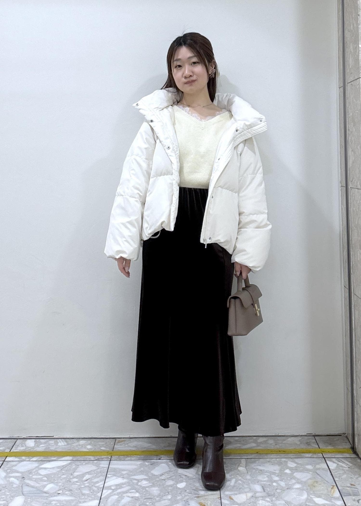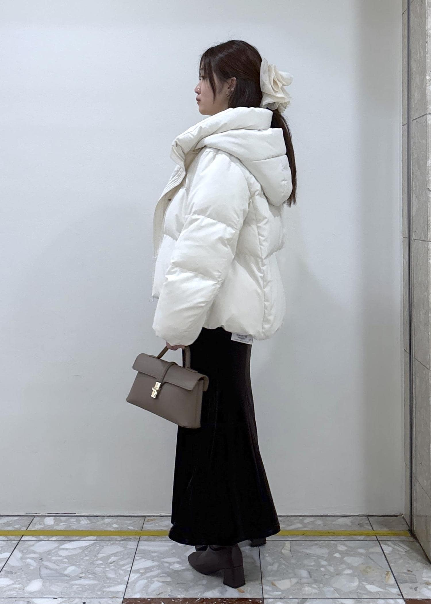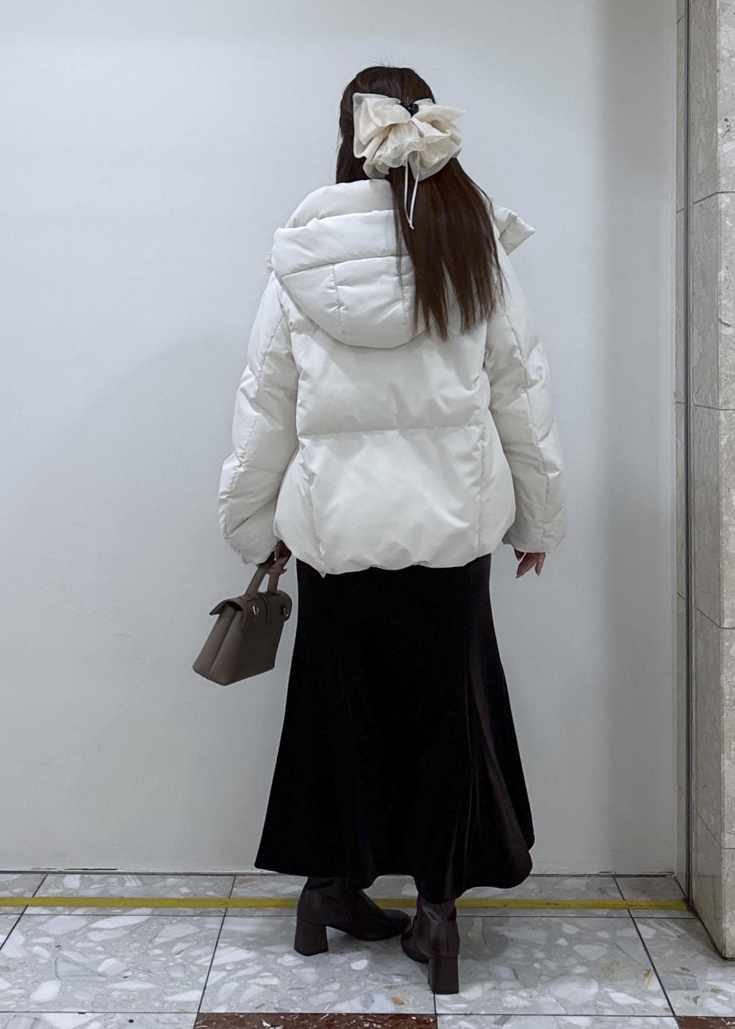 とにかく軽くて、試着しただけでもかなり暖かかったです!フード取り外し出来るのと、内側に絞りがあるのでボリューム感を調節できますが、何もせずに着用で後ろはヒップが隠れるくらいの丈感でした! -
