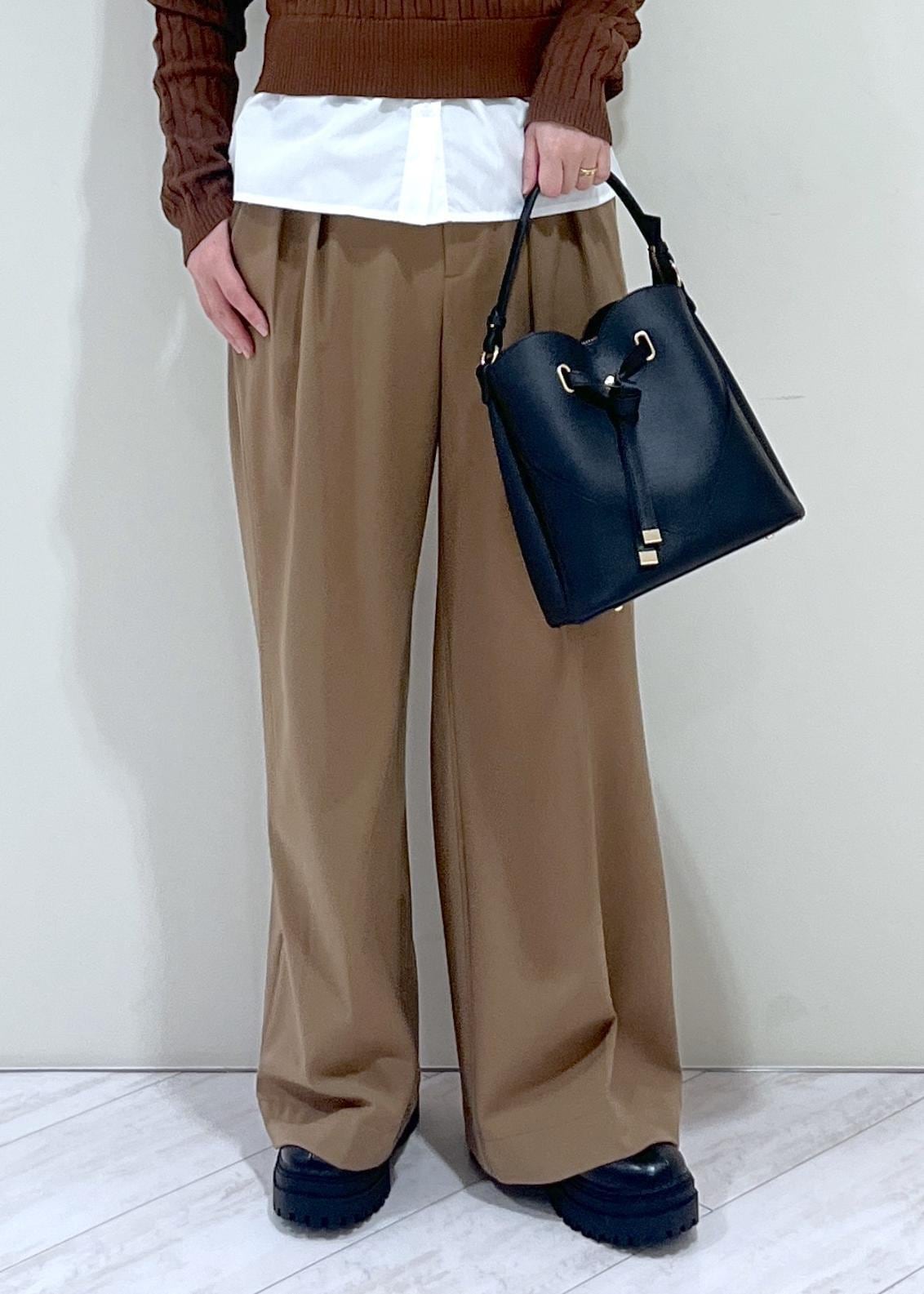 2タック入りのワイドパンツでセンタープレスも効いて脚をきれいに見せてくれます。