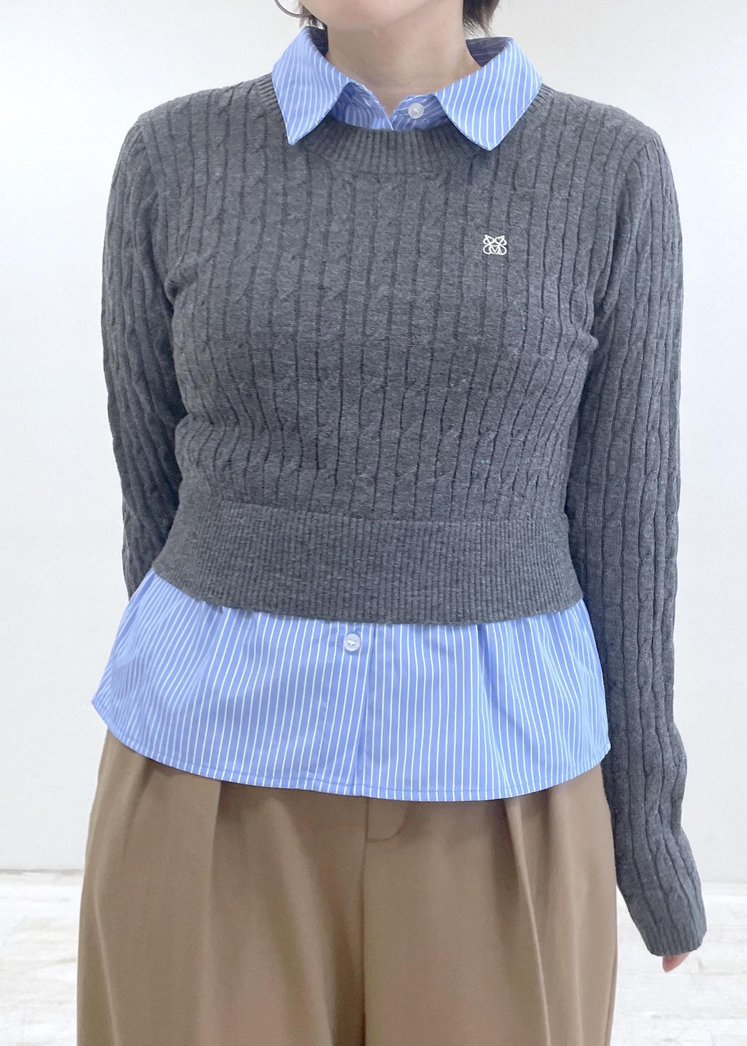 NEW!VIS【美得】ハイゲージケーブシャツドッキングプルオーバーチャコール / F¥5,489レビュー襟と裾にシャツがドッキングされており、重ね着の手間なく、簡単にレイヤード風のスタイリングが楽しめます!