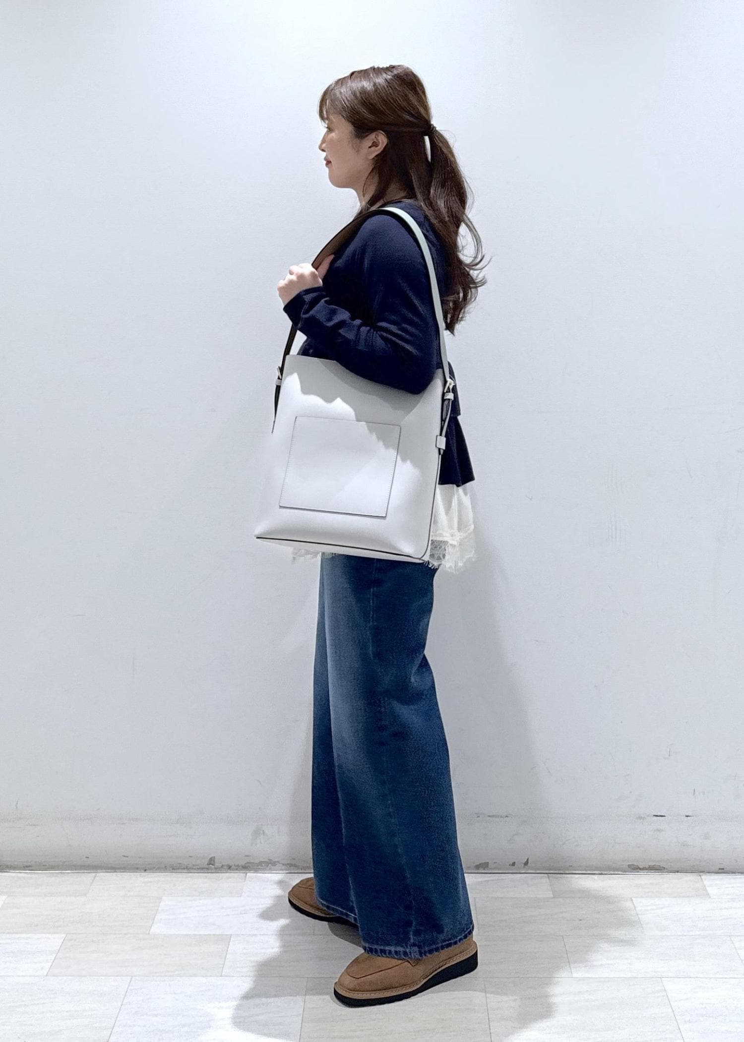 骨格ストレートなので腰の位置ですと上半身が大きく見えるため、敢えて重心にインナーを着て長さ出しをしています。