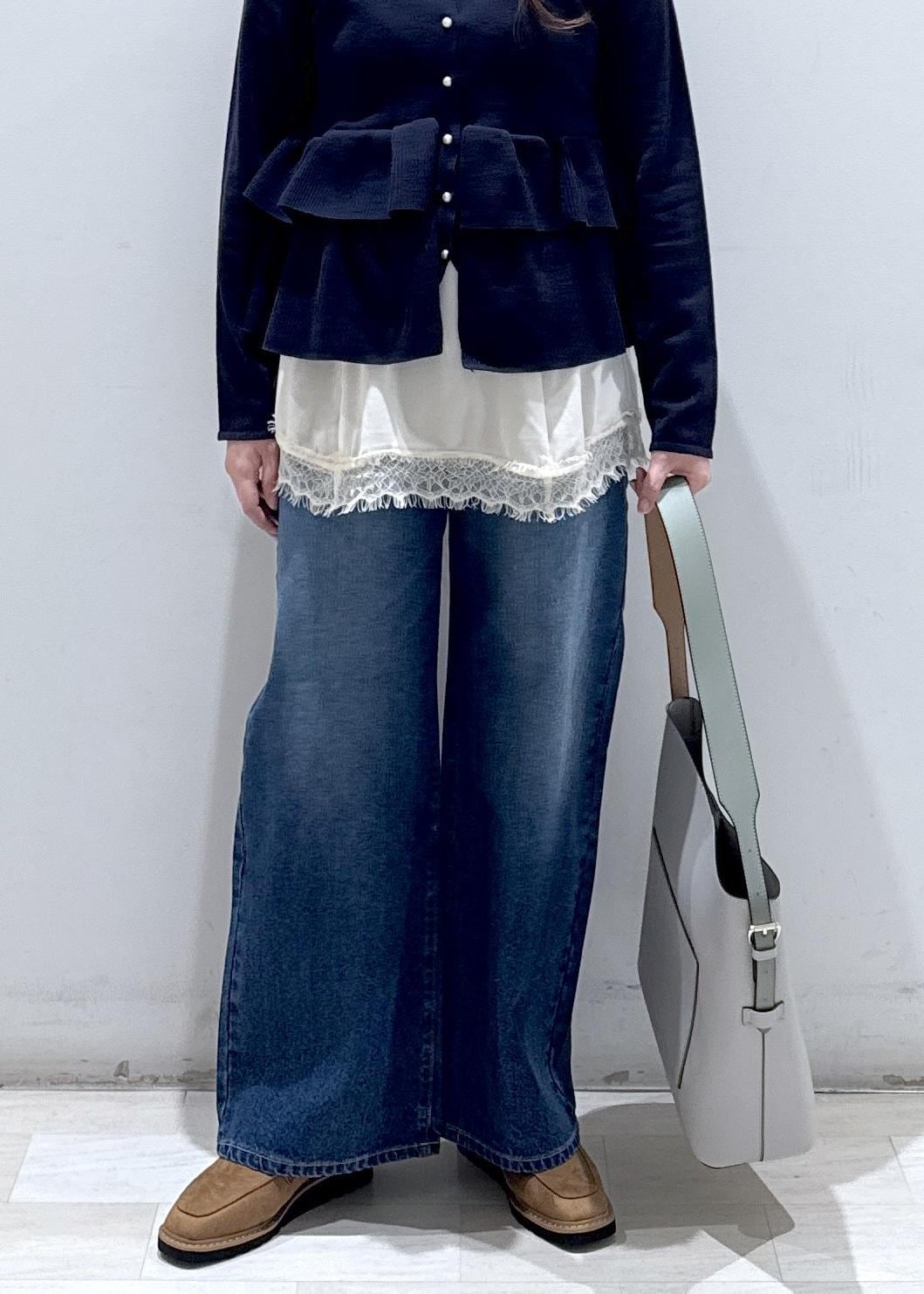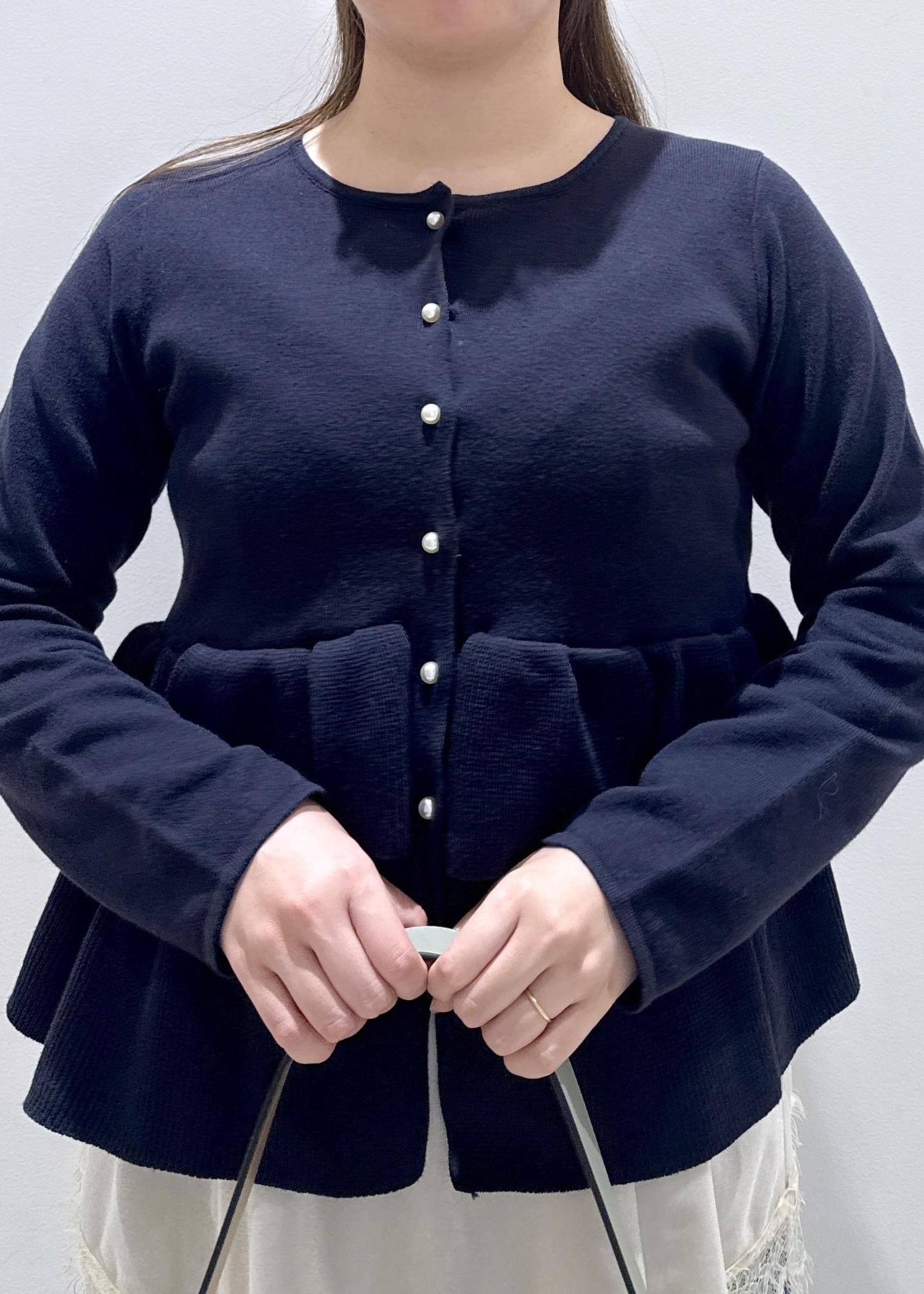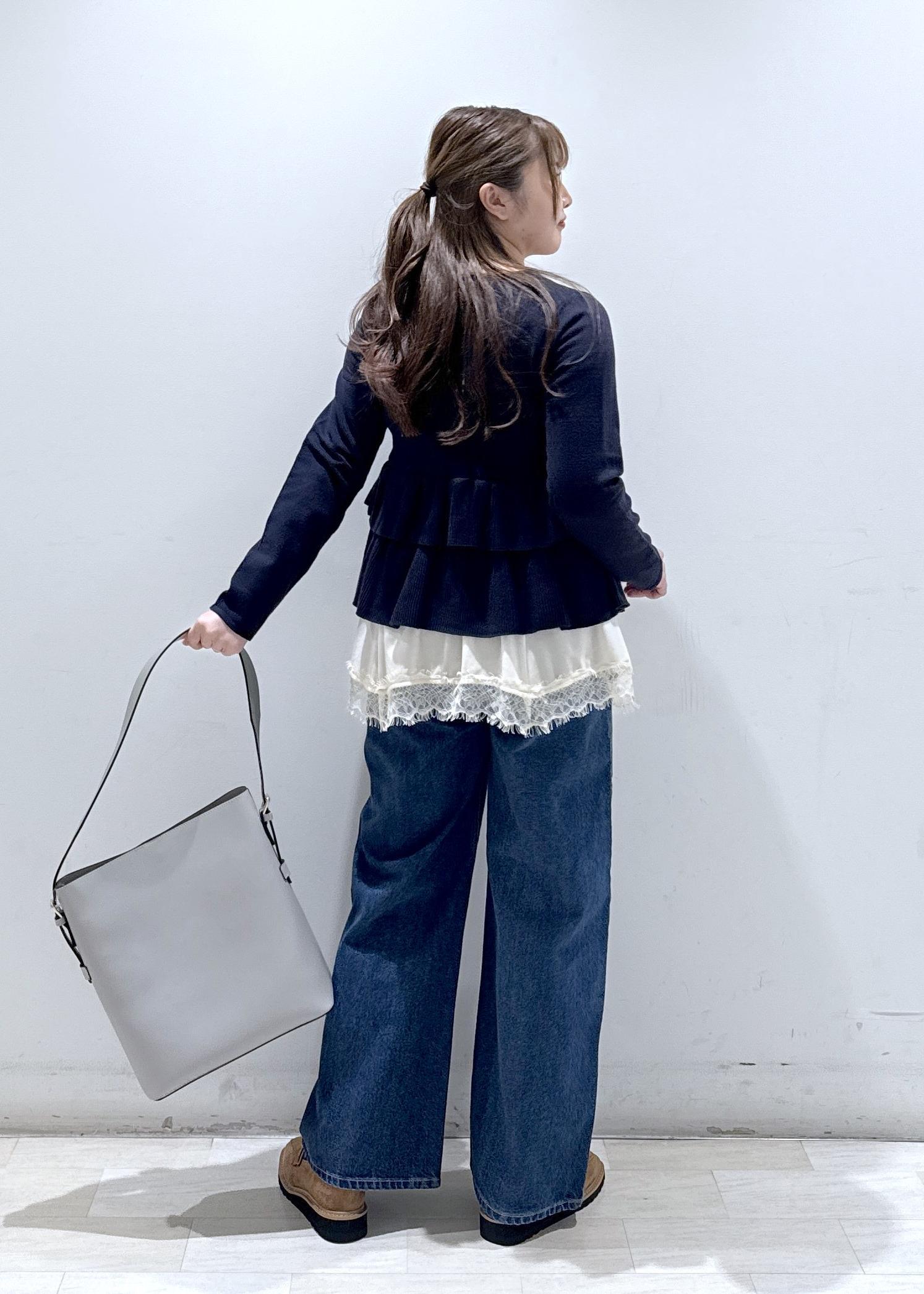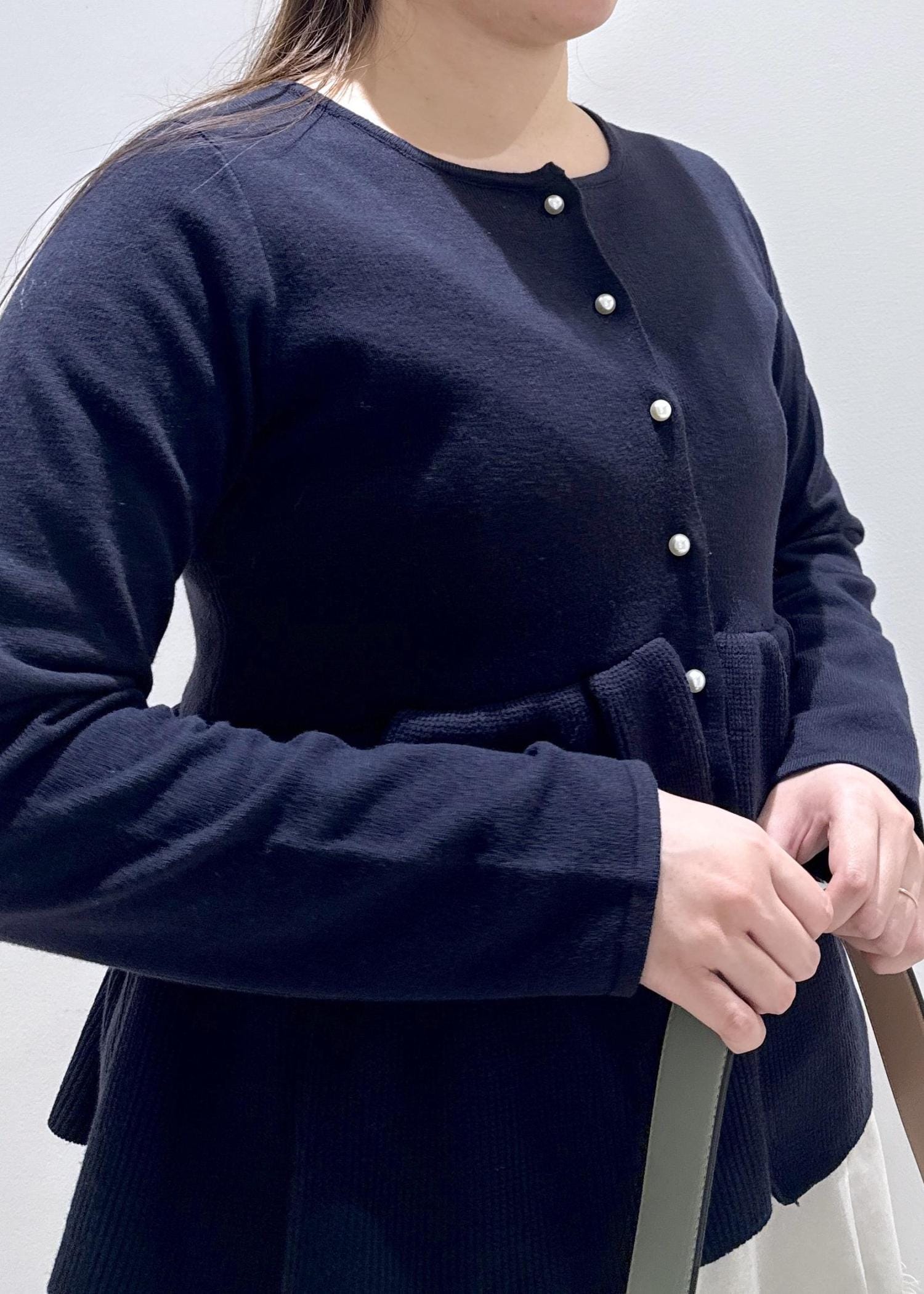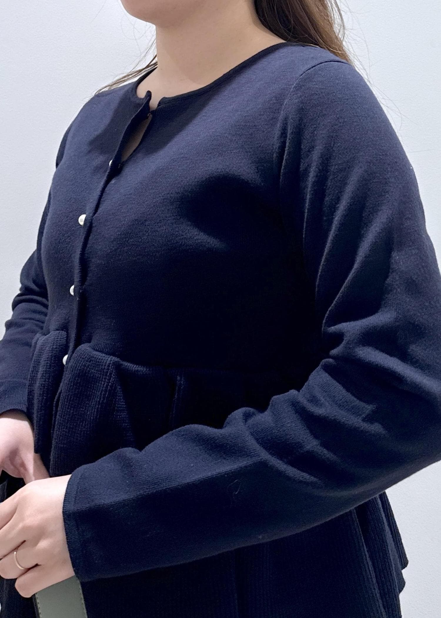 今回は新作で入荷しましたティアードデザインのペプラムカーディガンに、ベロア素材のインナーを合わせてレイヤードスタイルにしてみました。
