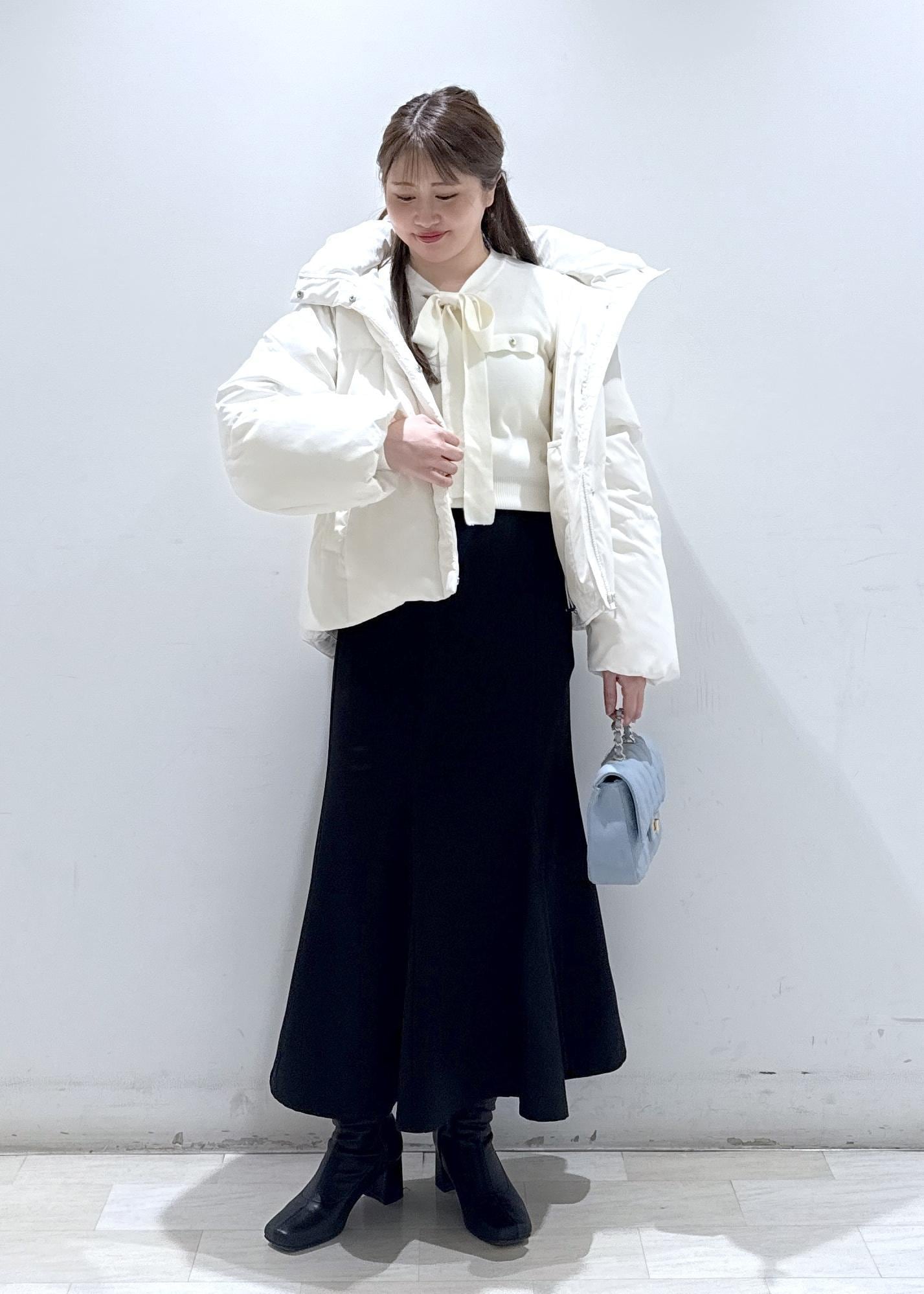 今回は新作で入荷しましたボウタイニットのトップスに、ウーリッシュのマーメイドスカートと合わせて綺麗めなコーディネートにしてみました。大人な方でも上品に見えるリボンなので、どのシチュエーションにも使えると思います。