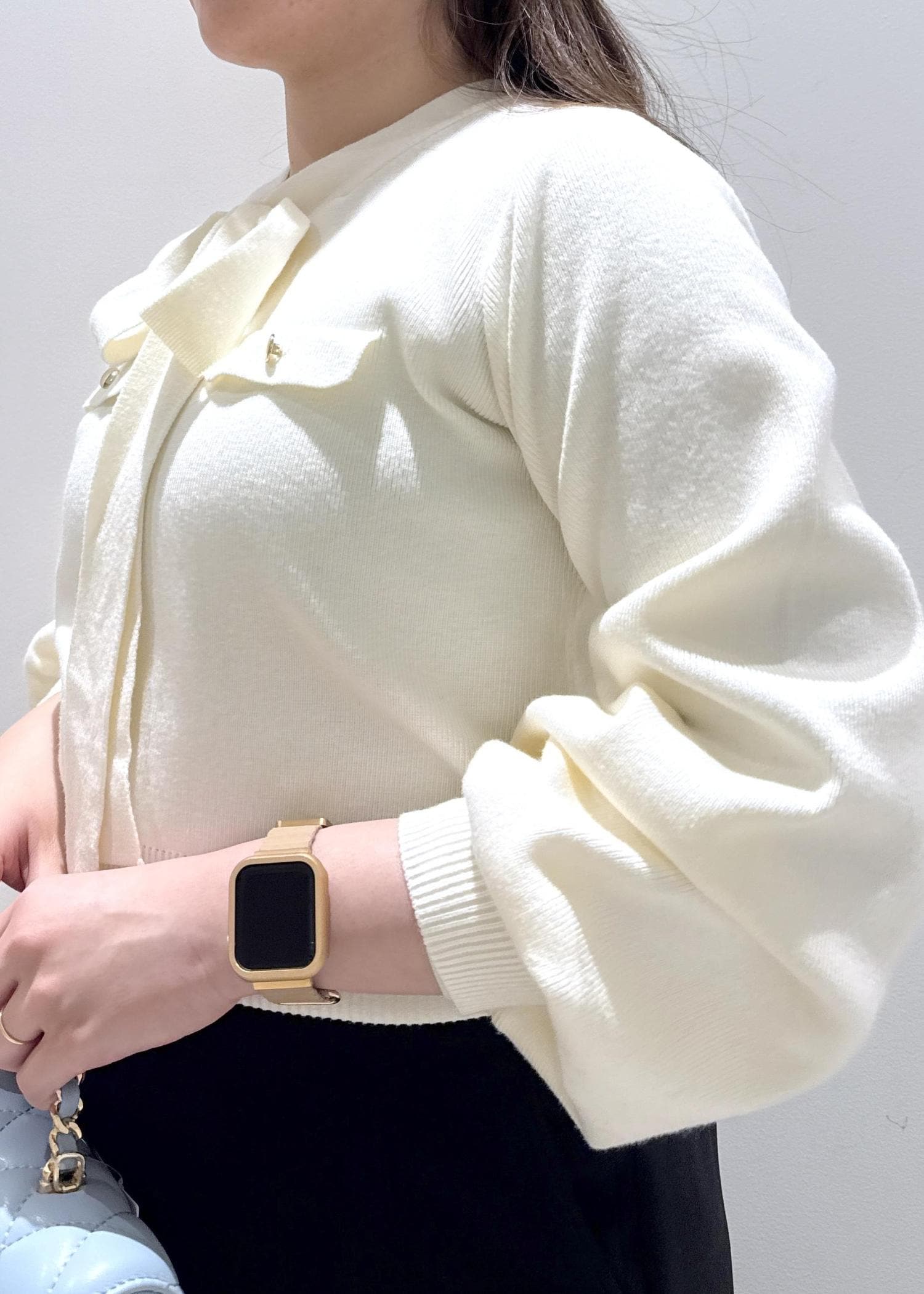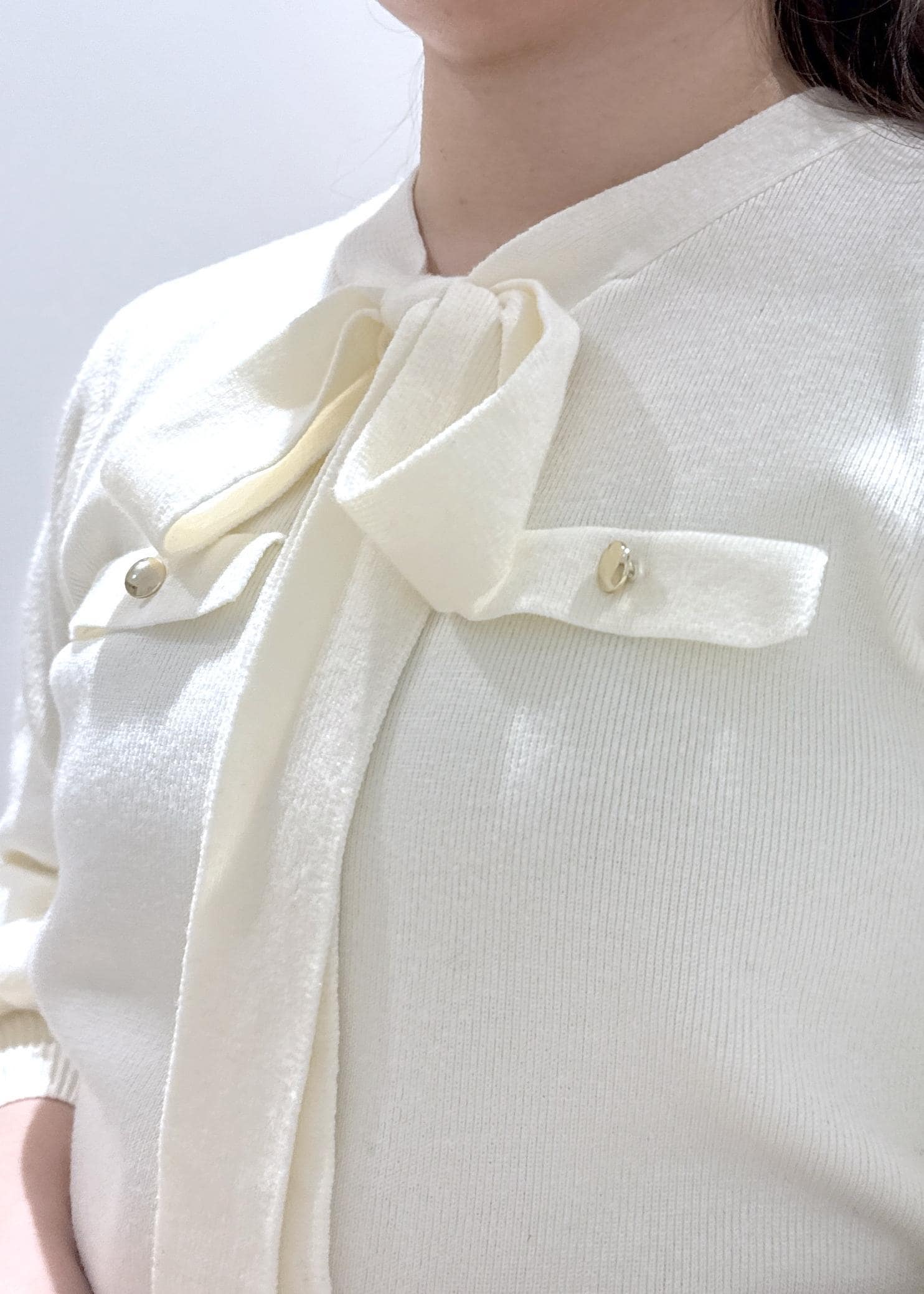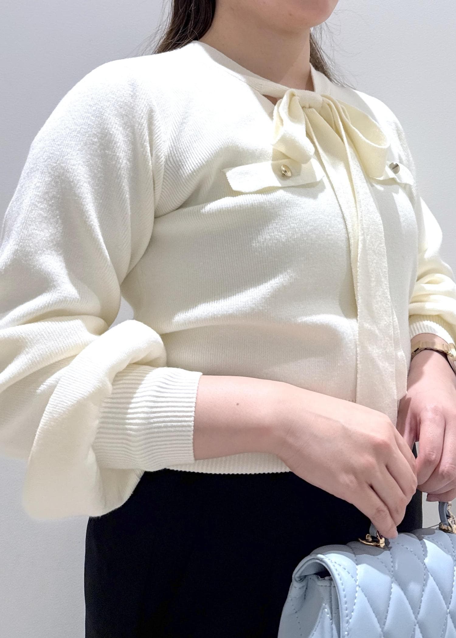 肌触りの柔らかいニット素材に、品よく見えるリボンが甘過ぎなく大人な方でも綺麗に着れます。