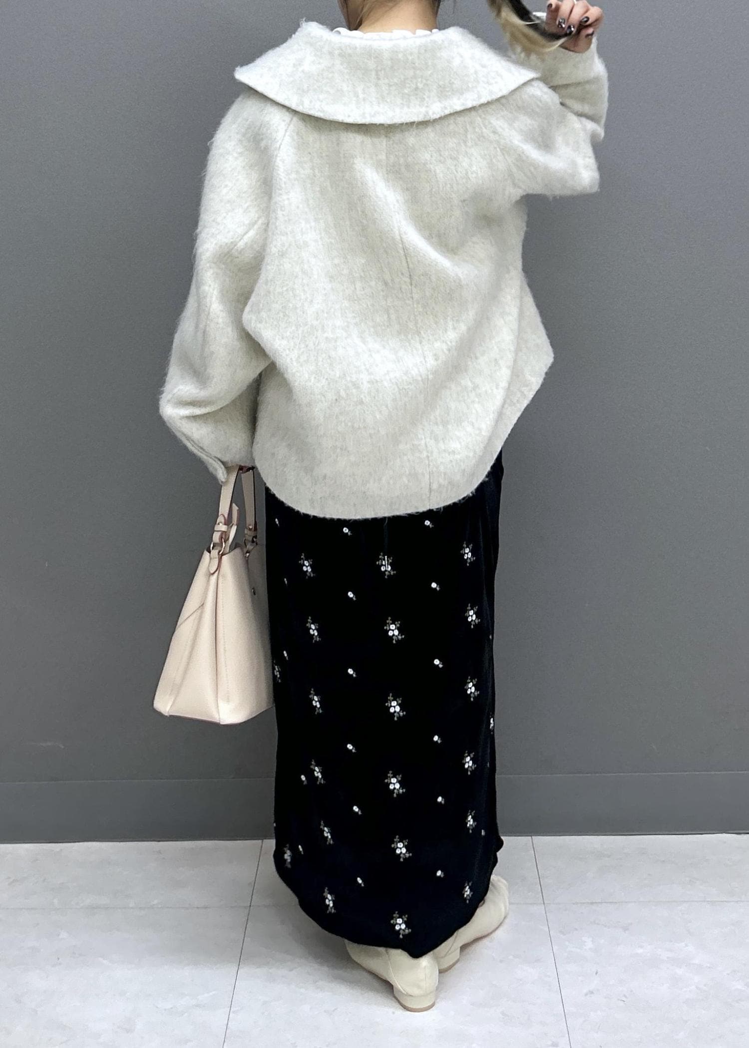 襟が肩のラインにかかるくらい大きめなので、なで肩でもシルエットが綺麗に決まります◎ -