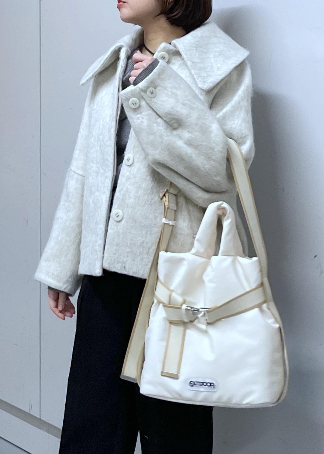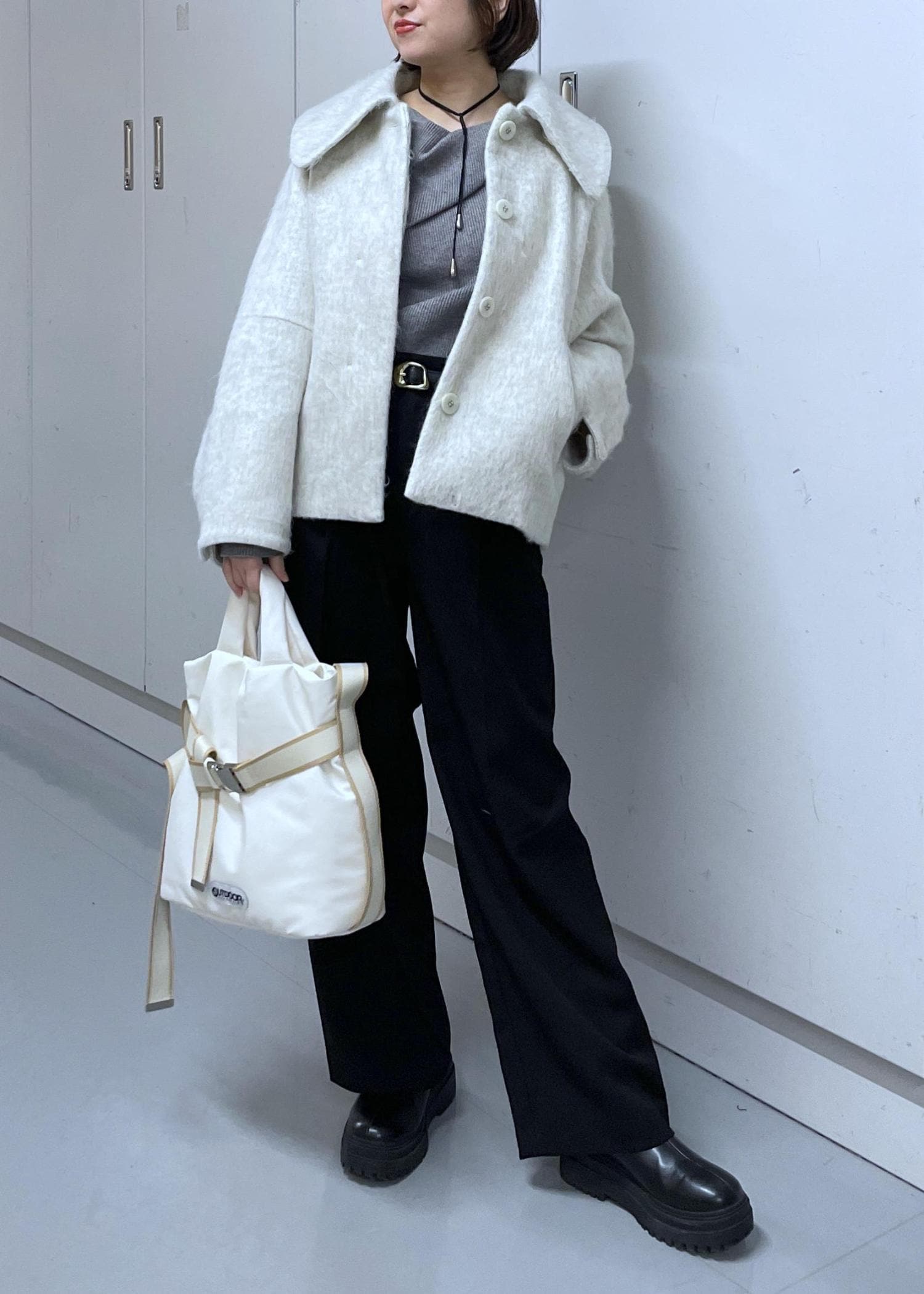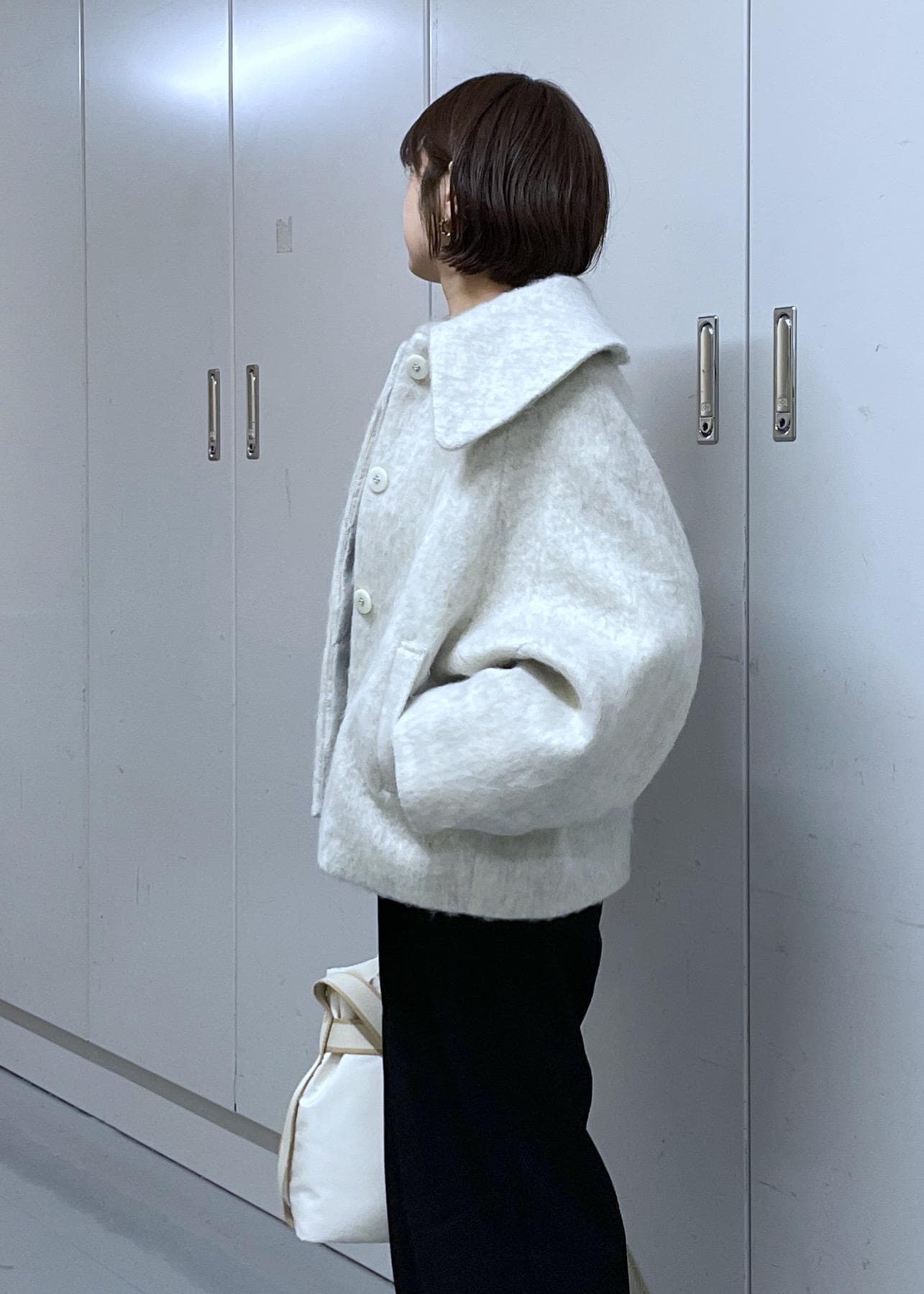 VIS【アウター総選挙1位】ビッグカラーモモンガシャギーショートコートオフホワイト / S¥10,989レビュー身長156cm、Sサイズ着用。