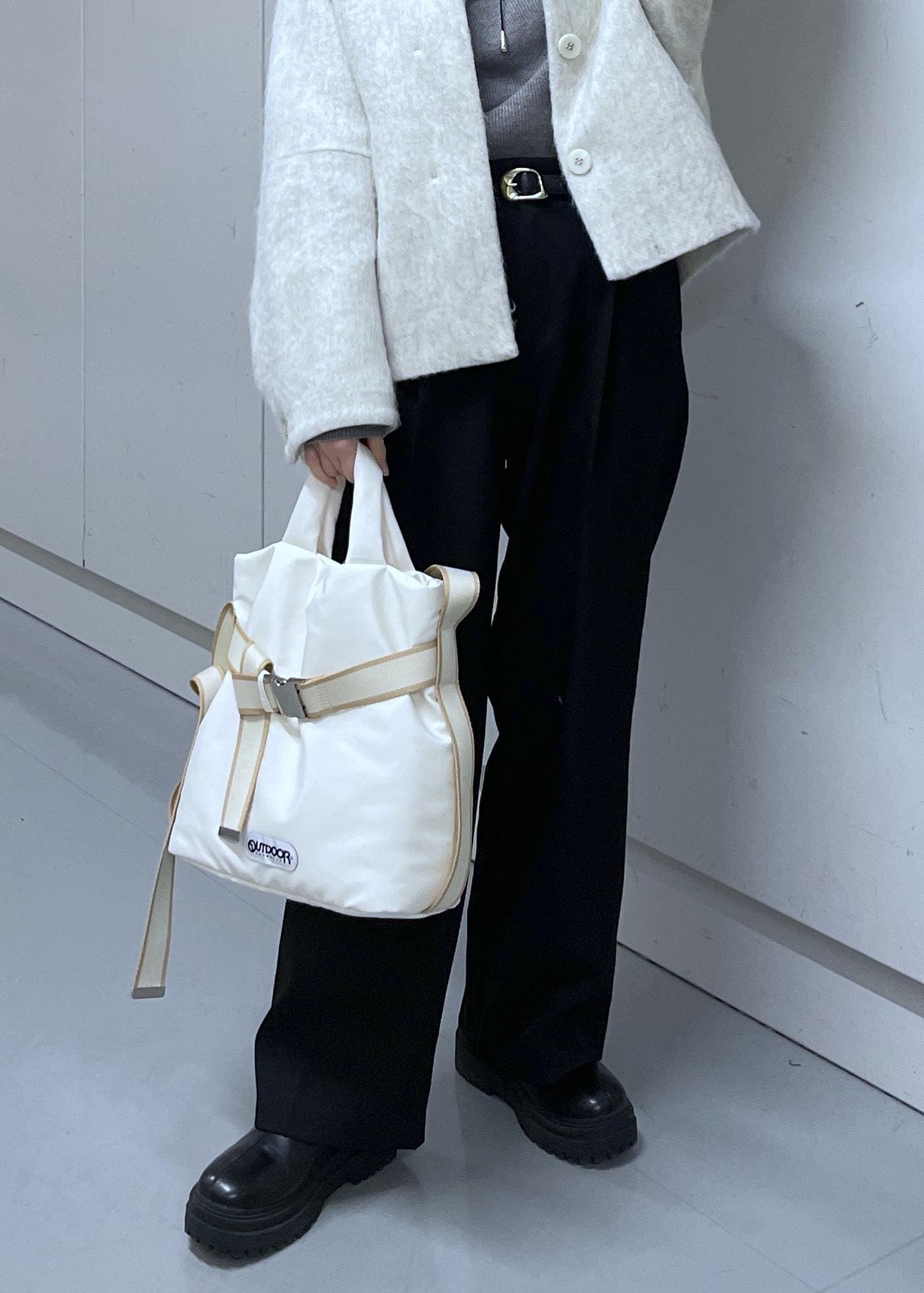 ベルトテープ×バックルのデザインが、シンプルコーデに合わせても様になります。
