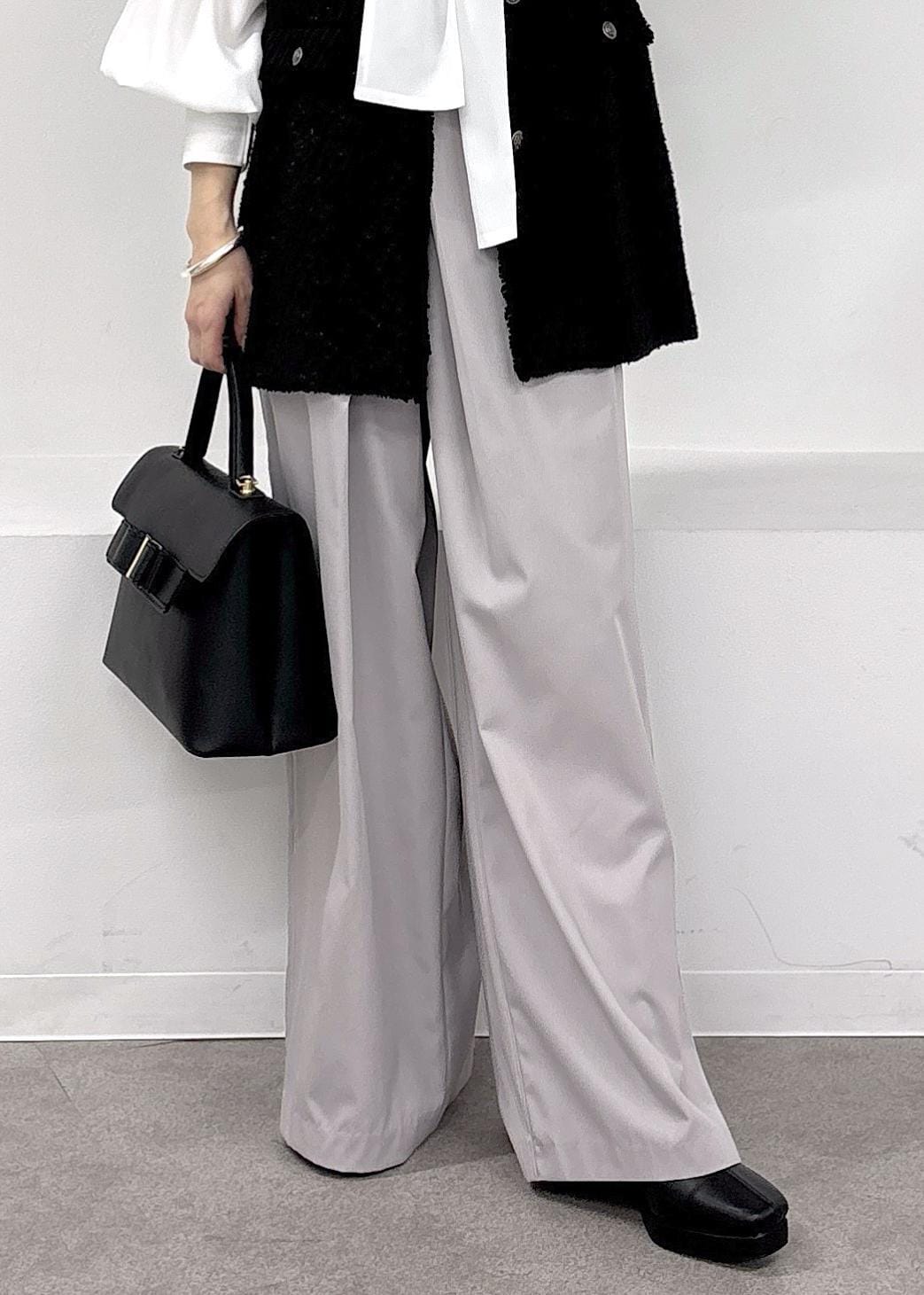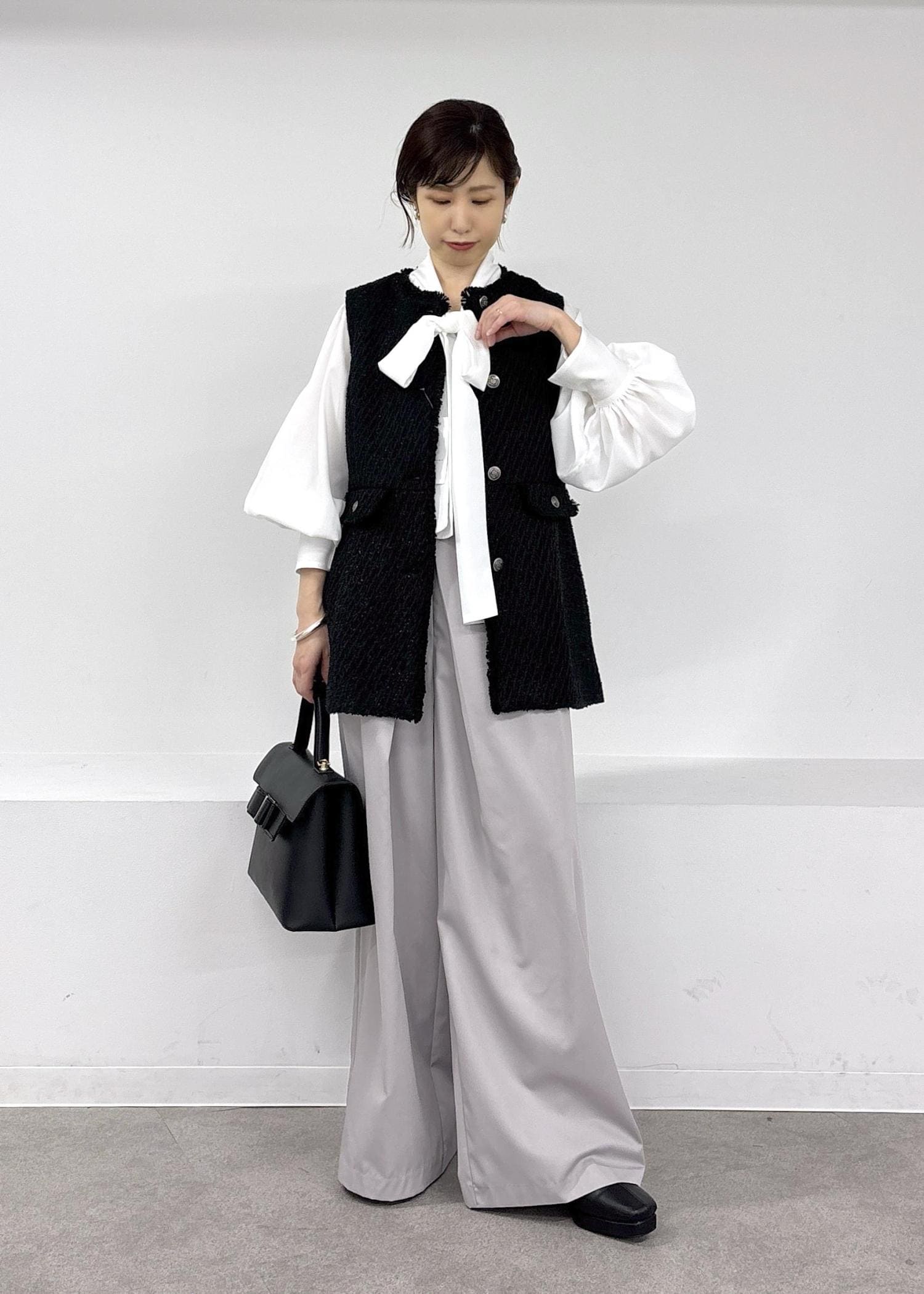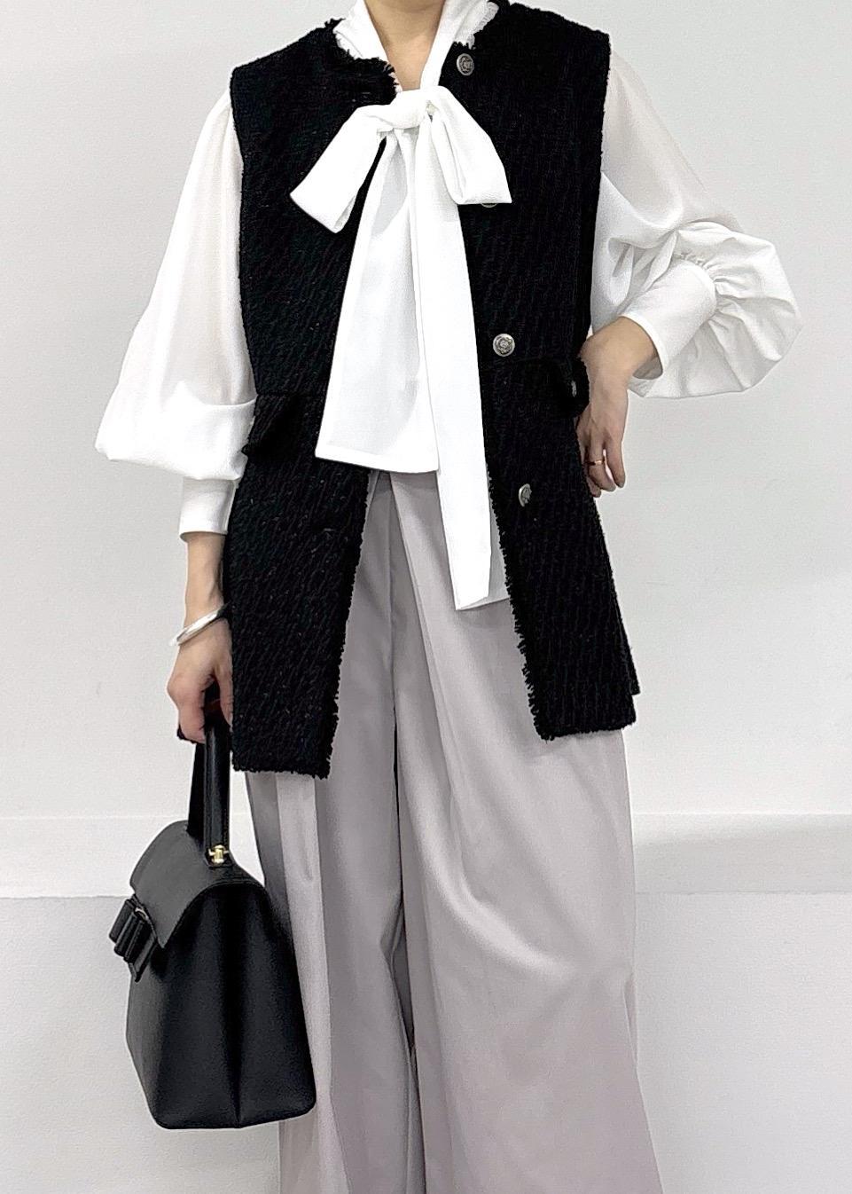 ラメツイードが大人可愛いジレをポイントに、ボウタイブラウス、ワイドパンツで合わせたきれいめスタイル♪卒業式、入学式にも使えるセレモニースタイルで、かっちりしすぎない印象にまとめました◎ジレは一枚あると、ジャケットと違った女性らしい印象見えするので、オススメです♪