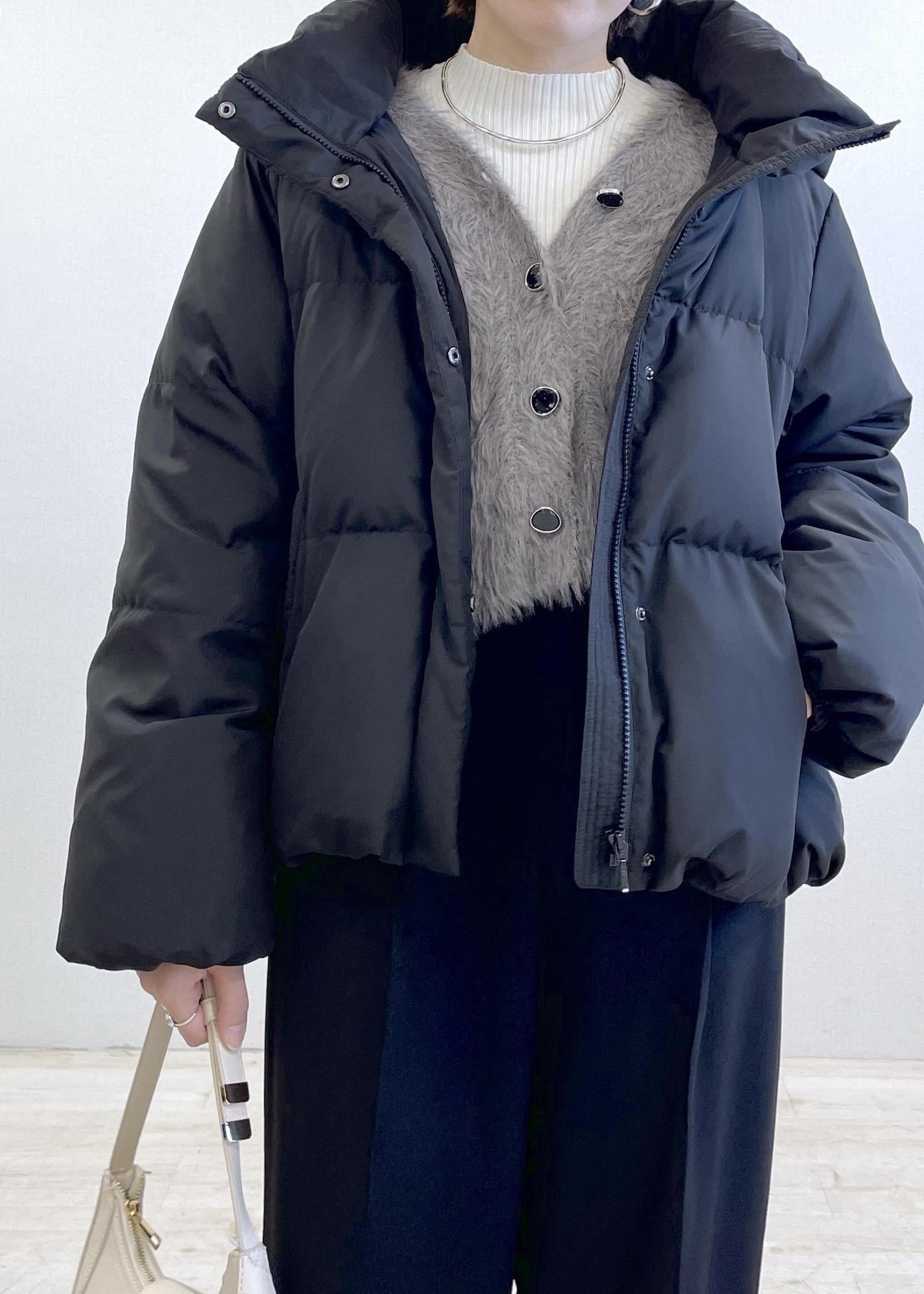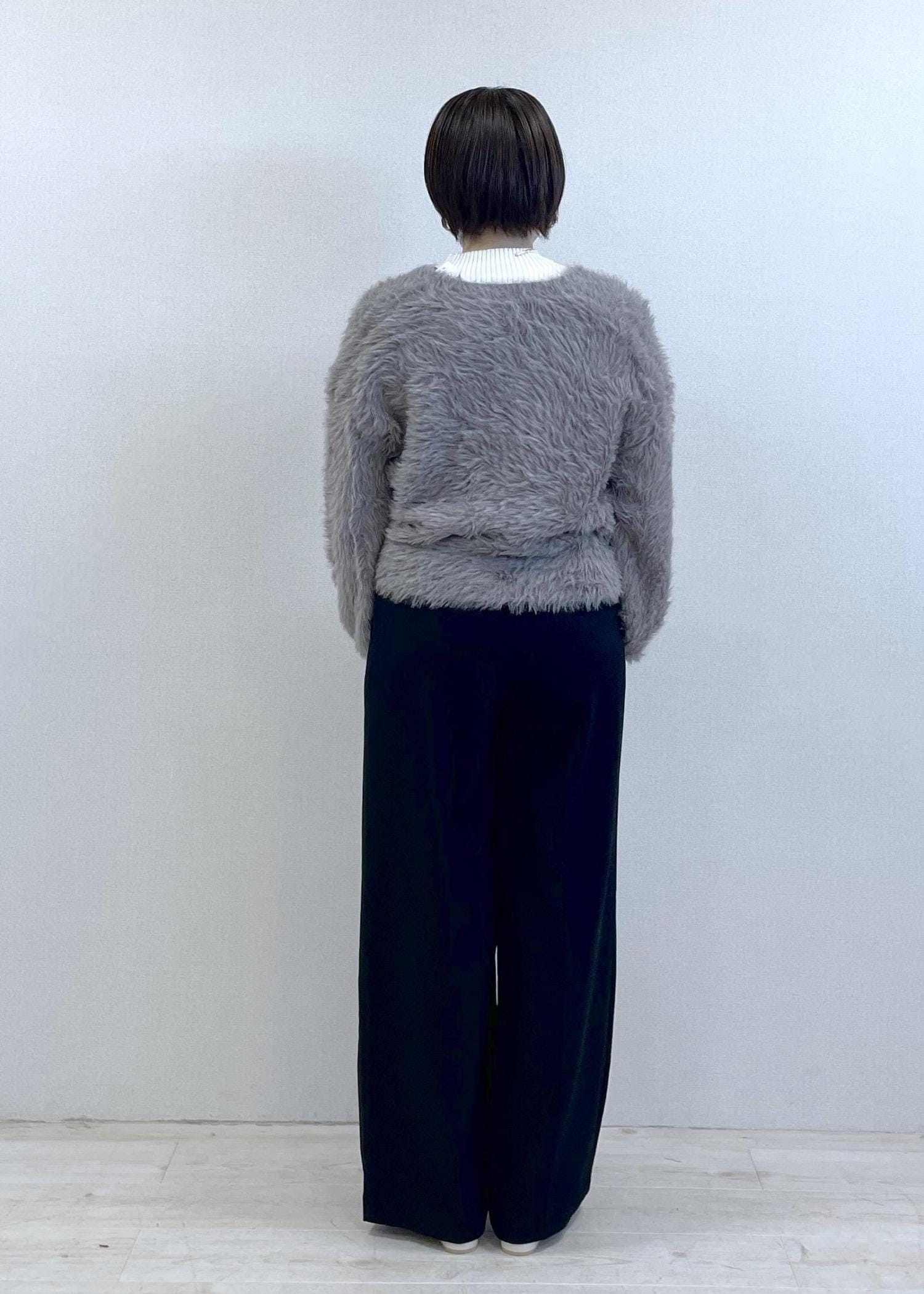 毛足が長くボリューム感がありますが、コンパクトな着丈と、Vネックのデザインがすっきり見えも叶えてくれます。