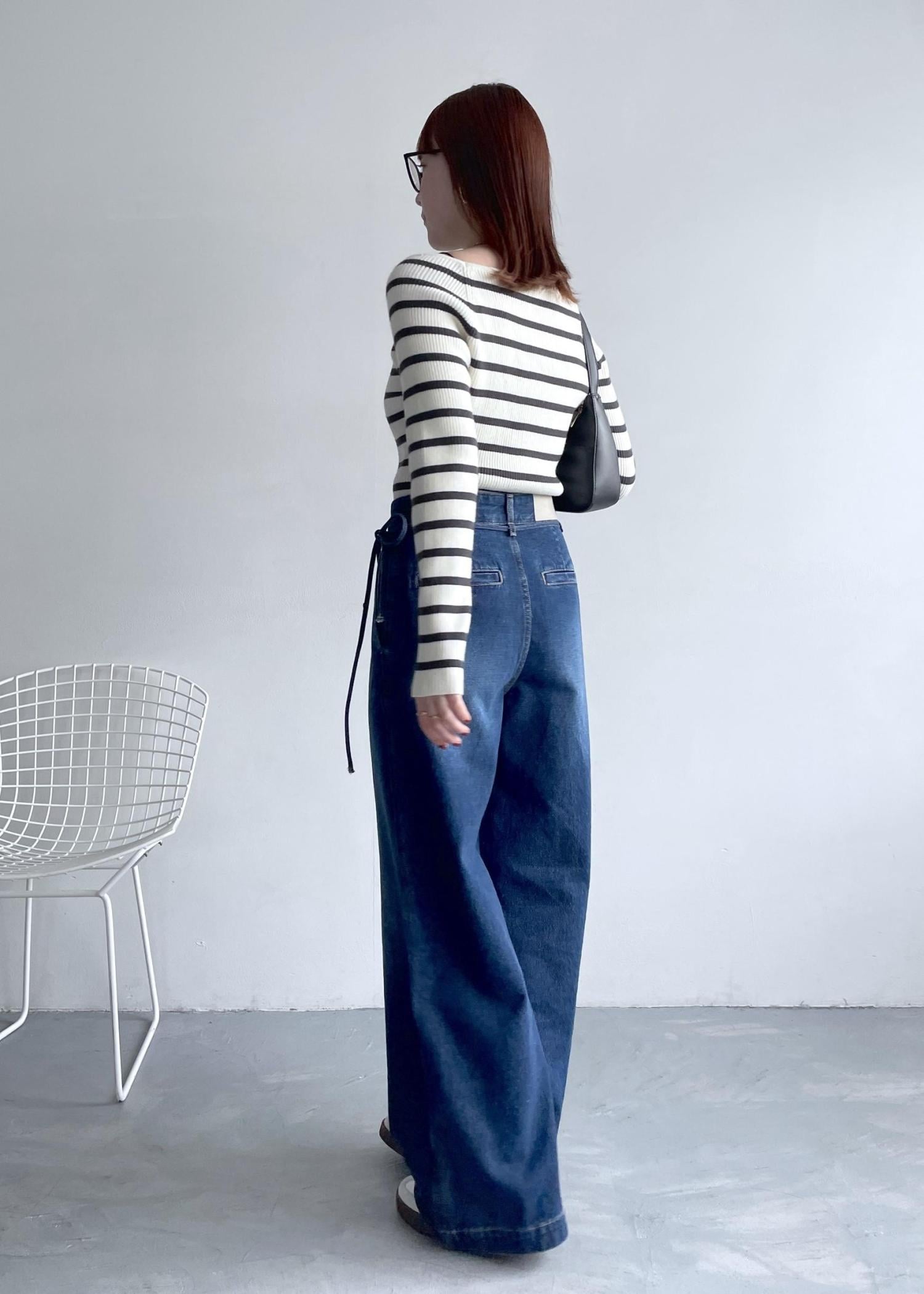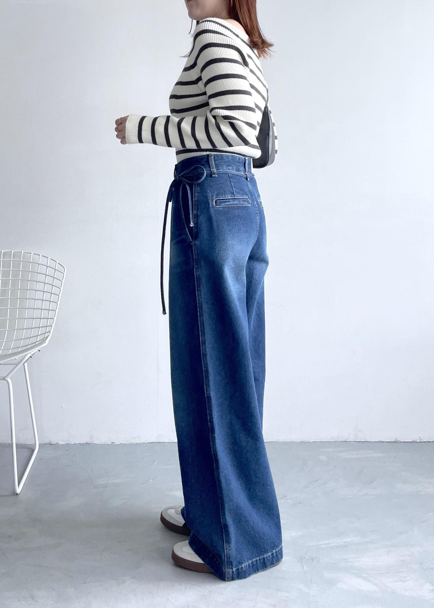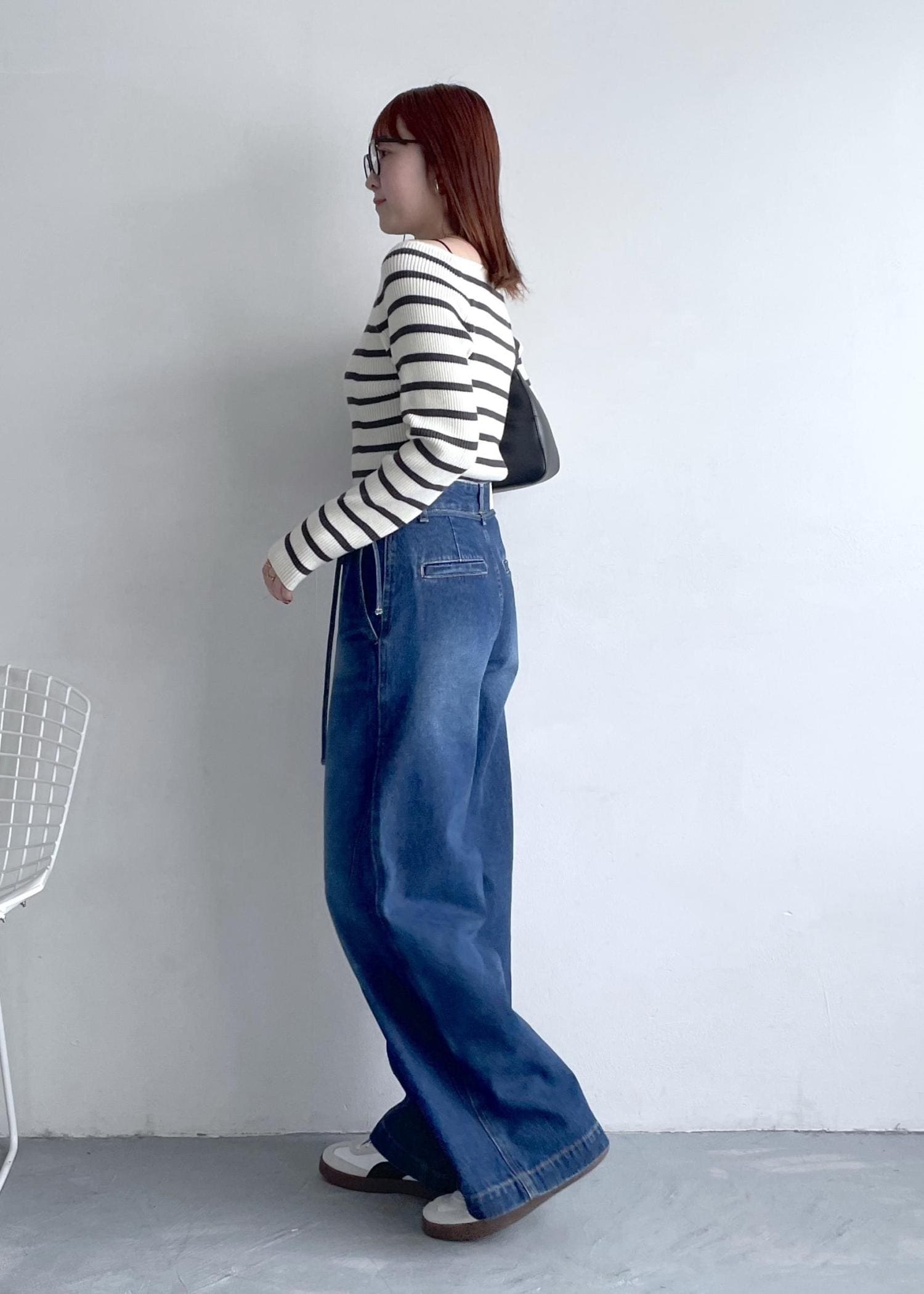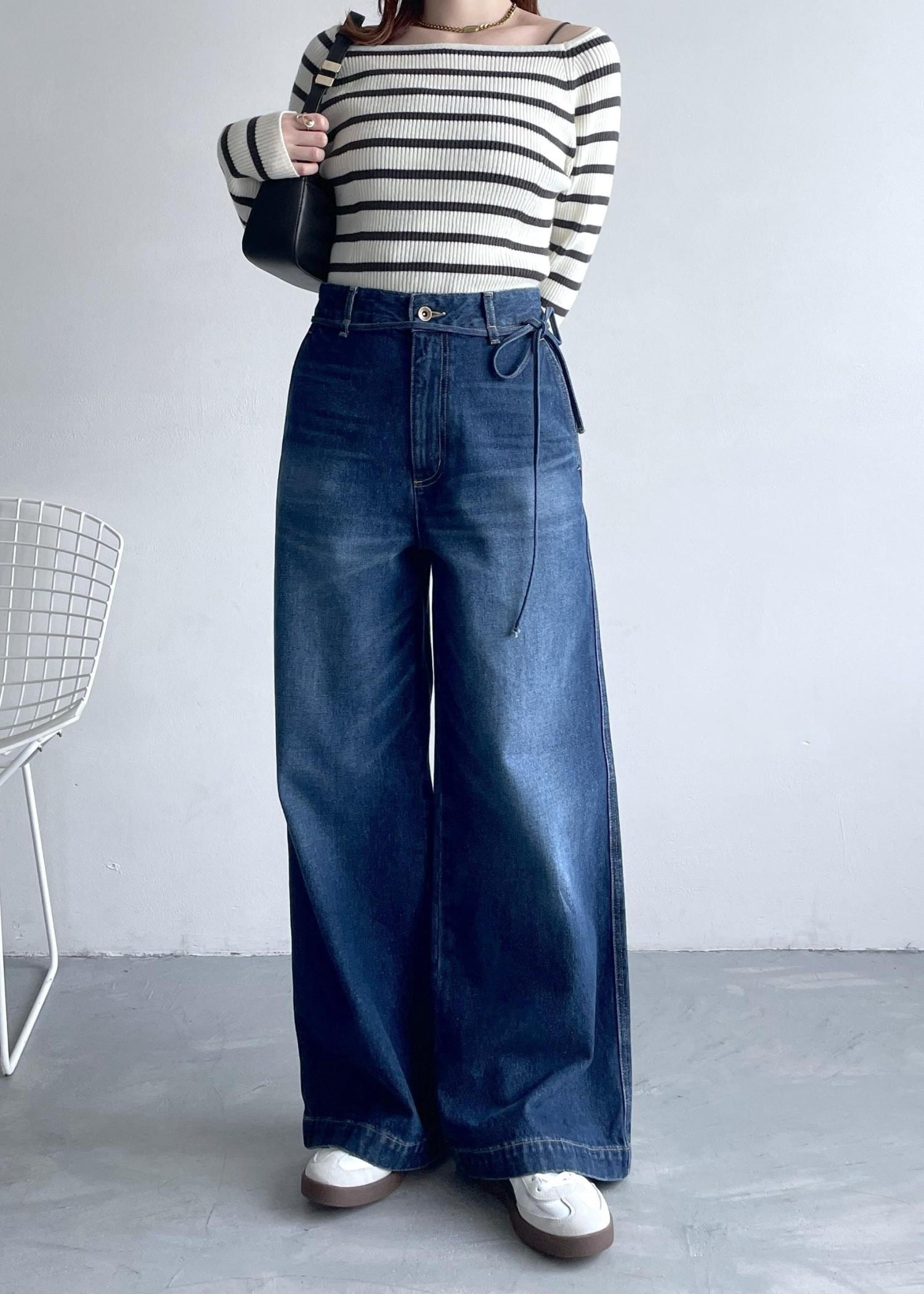 予約VISワイドシルエットベルト付きデニムブルー / M¥8,899レビュー身長159cm/Mサイズ。着用カラーはシーズン関係なく使える万能色、ワイドシルエットですが腰回りはスッキリとスタイルアップ効果も期待できます!ウエストの紐はどの位置で結んでも◎アレンジも可能で飽きが来ず長く履いて頂けるデニムパンツです!