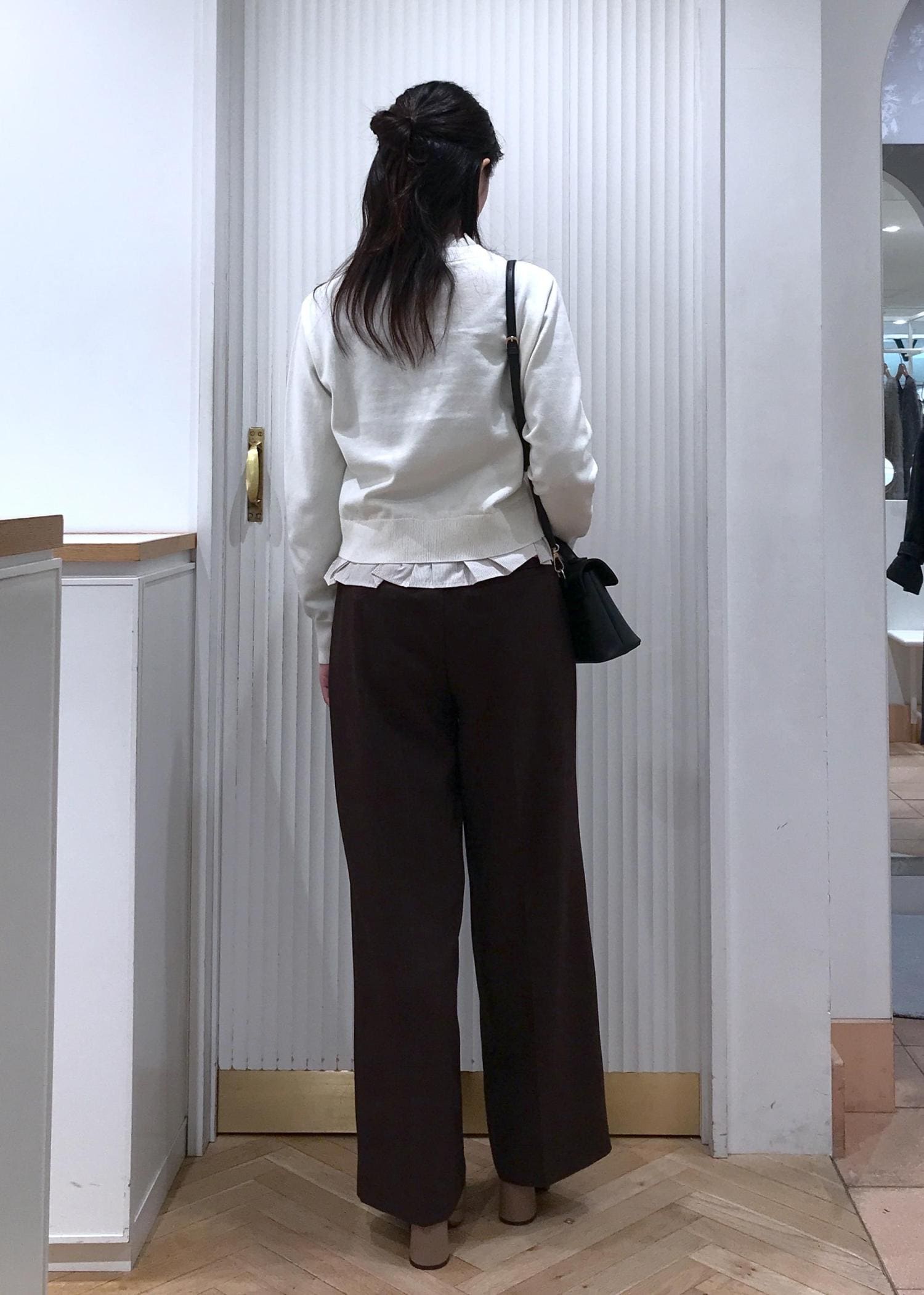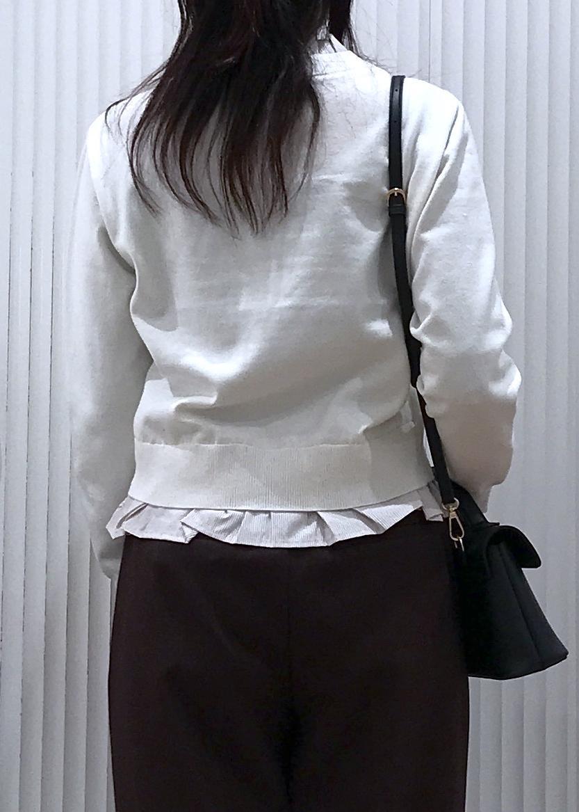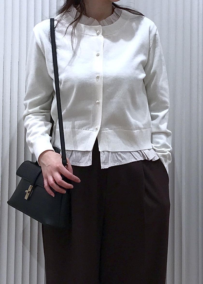 フリル襟ドッキングニットカーディガンコーデ