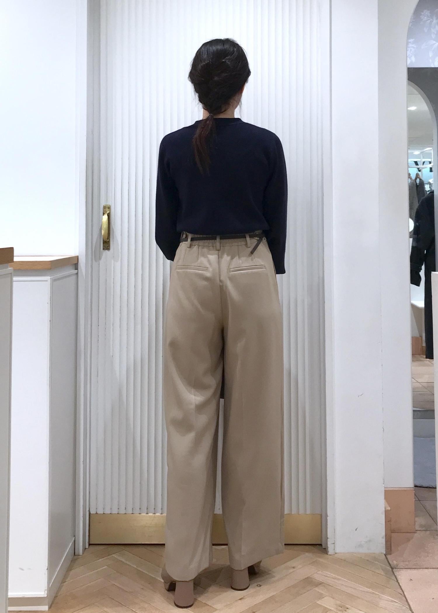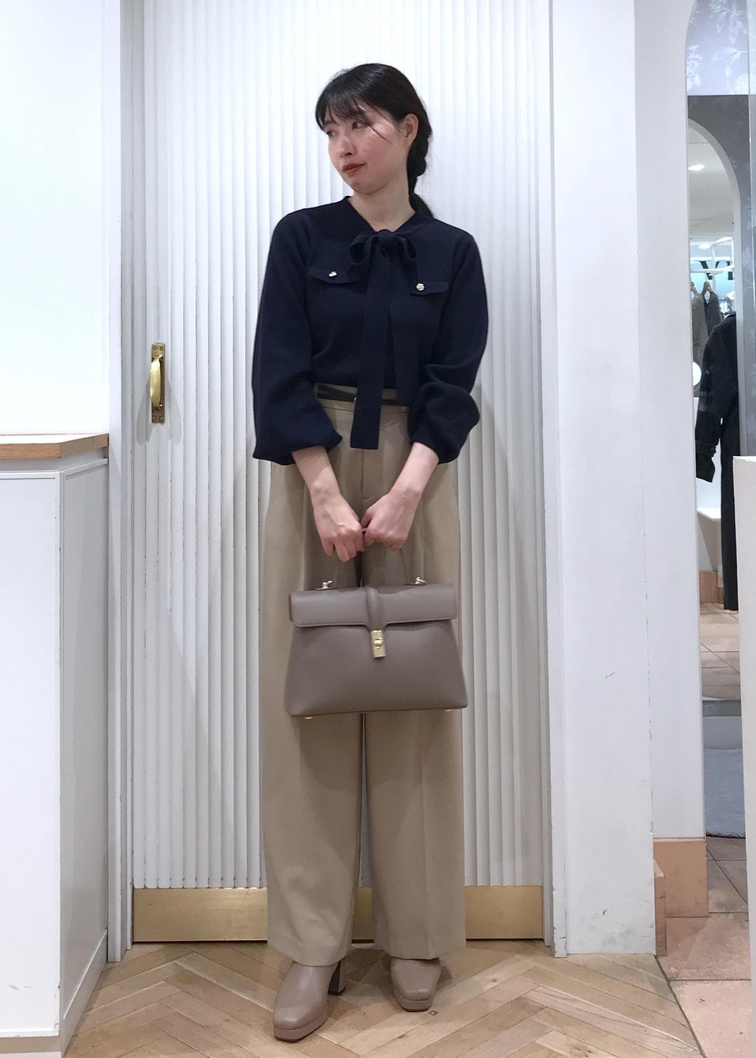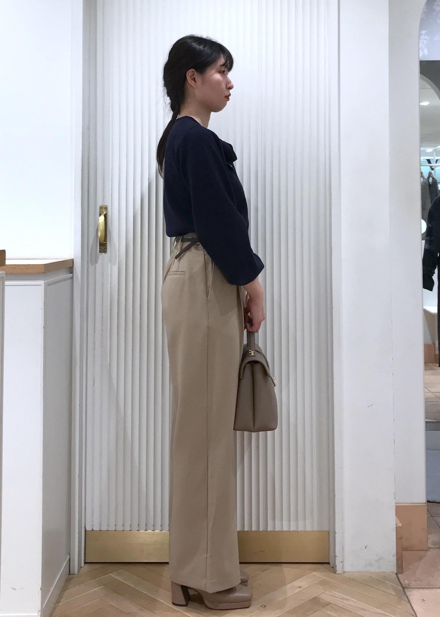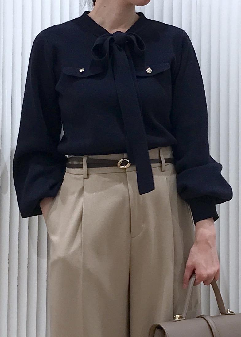 ネイビーのニットが可愛いトップスと美easyワイドパンツを合わせたキレイ目コーデです!