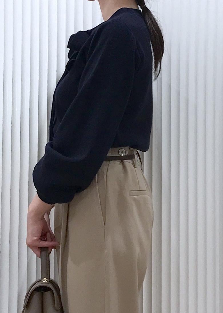 リボンニットは甘過ぎずコンパクト目な作りなので、ボトムはパンツでもスカートでもジャンパースカートのインナーにも、色々着回しが出来るトップスですよ。