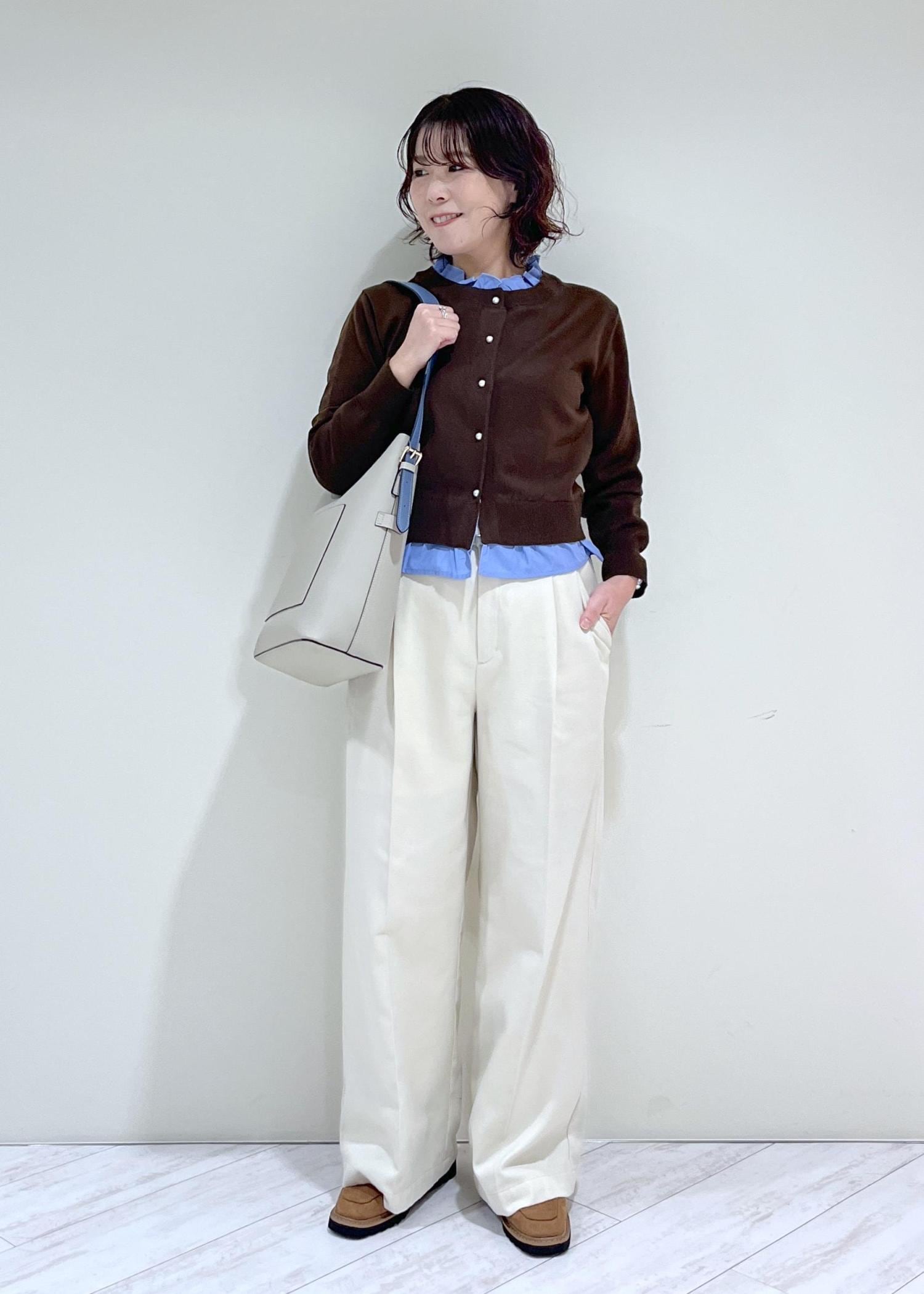 フリルシャツとニットカーデのドッキングニットに白のパンツを合わせて柔らかい印象に!