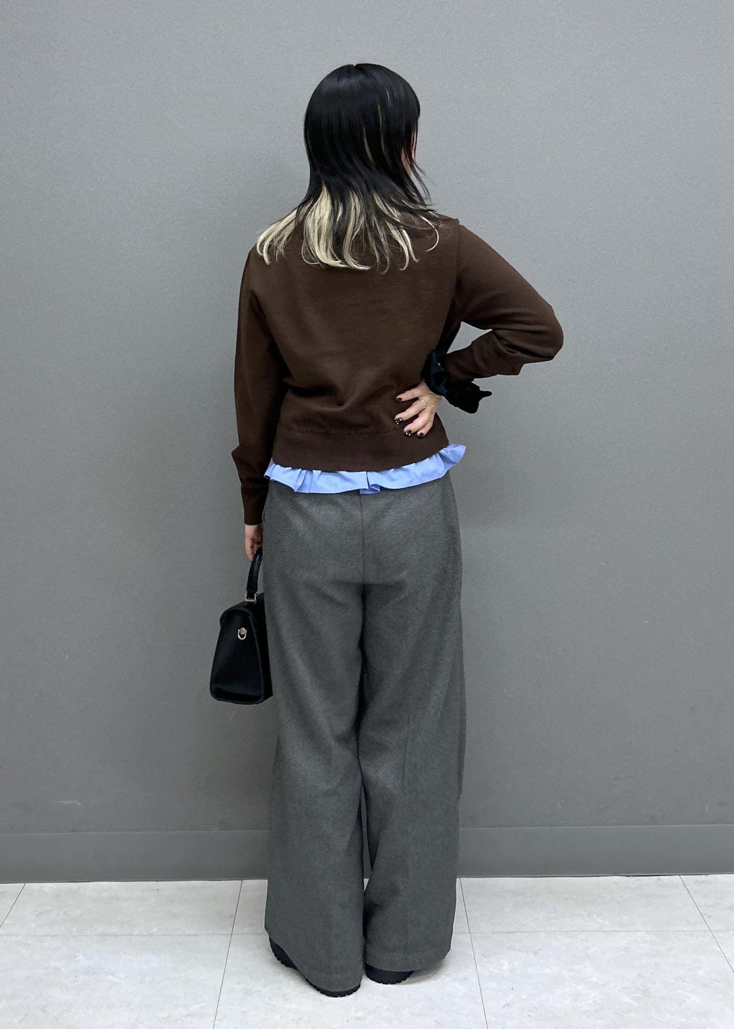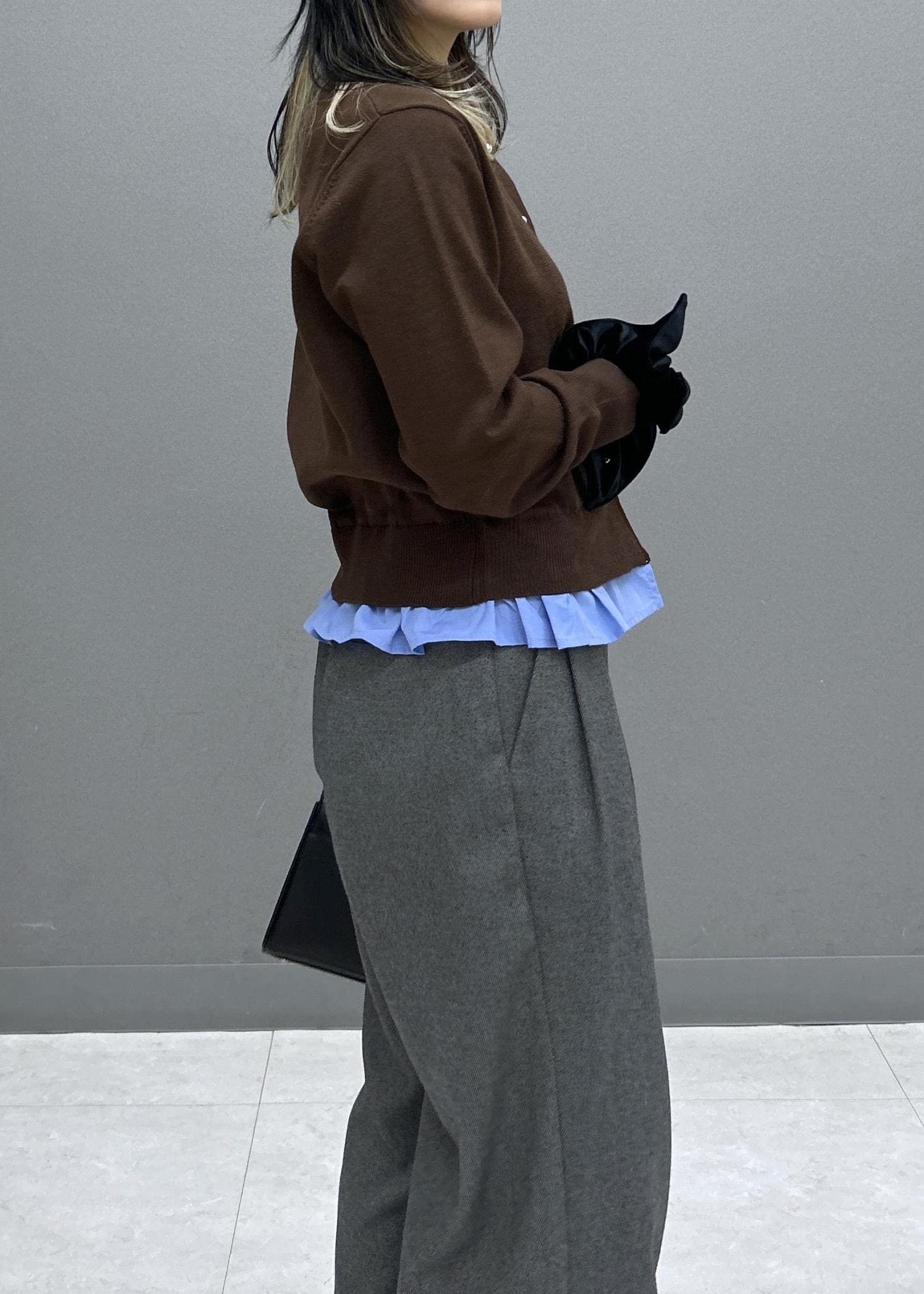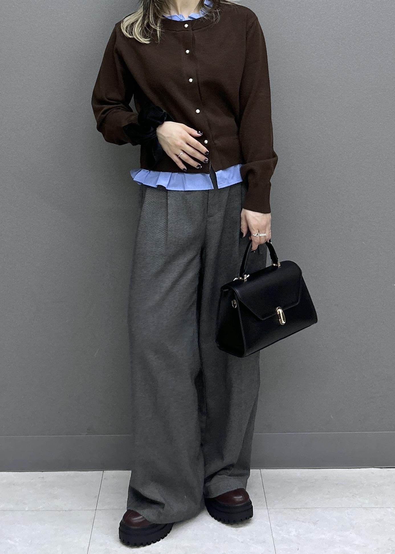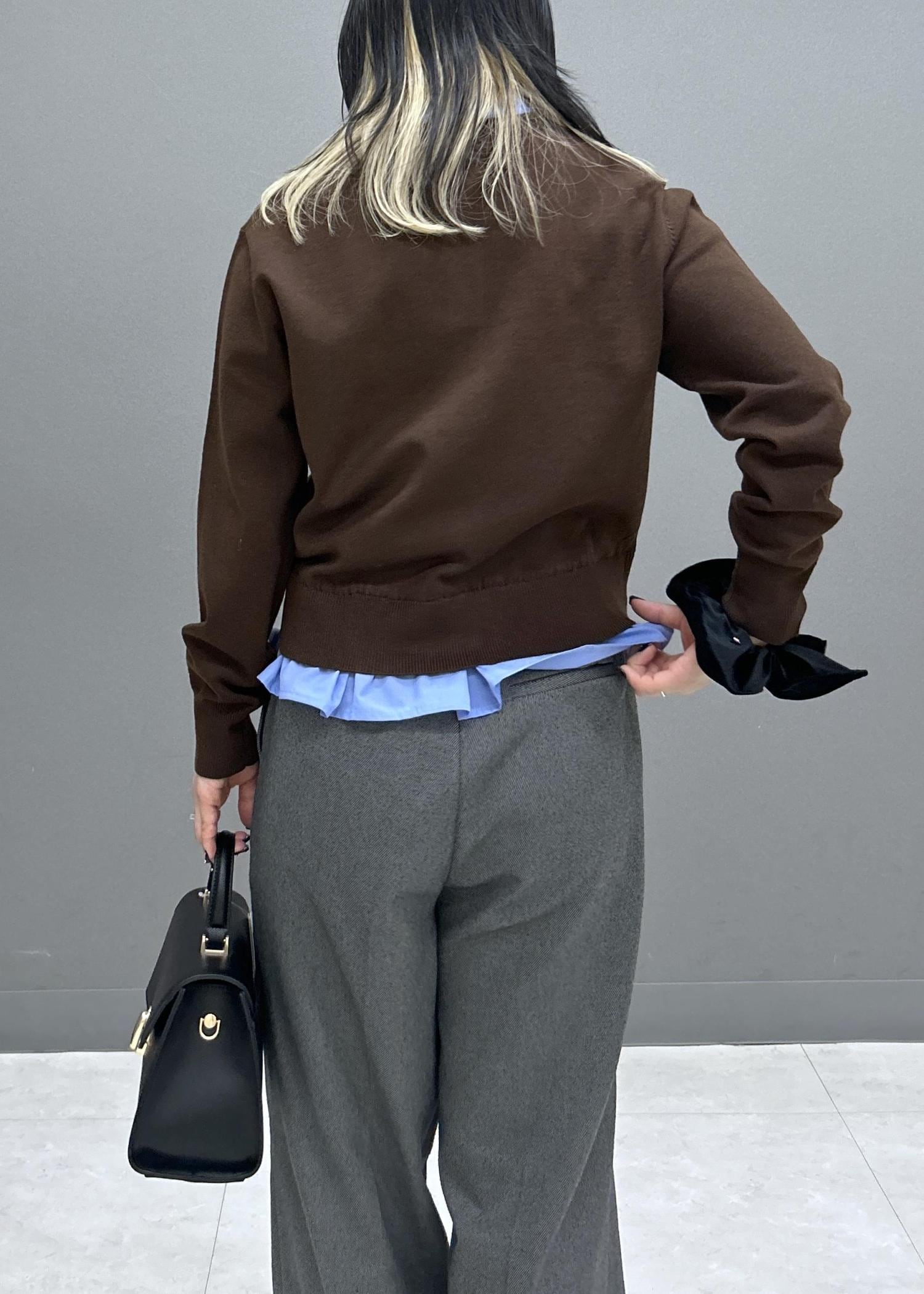 VIS【美得】フリル襟ドッキングニットカーディガントップスダークブラウン / F¥5,929レビュー157cmで、シャツの部分がお尻に少しかかるくらいの着丈でした。
