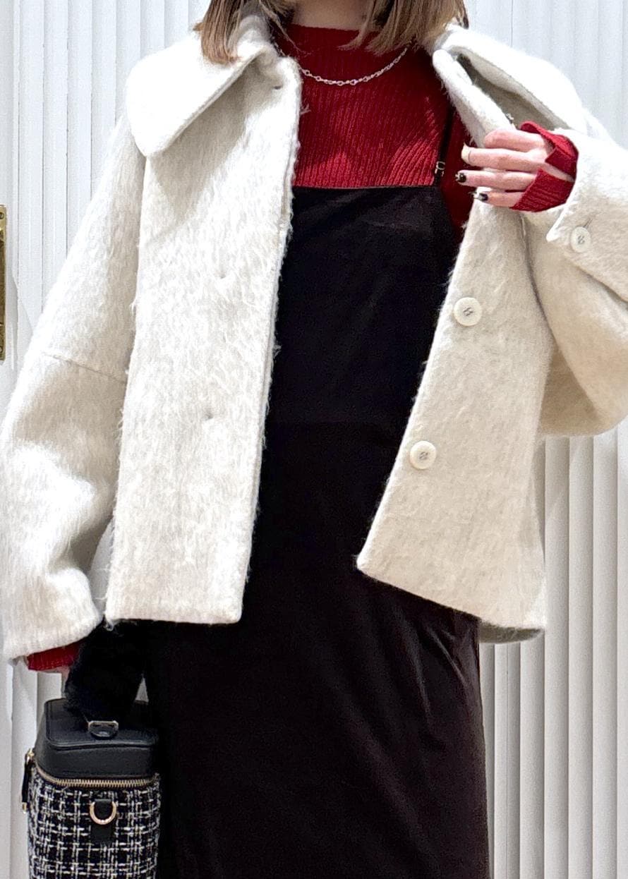 VIS【アウター総選挙1位】ビッグカラーモモンガシャギーショートコートオフホワイト / S¥10,989レビュー153センチS着用でヒップが隠れるくらいの着丈でした。シンプルなデザインではありますが襟が大きい事で目を惹き小顔効果もアップします!丸っとしたシルエットでゆとりもあるので厚手のニットを中に着てもごわつきが気になりませんでした。