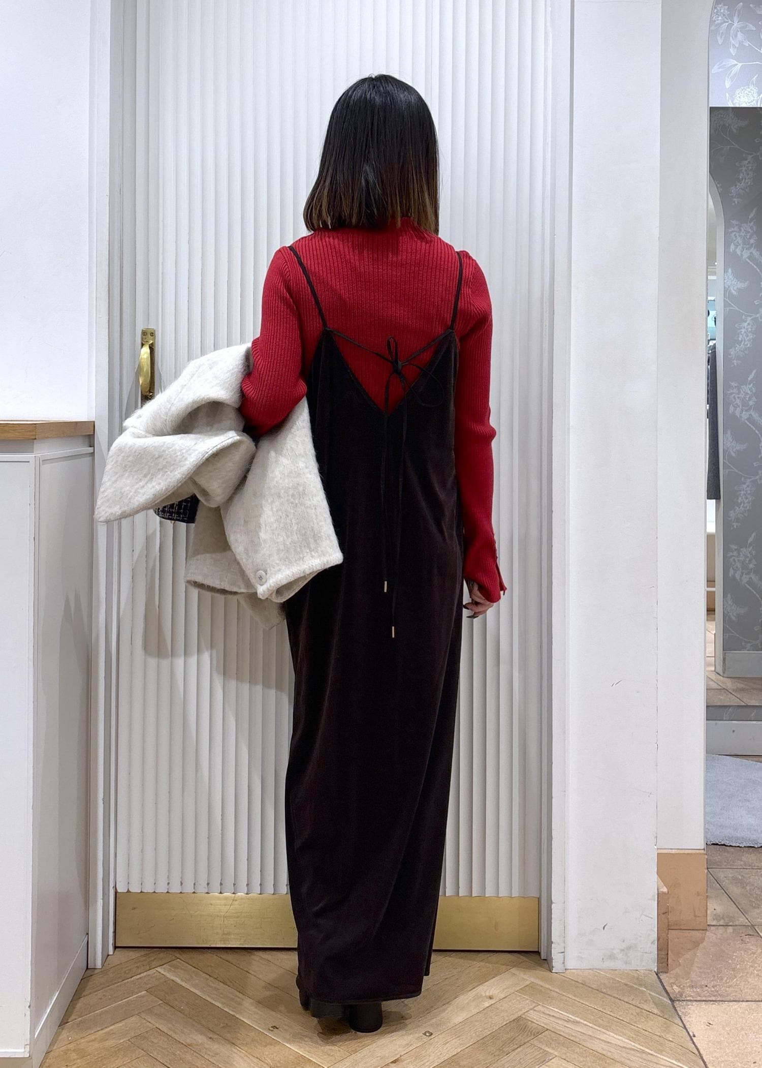 153㎝が着るベロアのワンピースを使ったコーディネートです!足首くらいまで長さがあるのでヒールで高さを出すことで足元がすっきりして見えやすいです!赤を差し色に入れることでコーディネートが華やかになり冬らしさもかなり出ます!ワンピースをブラウンにすることで柔らかい雰囲気がでるので他のアイテムを黒にして締めると◎