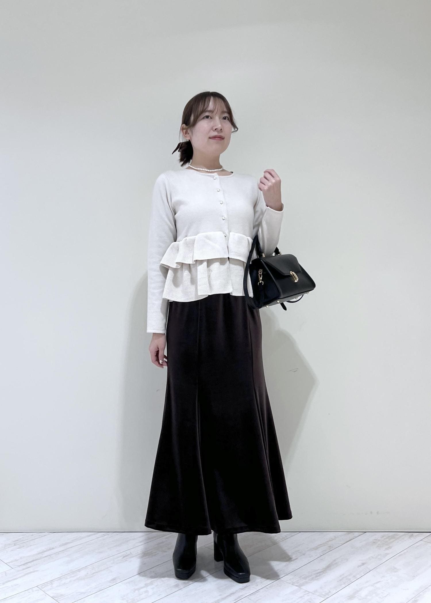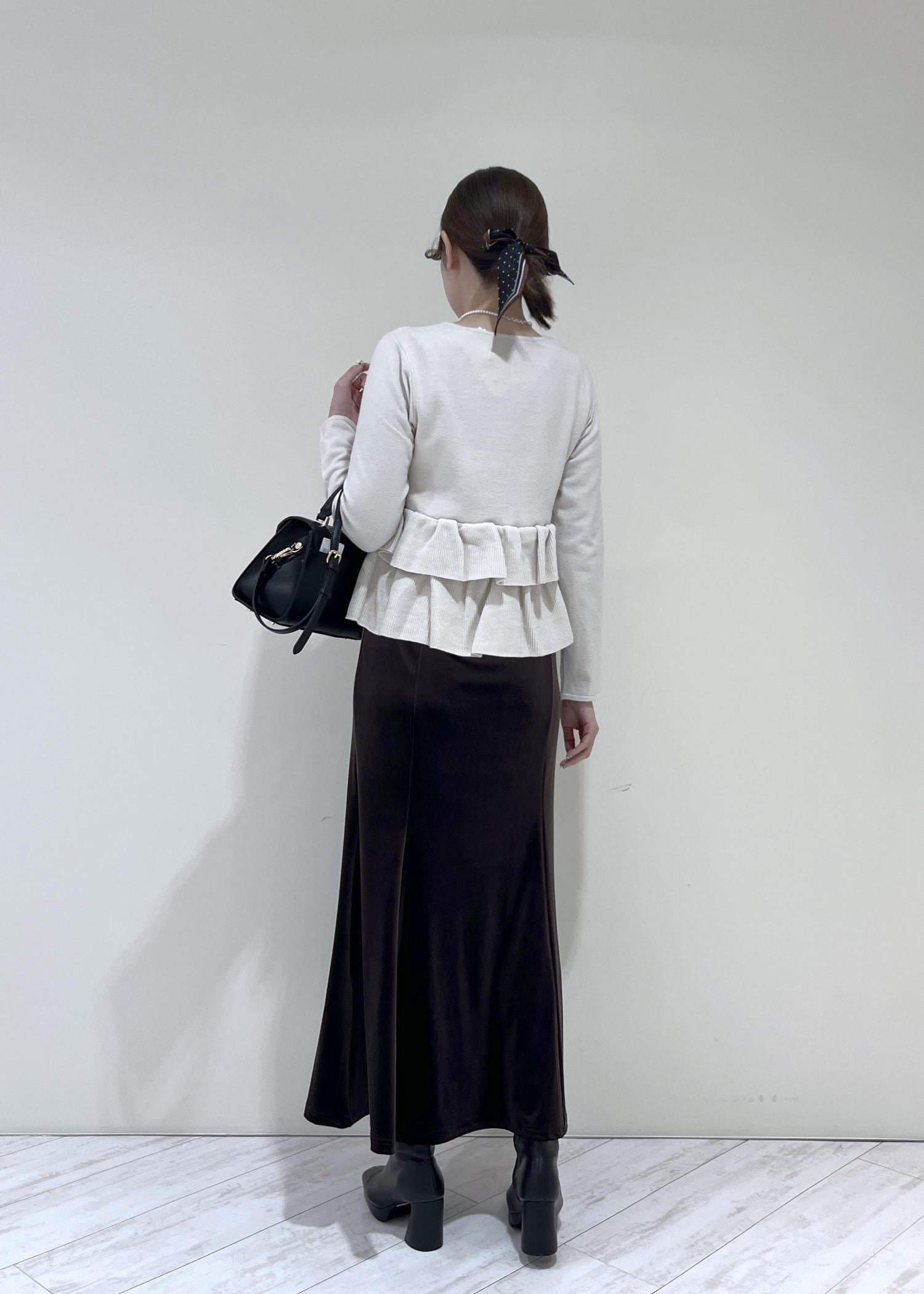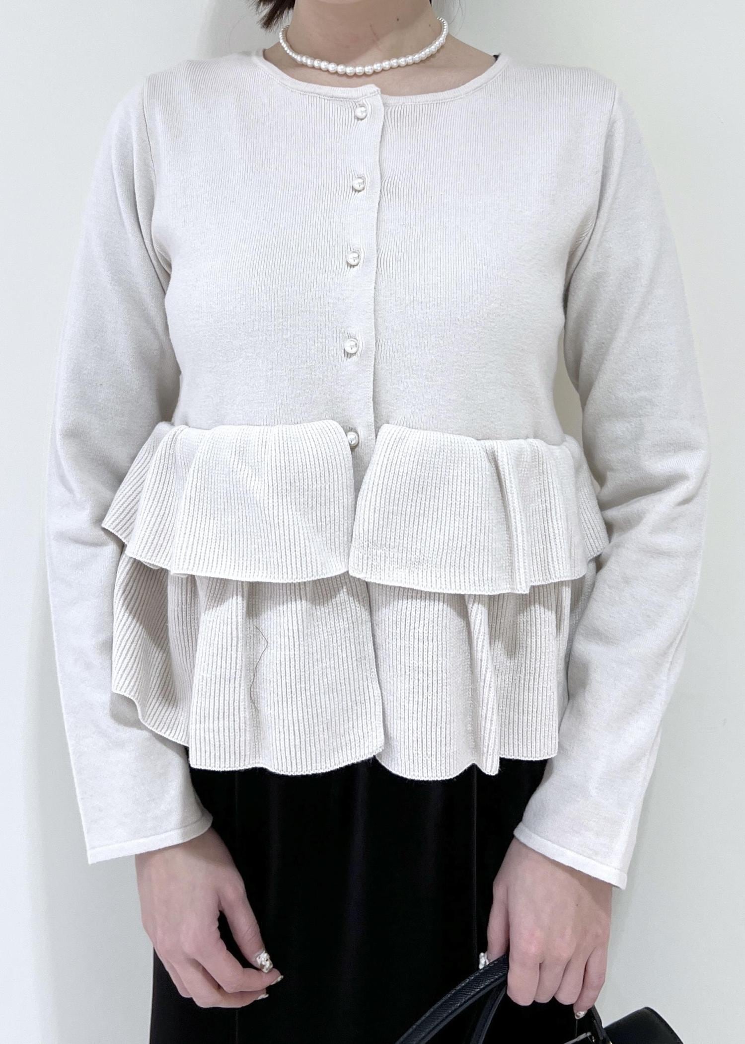VISティアードペプラムニットカーディガンベージュ / F¥6,589レビューカーディガンとしても一枚着としても着回せるデザインです!着丈は腰にかかるくらいで、サイズ感は程よくゆったり着られるのでインナーにハイネック等を合わせても◎