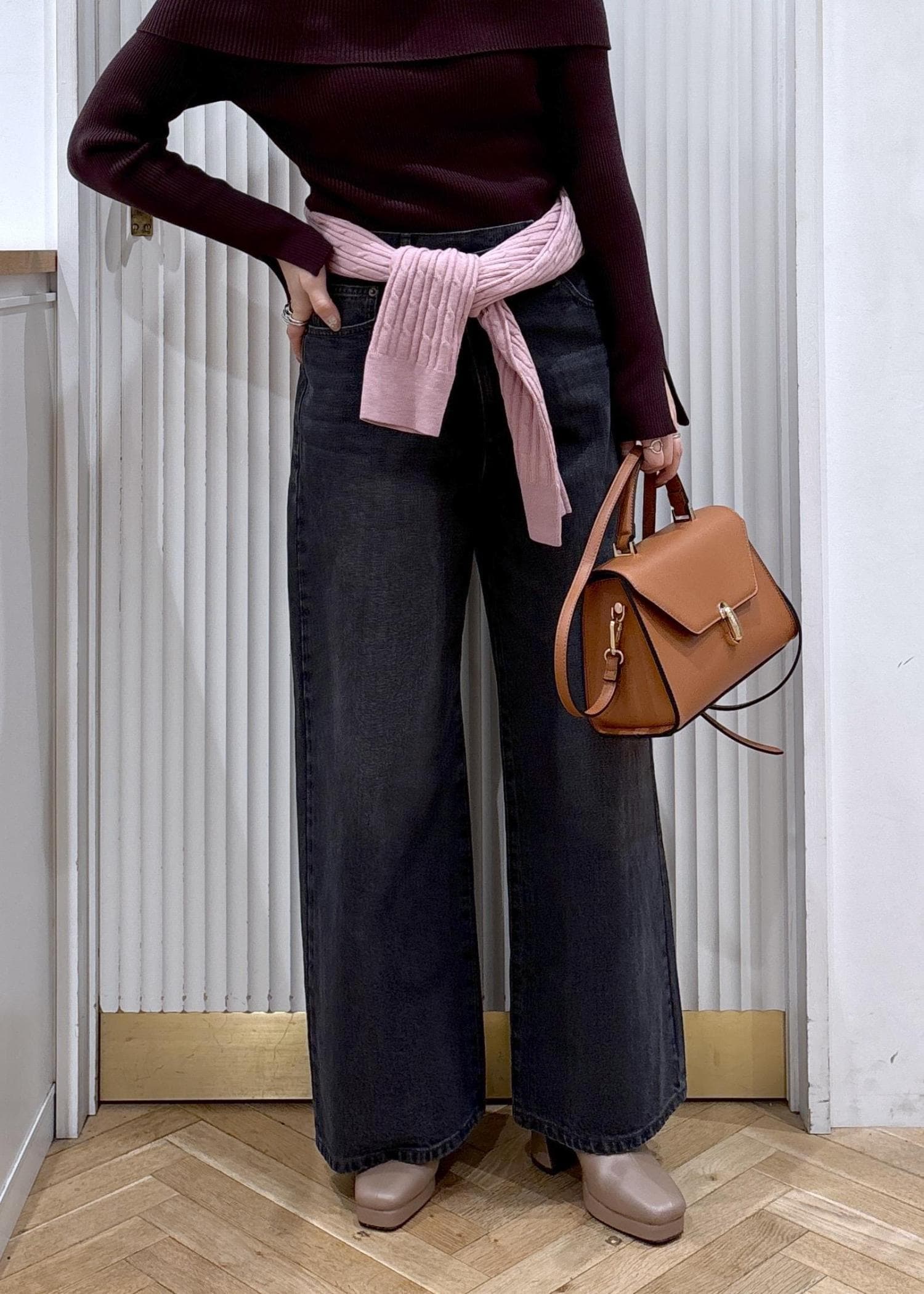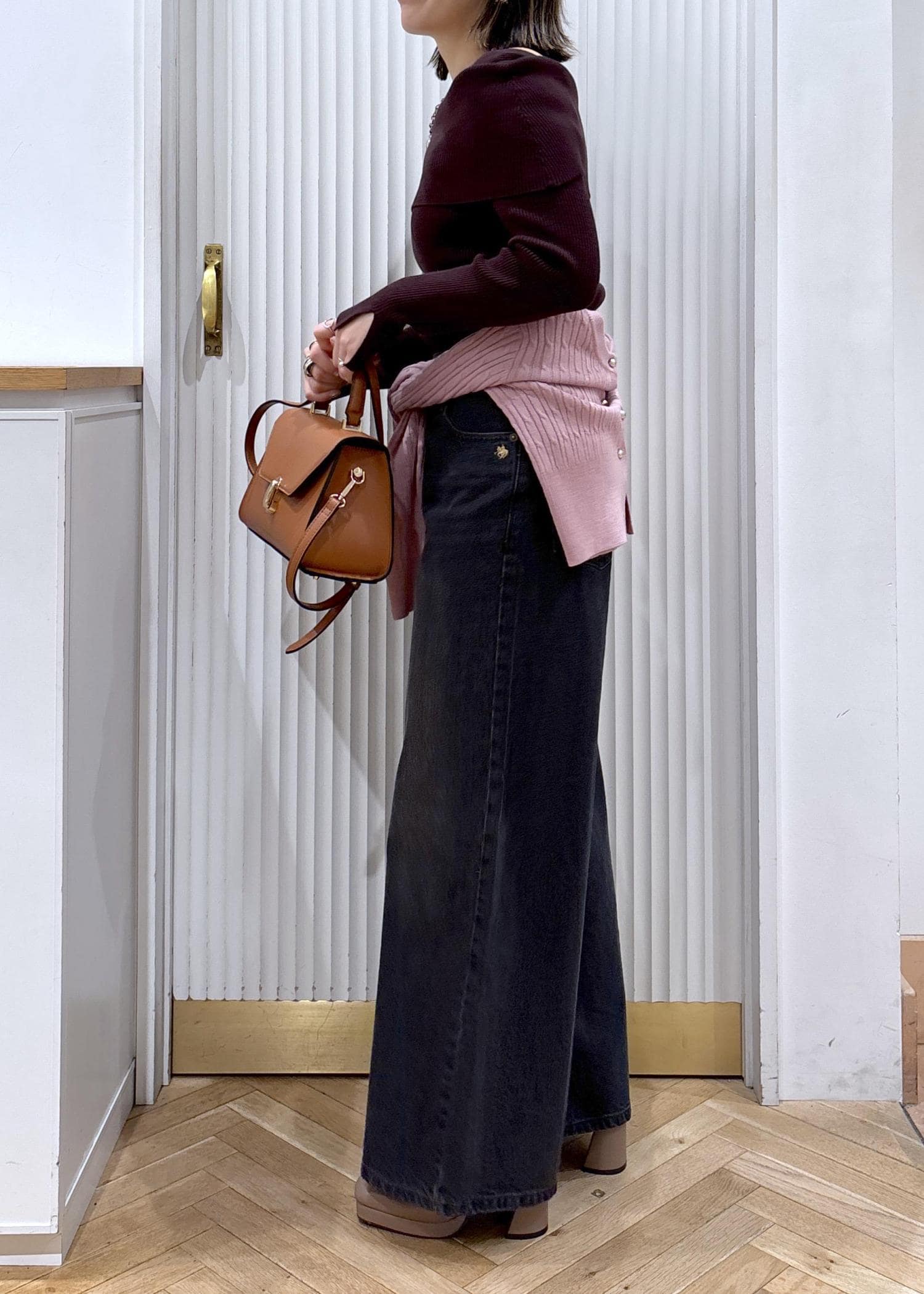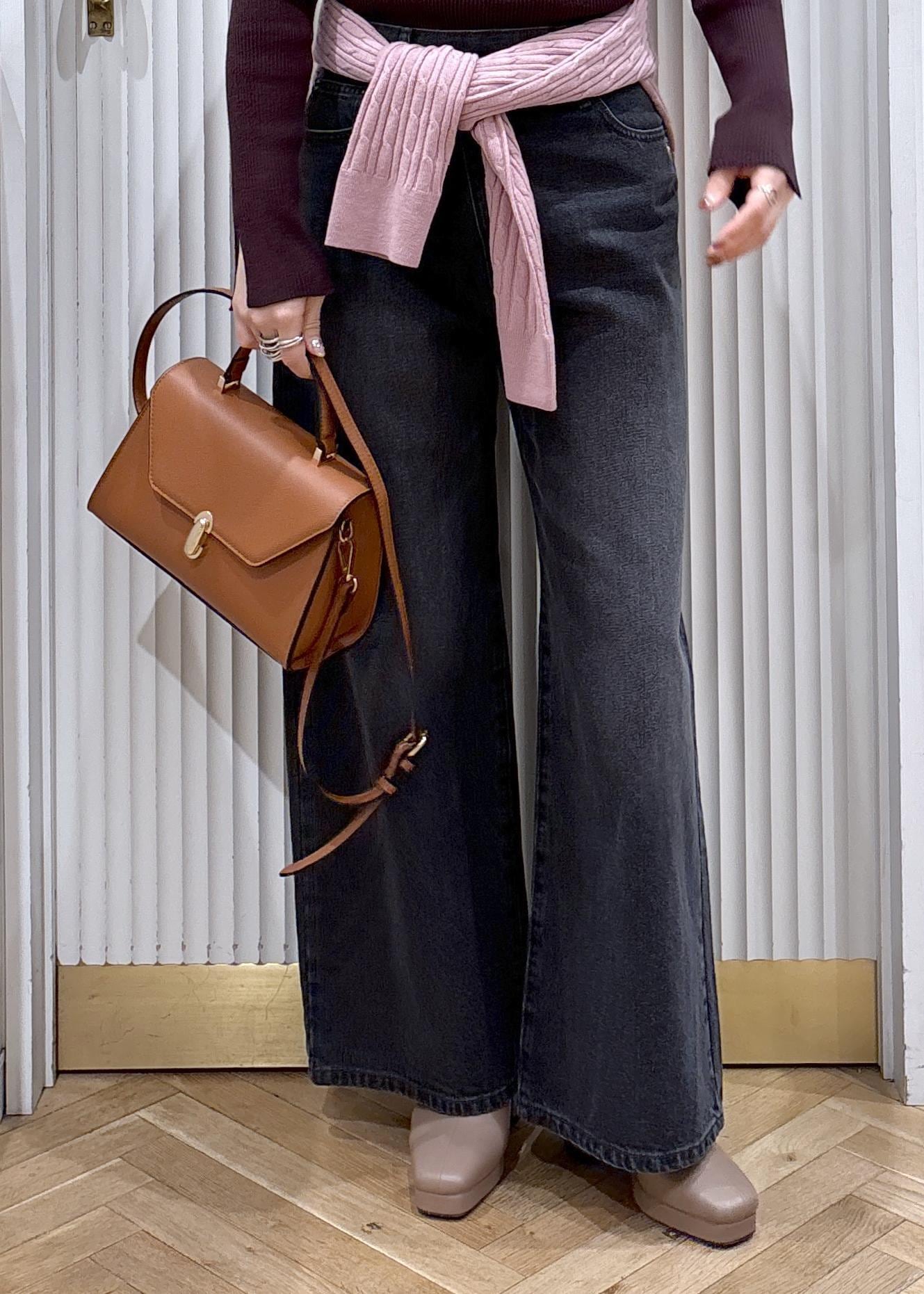 ワイドデニムはフィット感のあるトップスと好バランスです♫デニムとリブニットでラフに合わせた日はバッグとシューズを少しキレイめに♡がポイント♡
