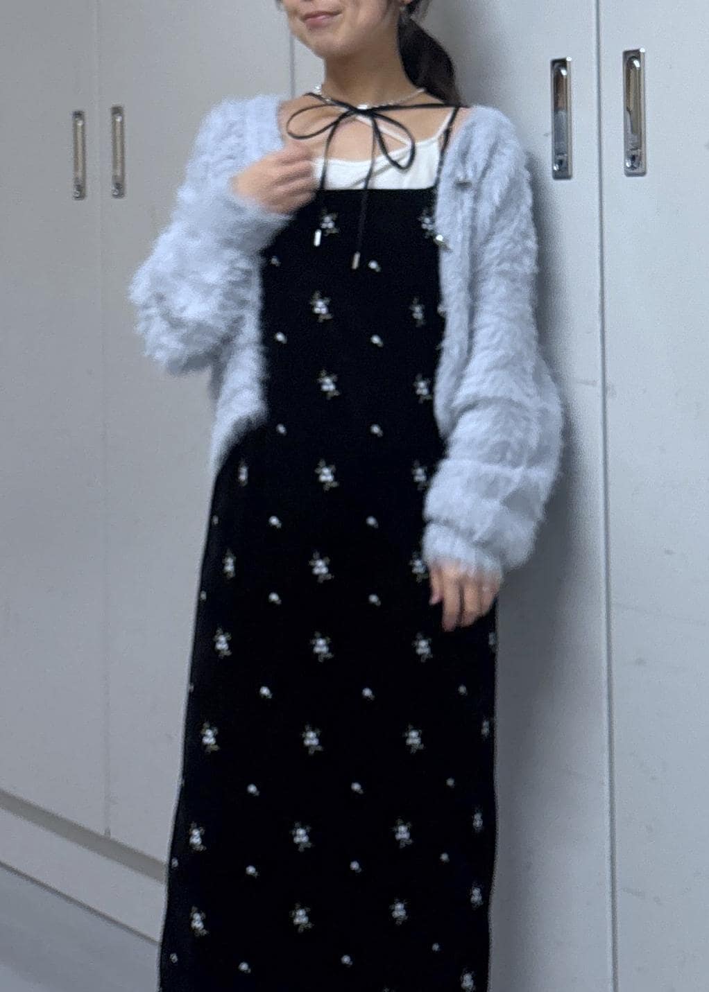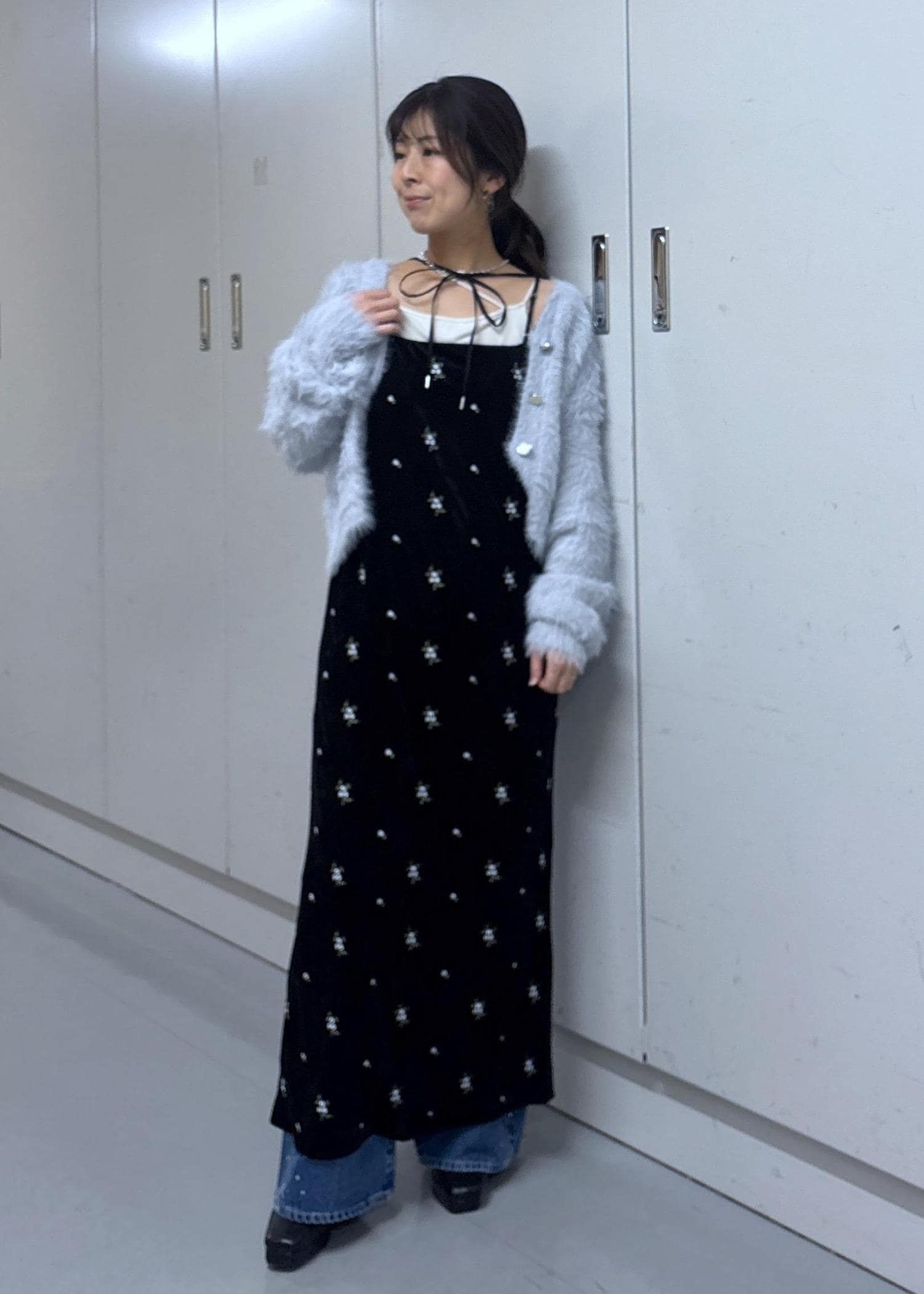 VIS刺繍アソートベロアキャミワンピース/2WAYブラック系 / F¥8,899レビュー156cm/F着用。肩紐を程よく調節して、着丈は足首くらいの長さです。前後両前で着られるキャミワンピは身幅がスッキリめでIライン寄りのシルエットが綺麗です‼︎ベロア素材なのでインナー次第ではパーティーシーンにも◎