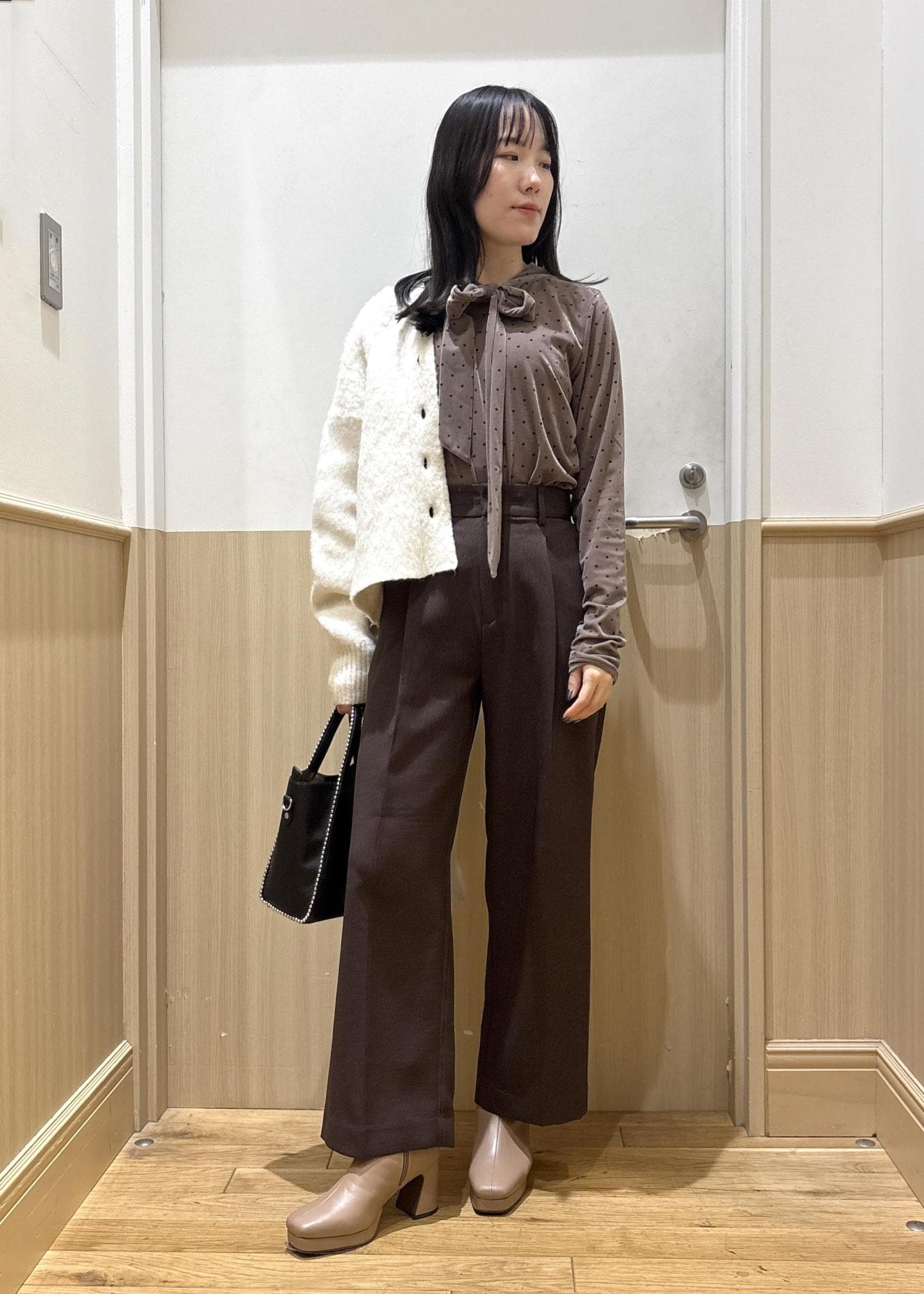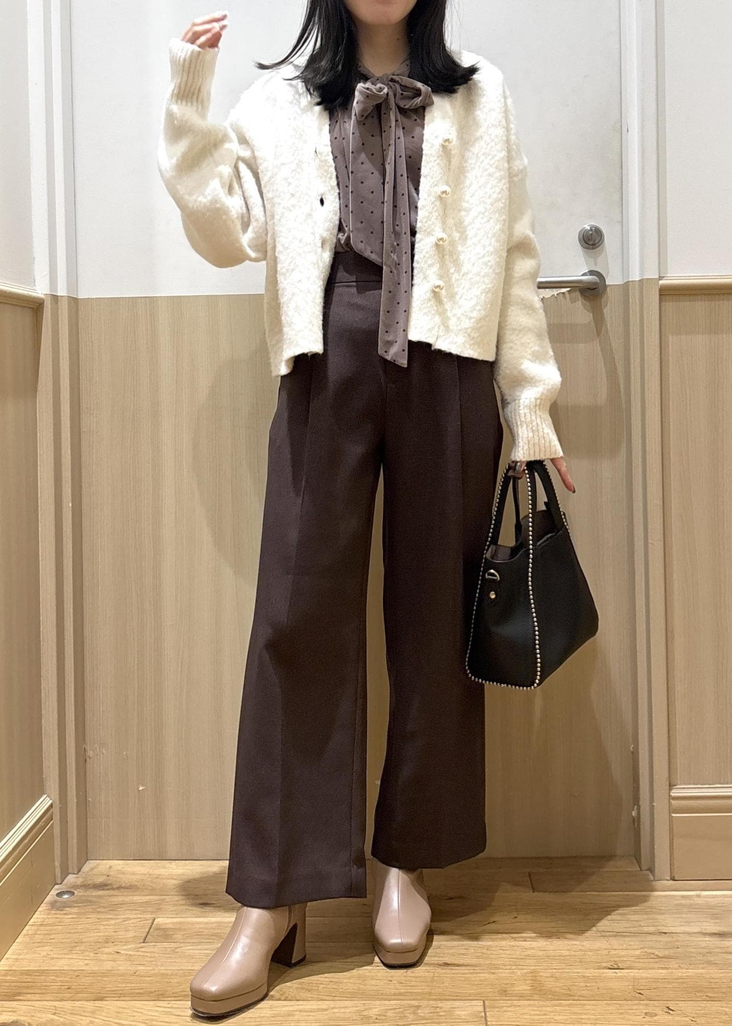 VISベロアボウタイドットカットソーベージュ系 / F¥4,389レビューノーカラーのボウタイですっきりした印象で着用できるので、カーデなどとレイヤードしやすいです◎